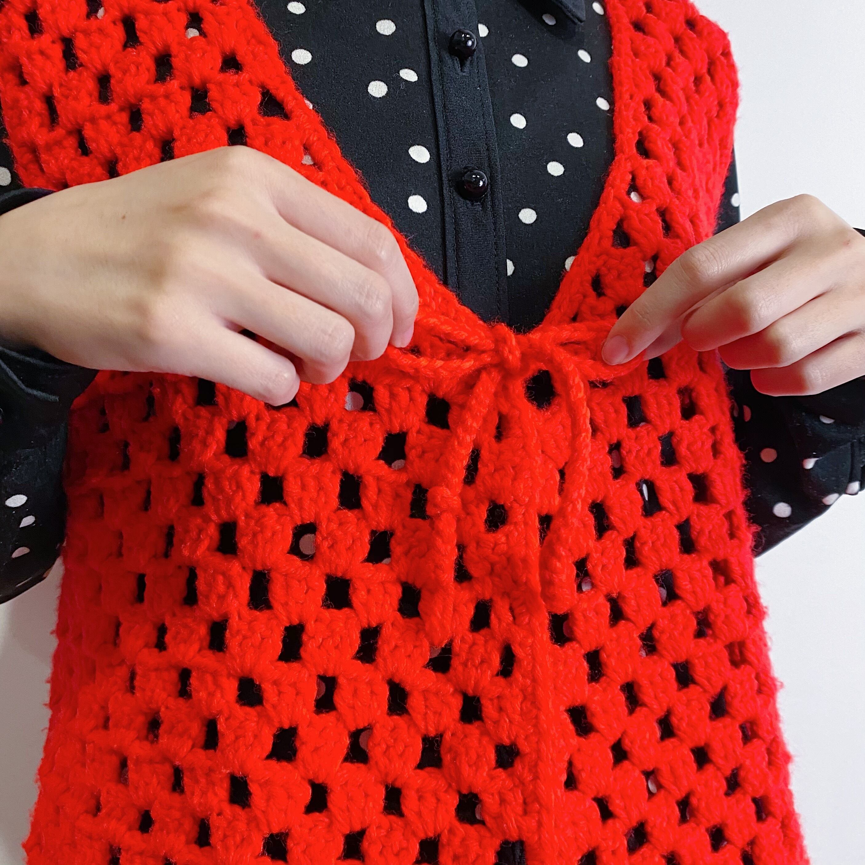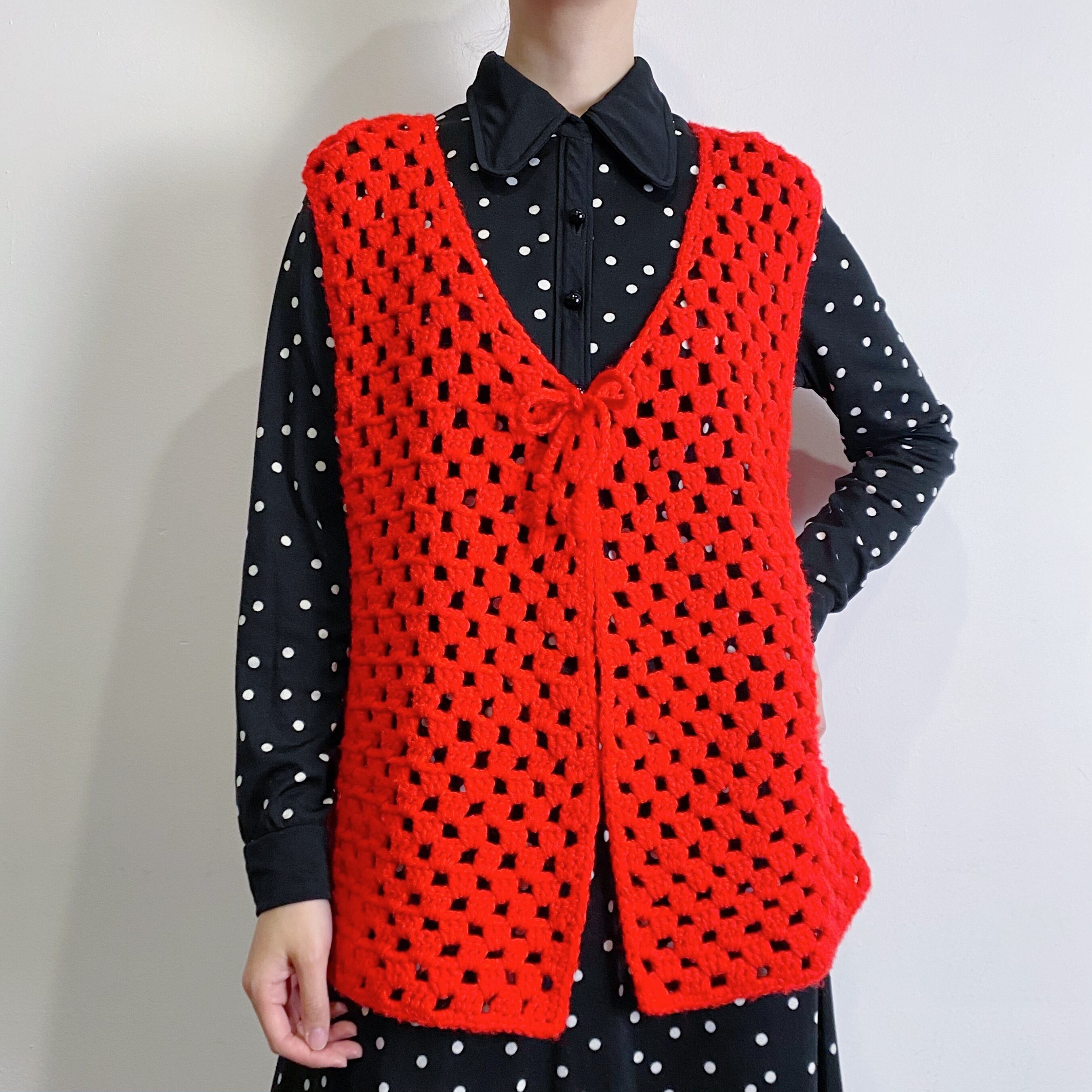 発色のいい綺麗な赤がかわいい、70年代の手編みのニットベストです。