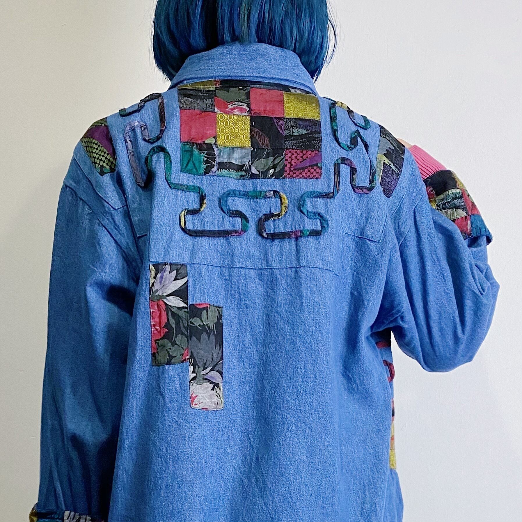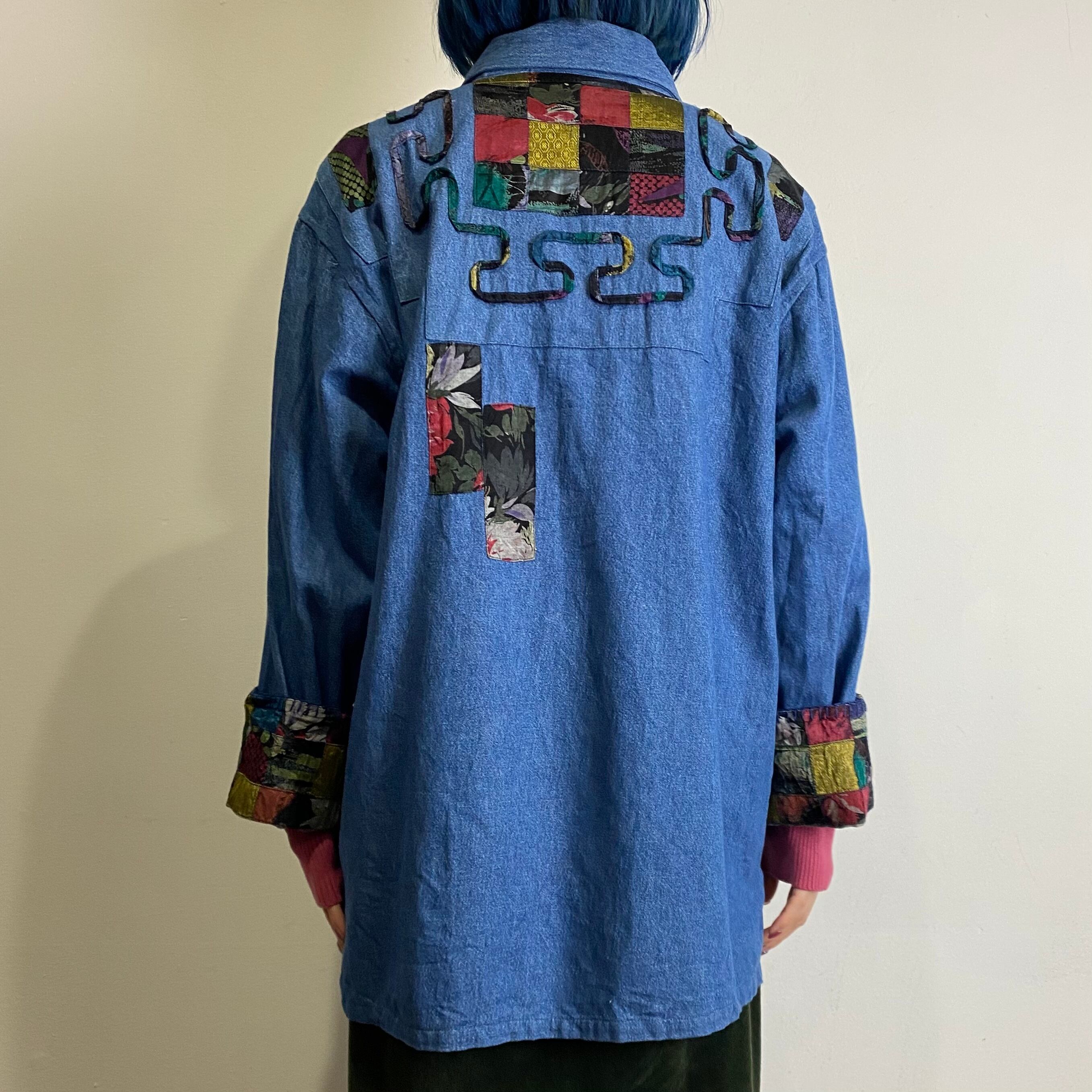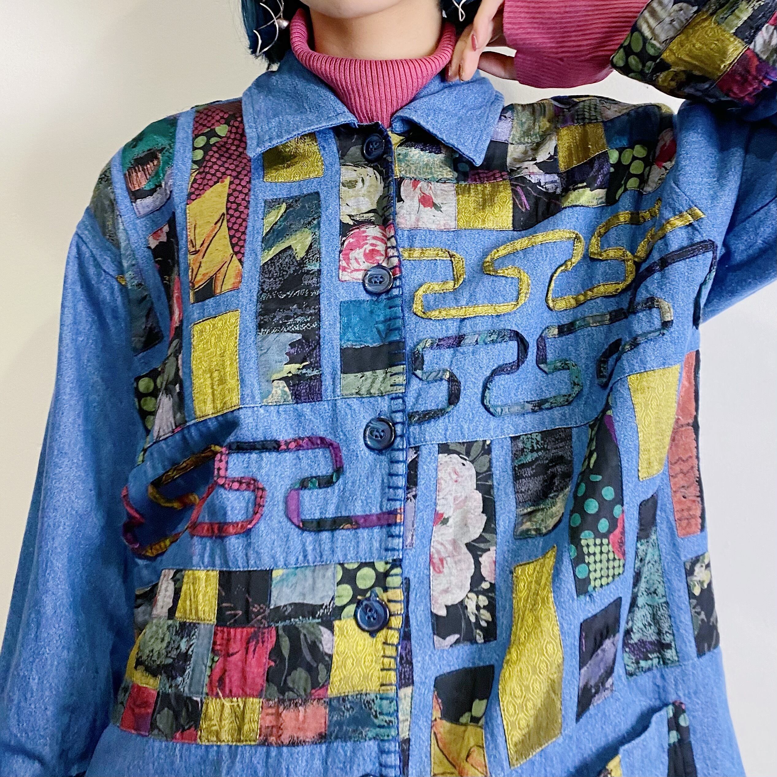 花柄やドット柄、うねうねとしたデザインのパッチワークなど凝った装飾が可愛い、薄手のデニムシャツジャケットです。