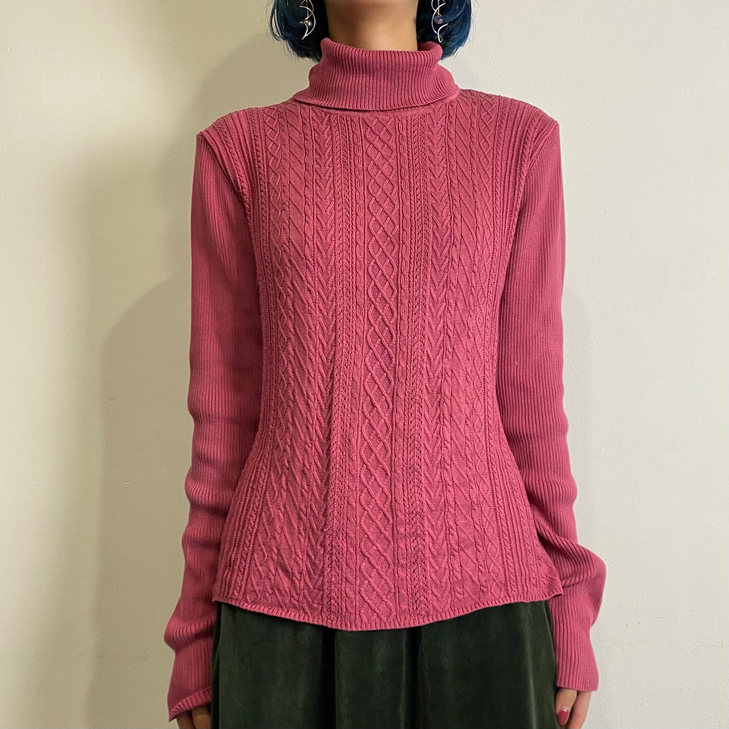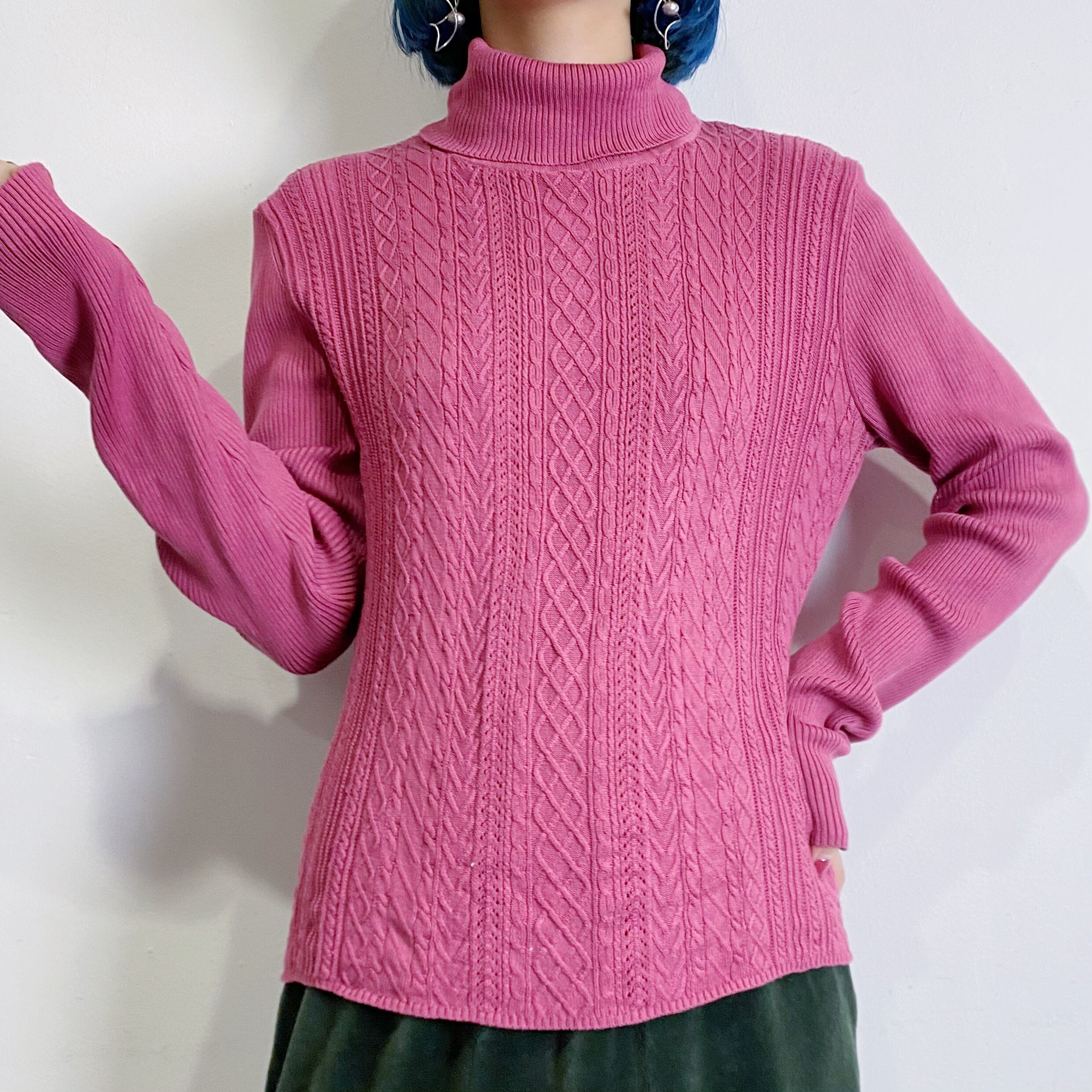 シルク素材が上質で可愛い、ピンクカラーのハイネックトップスです。