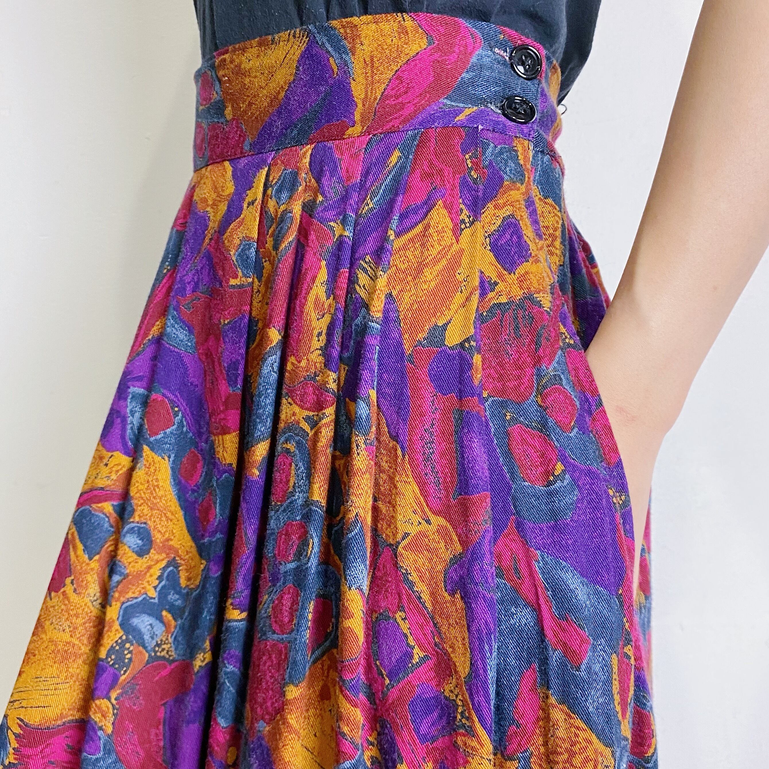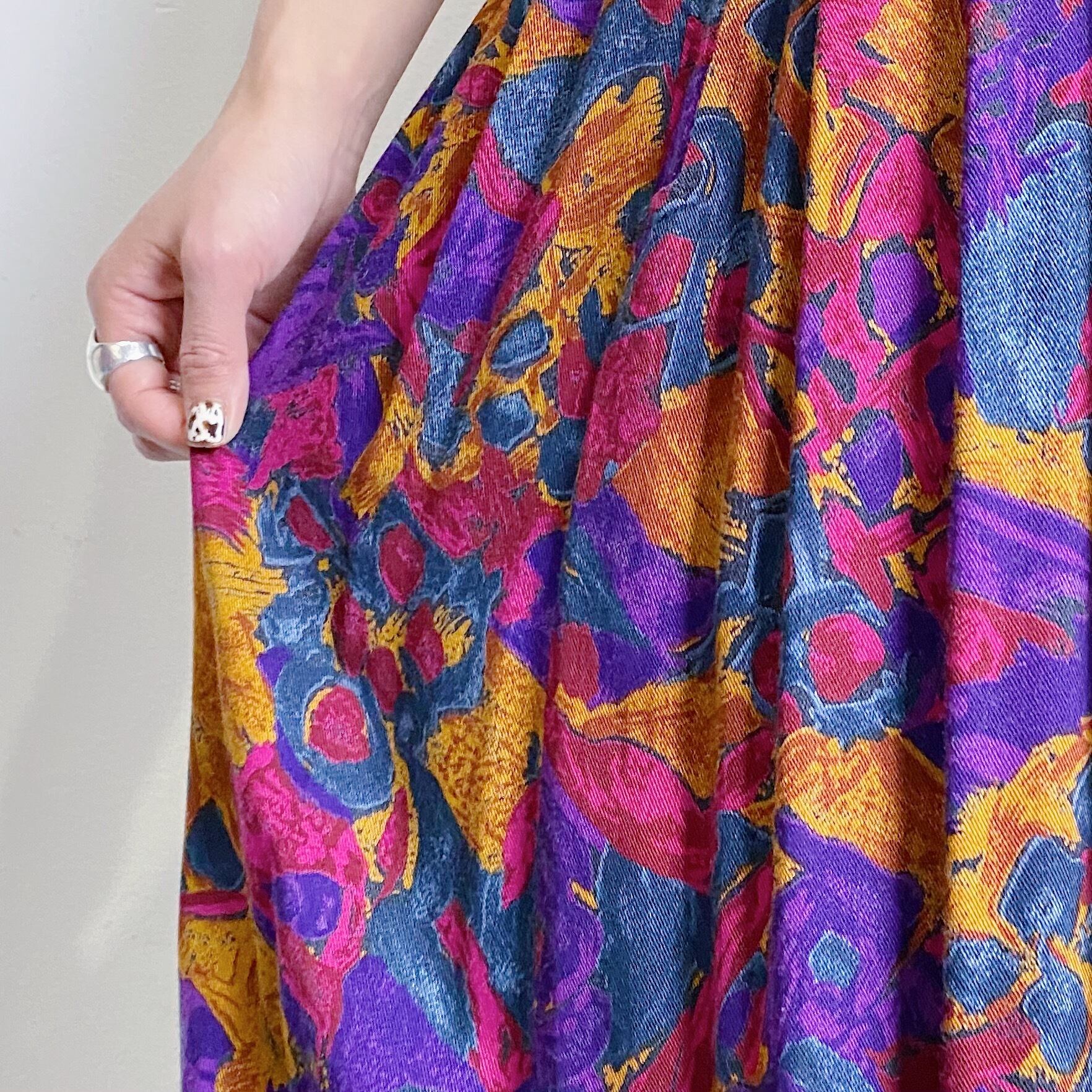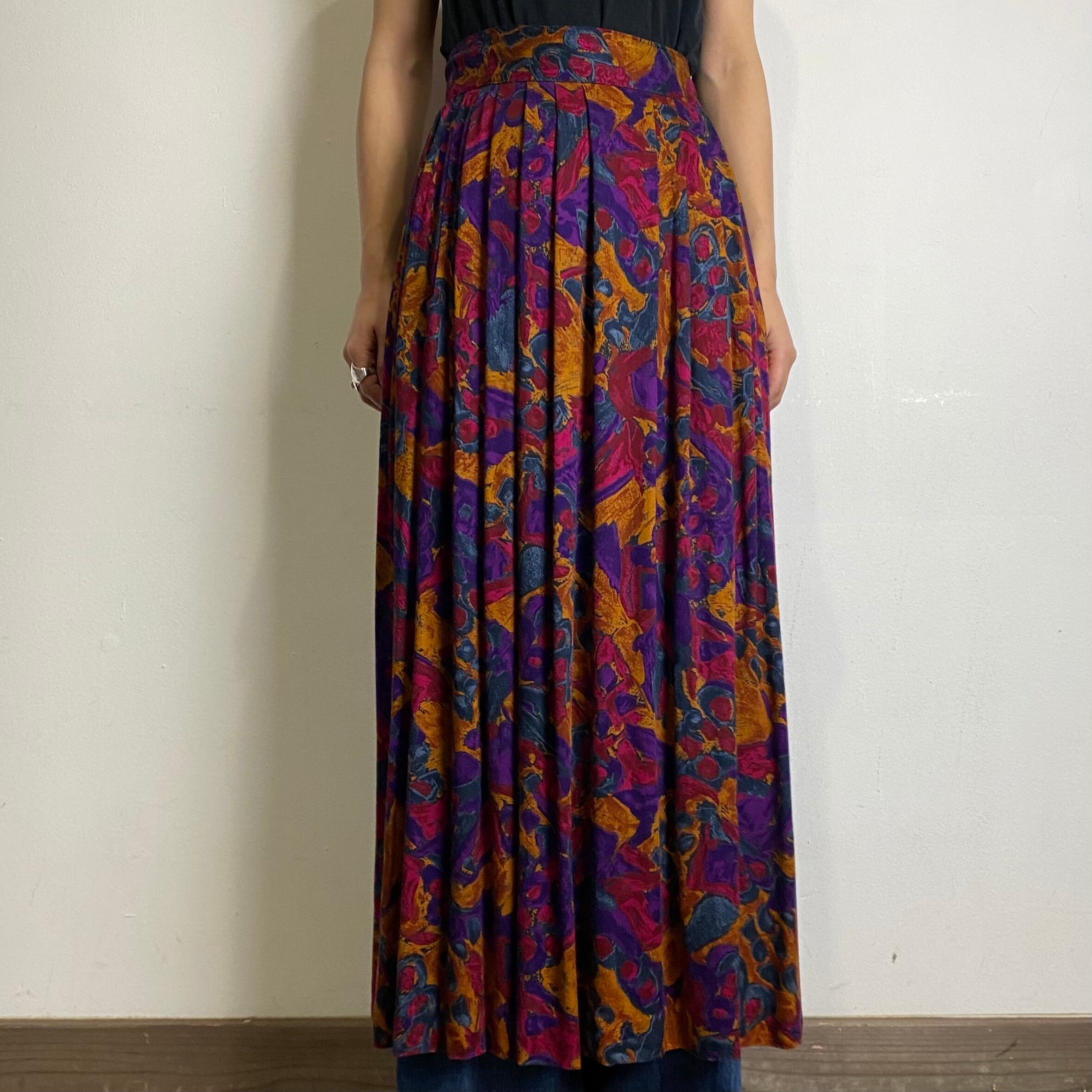 絵具を水に混ぜたような、ピンクやパープルの不思議なテキスタイルが可愛いレーヨンスカートです。