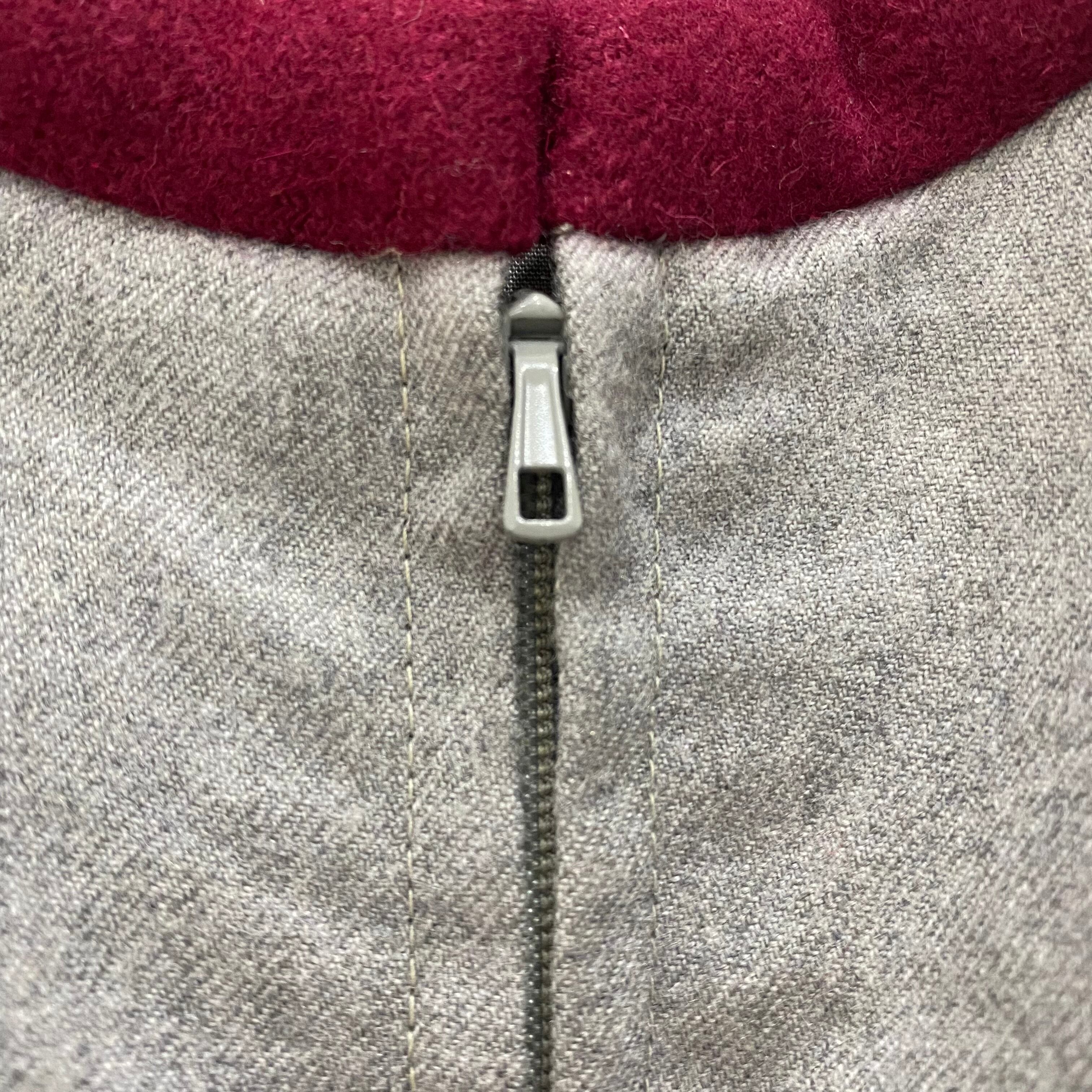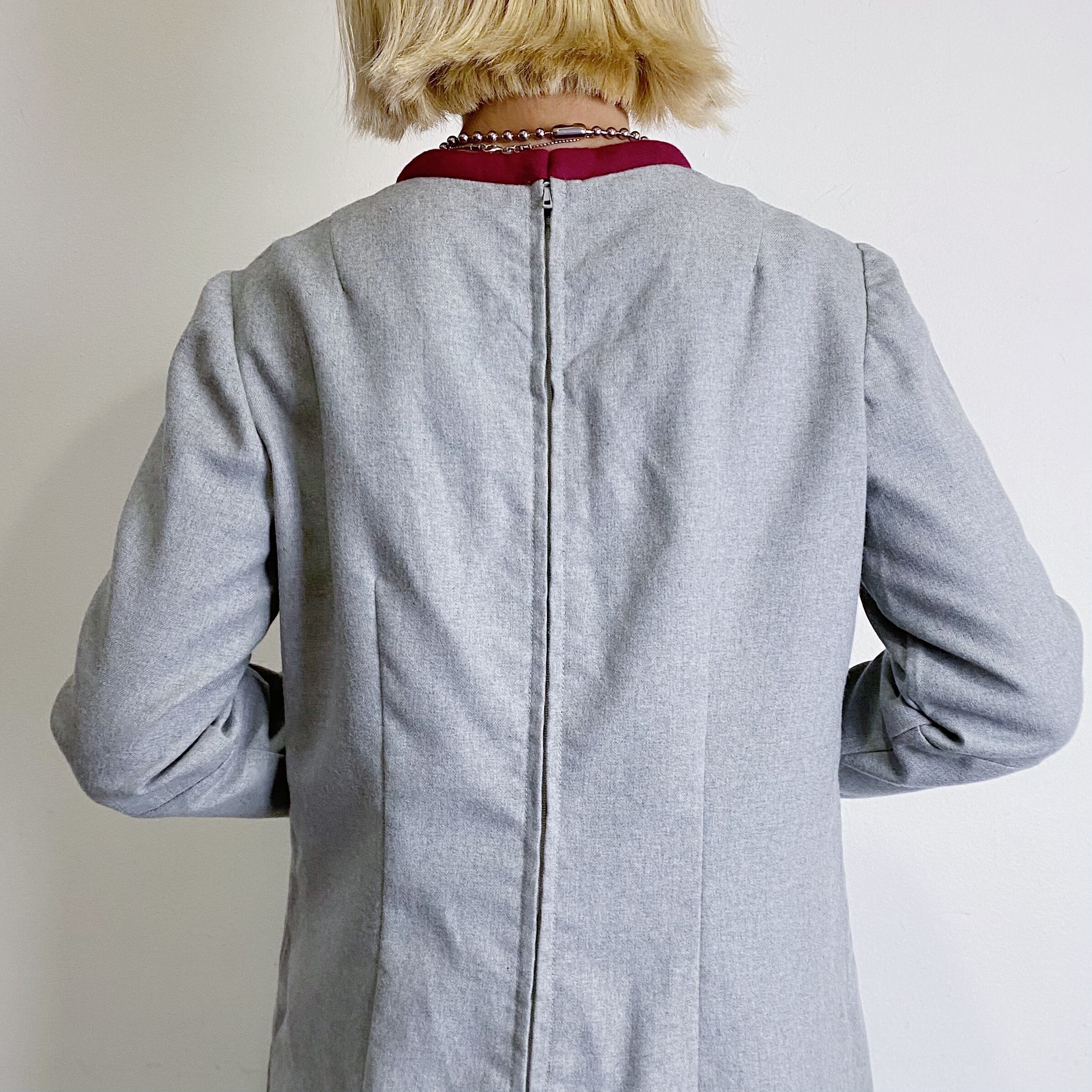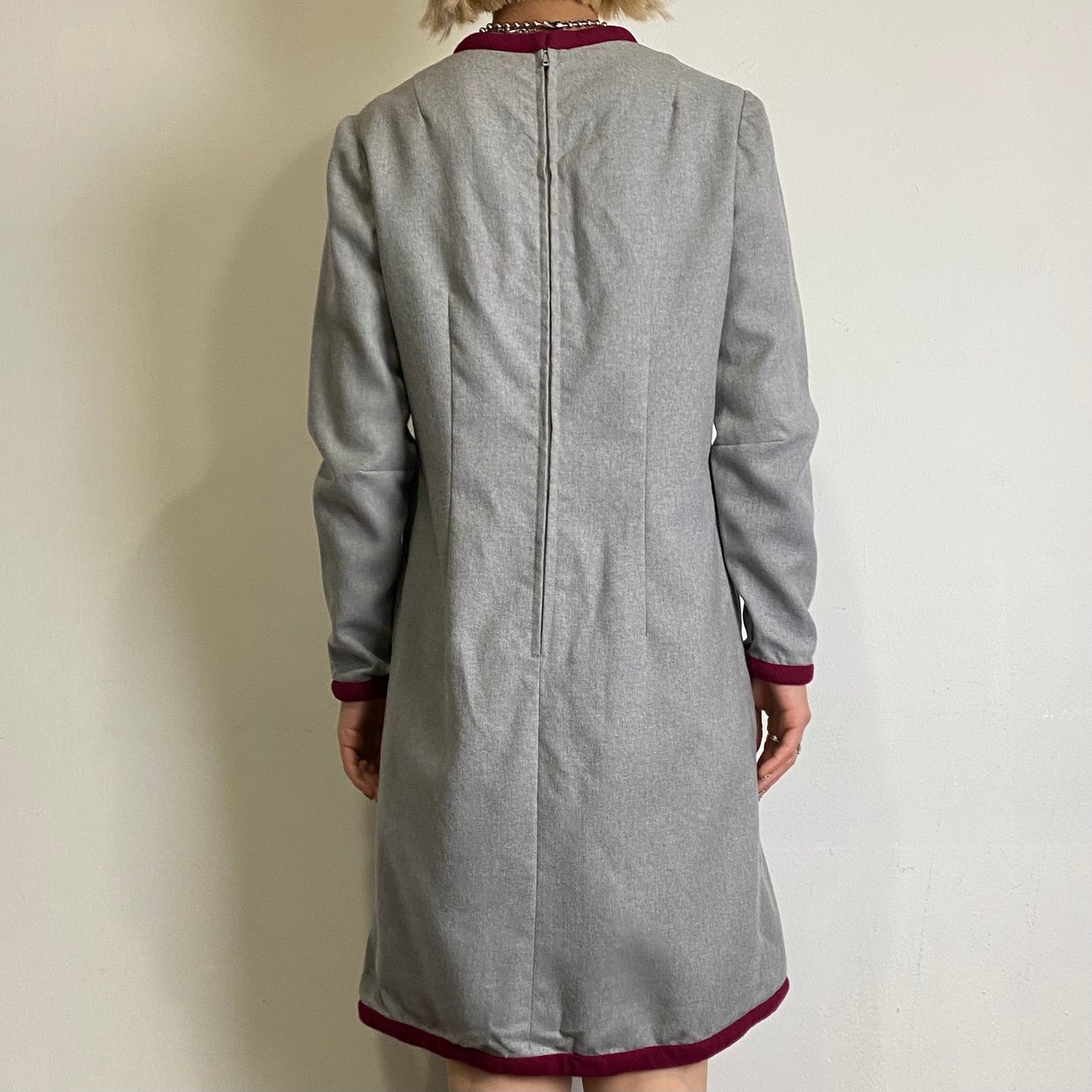 グレー地にボルドーの縁取りがかわいい、70年代のウールワンピースです。