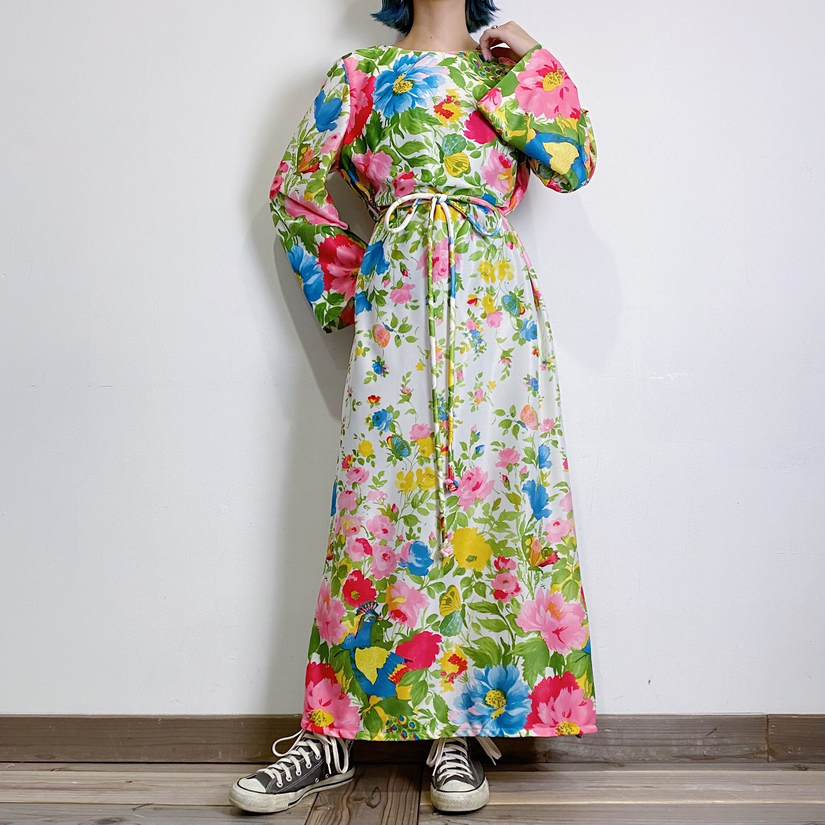 白ベースにカラフルな花や蝶の柄が可愛い70年代のワンピースです。