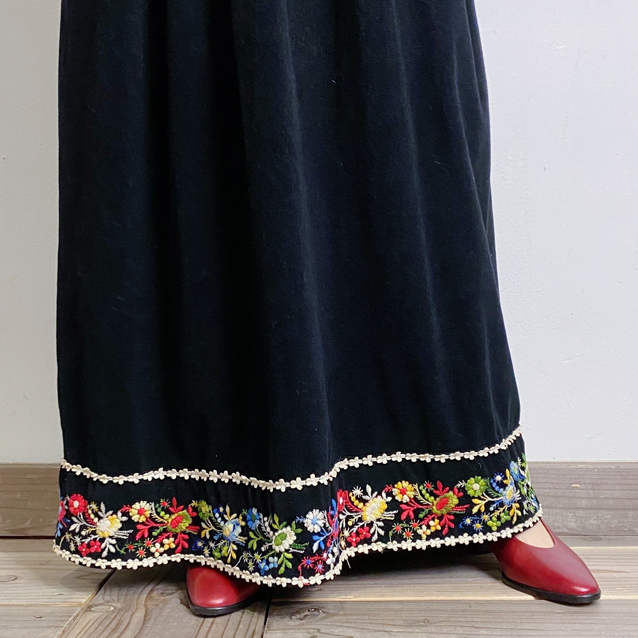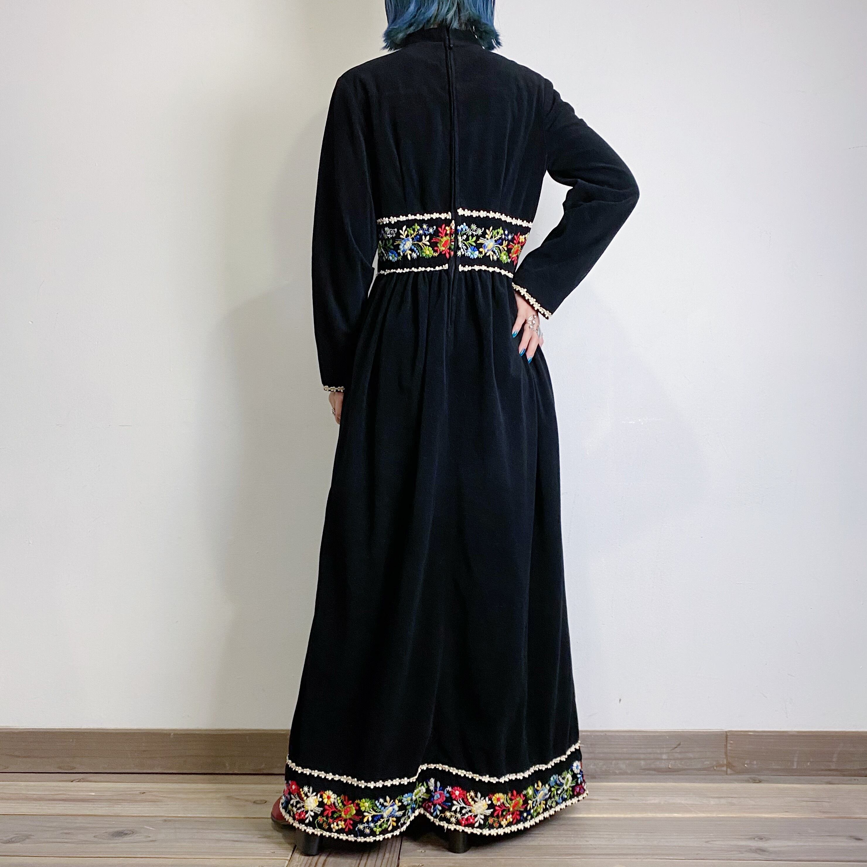 黒ベロアにウエストと裾の刺繍が可愛い70年代のワンピースです。
