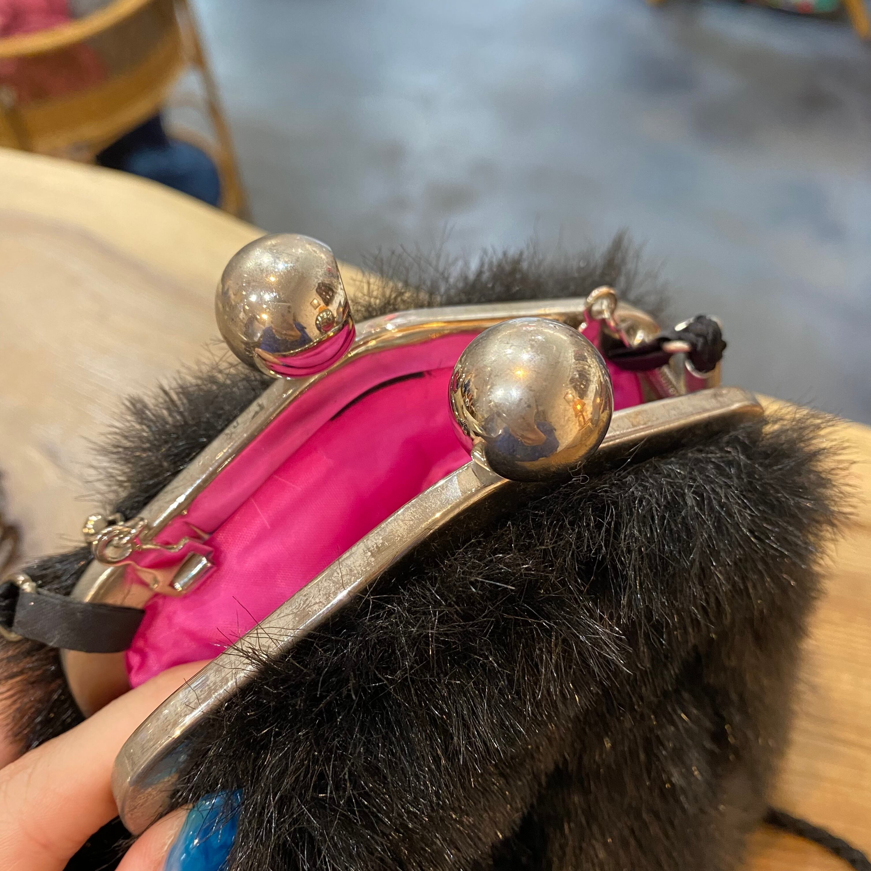 ブラックベースのエコファーが可愛い、小さめのがま口バッグです。