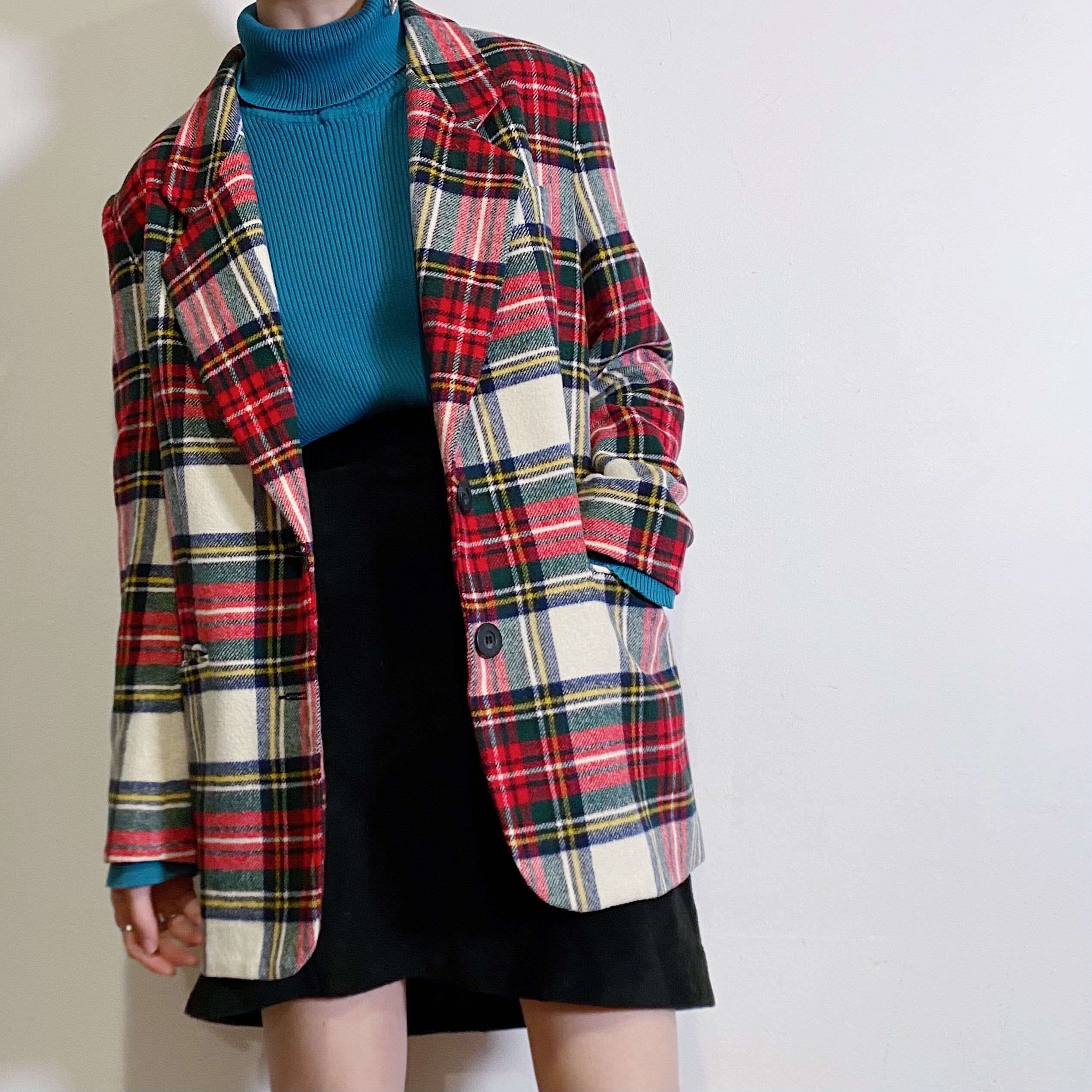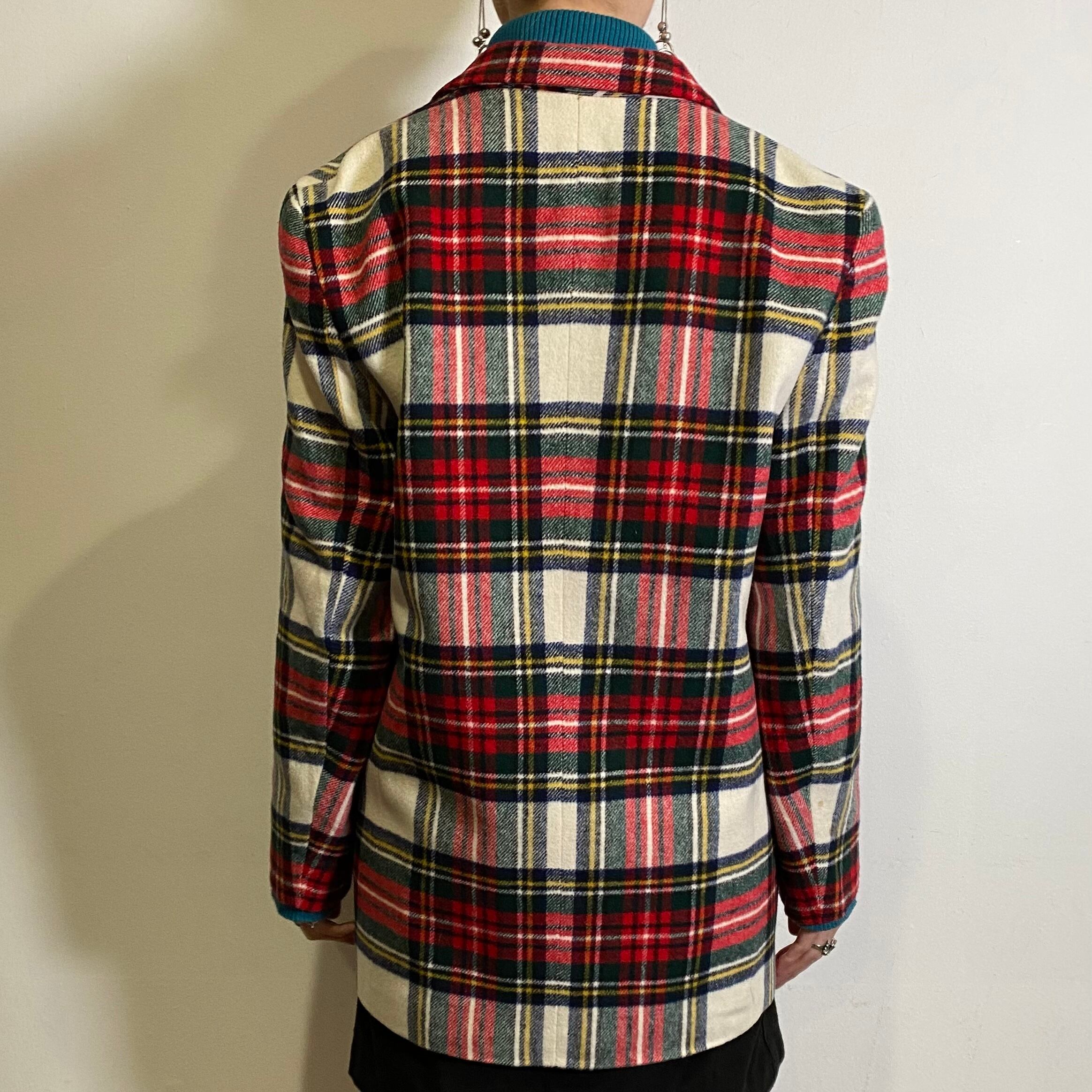 赤、白、黄色などのハッピーな色合いが魅力的なタータンチェックのウールジャケットです。