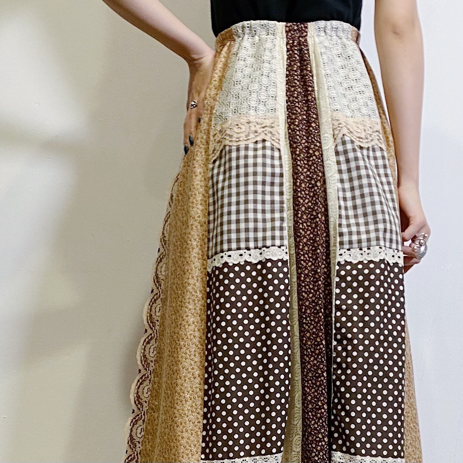 ブラウンカラーのパッチワークが可愛い、70年代のロングスカートです。