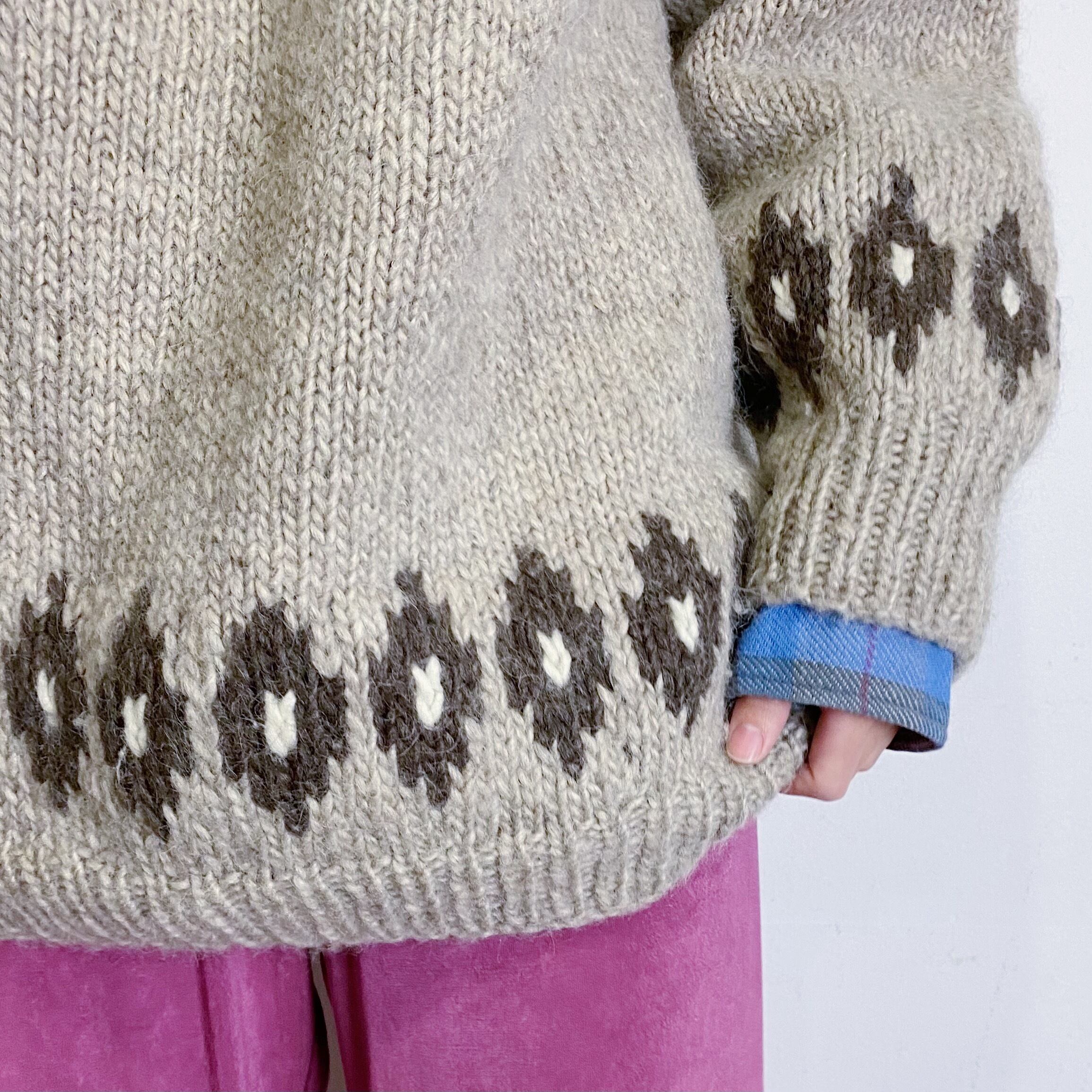 所々に毛糸が飛び出しホツレのように見える箇所があるほか脇辺りの網目が少し広がっておりますが、ここからほどけてしまう心配はなく見た目にもほぼ目立ちません。