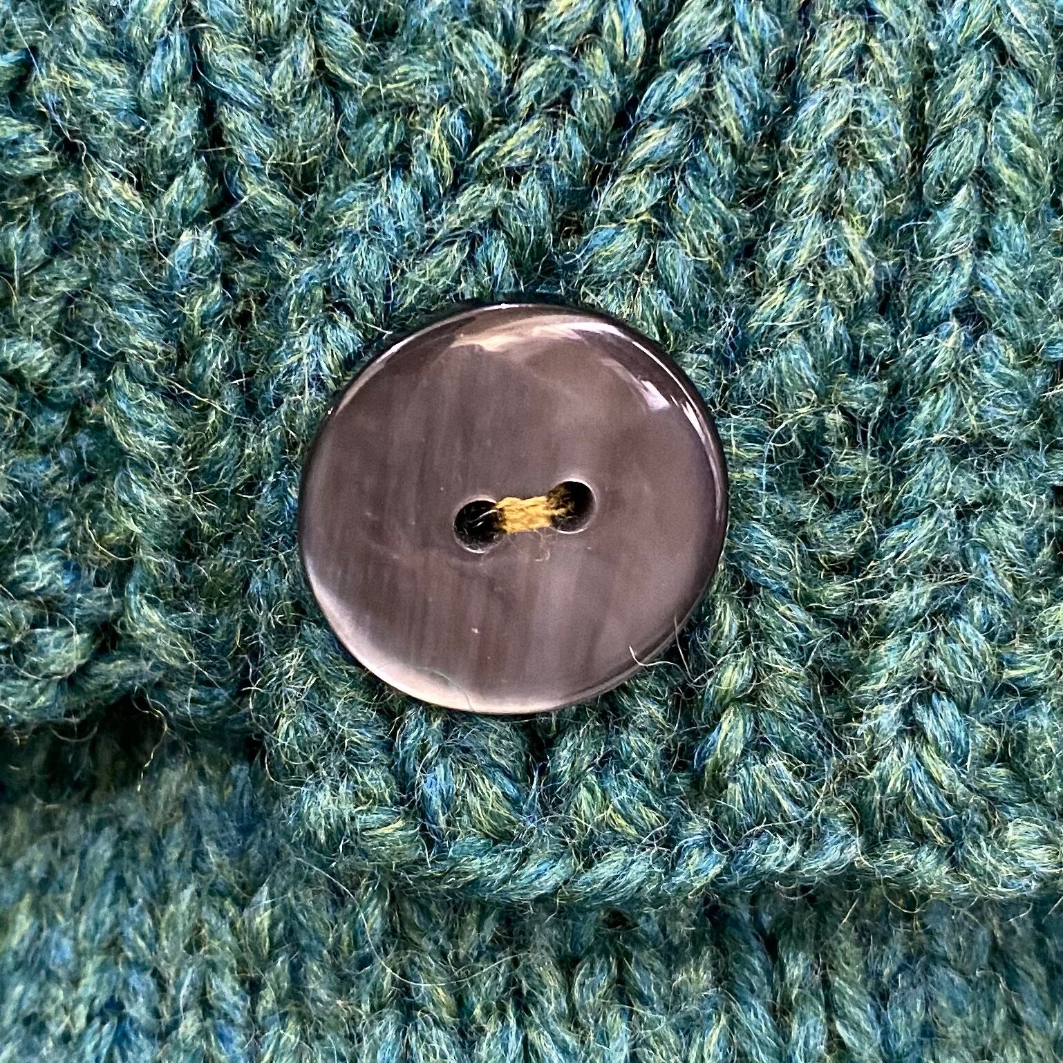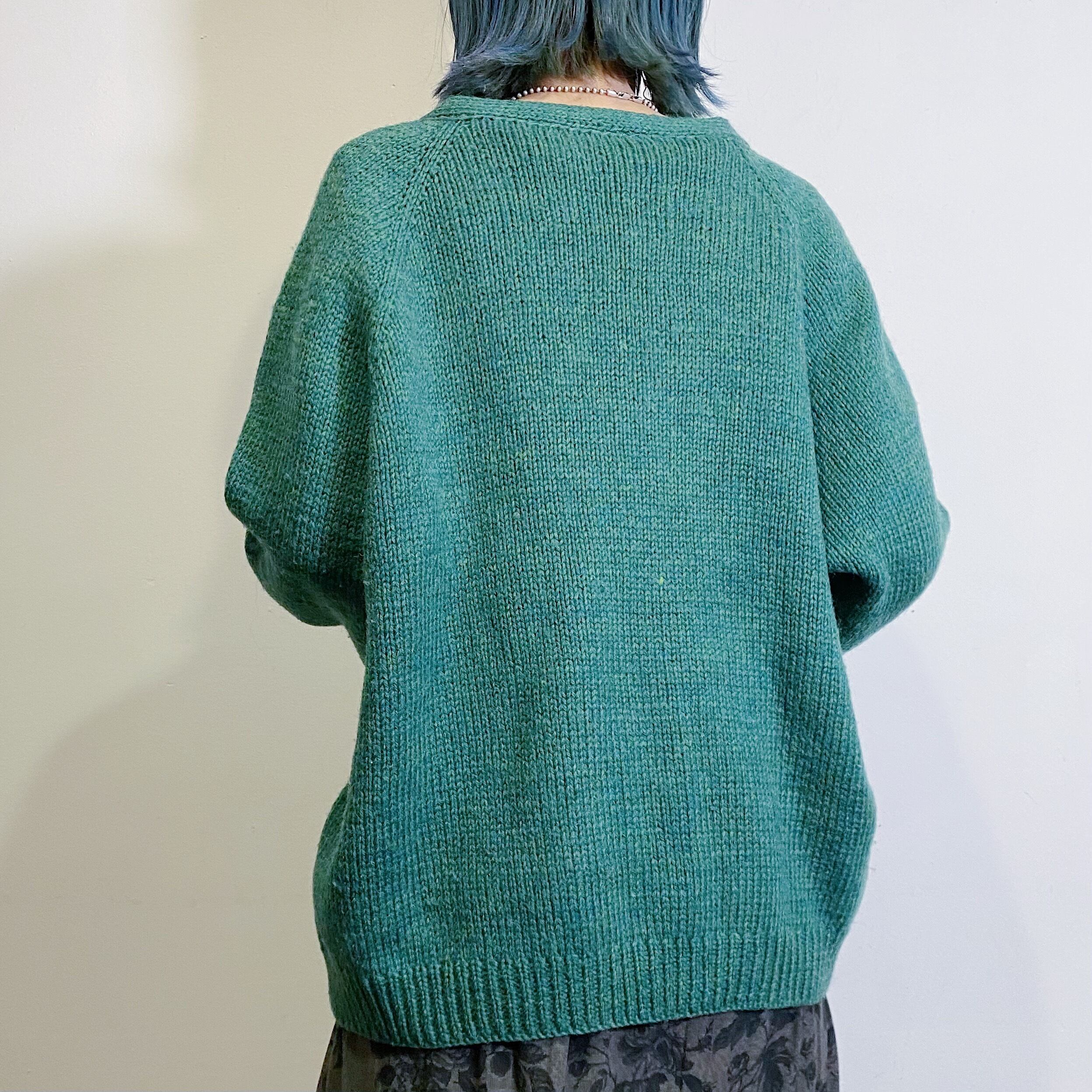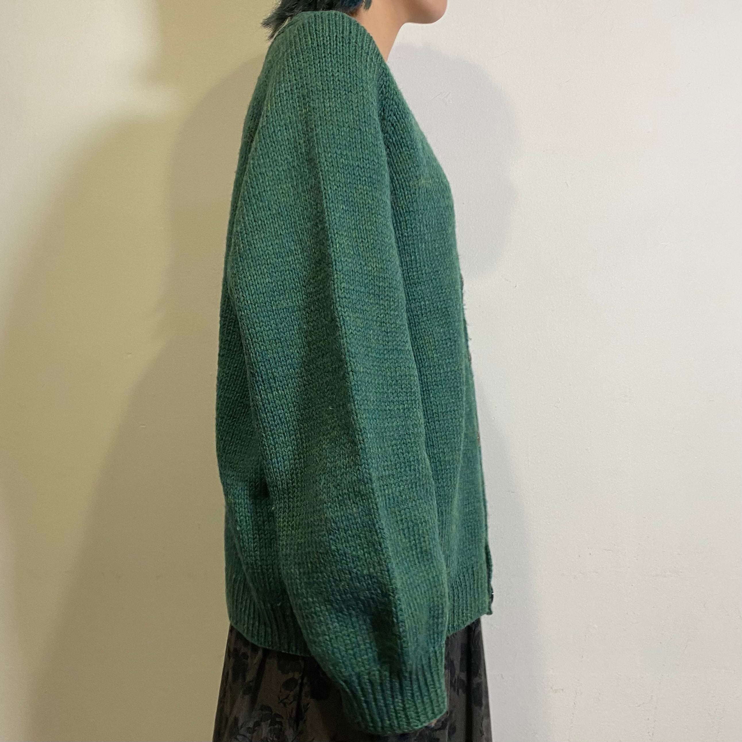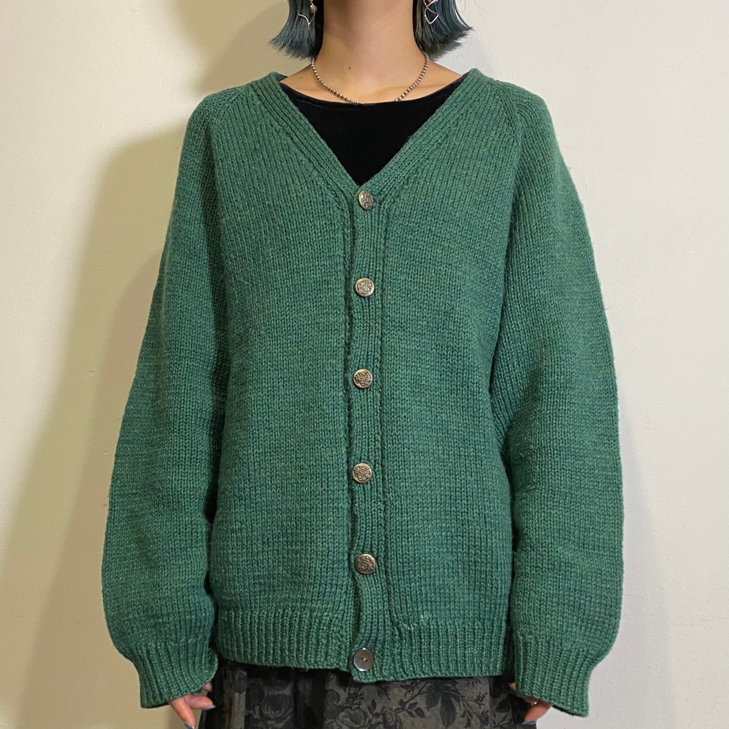 深めのグリーンが着こなしやすいハンドニットカーディガンです。