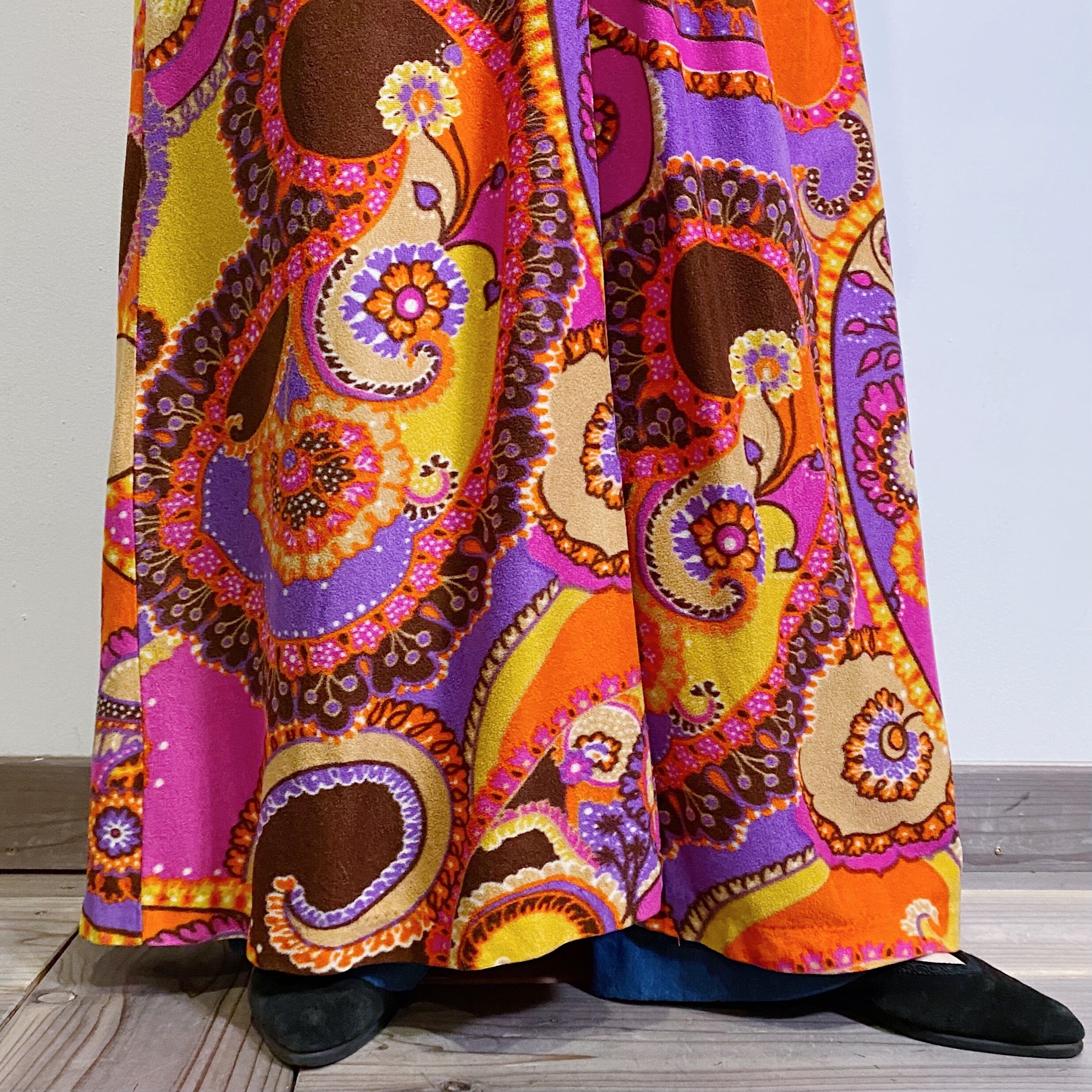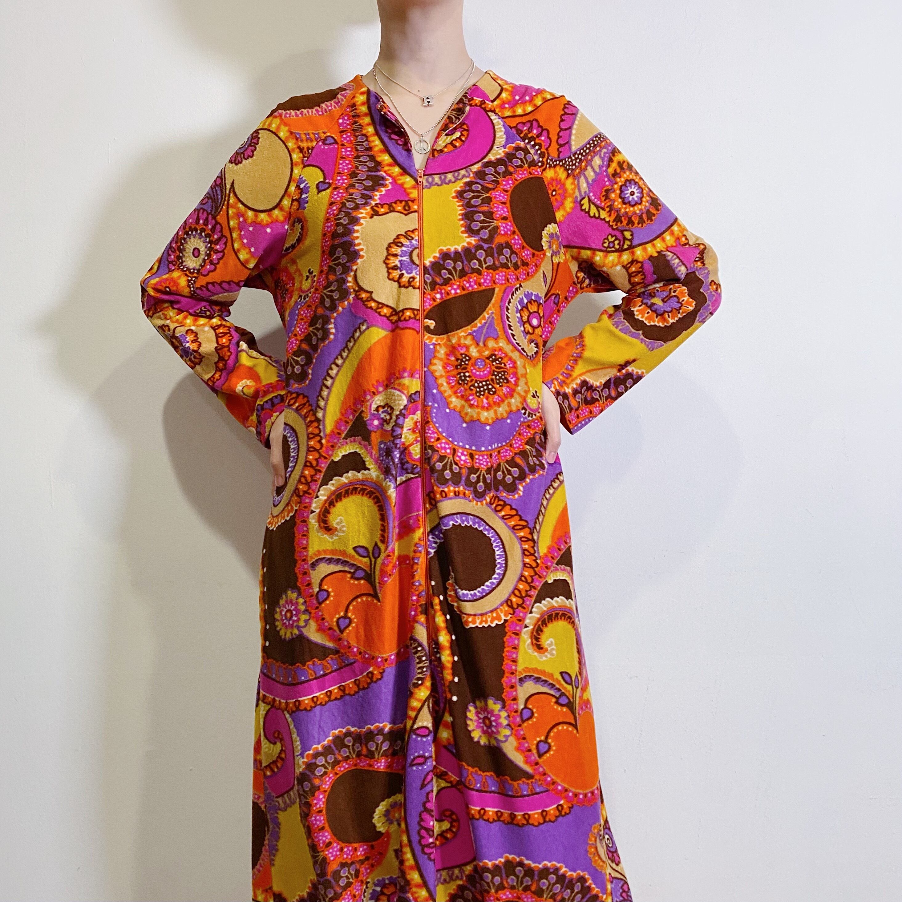 オレンジやイエロー・パープルなどの色合いのお花柄などのサイケデリック柄がかわいい、70年代のワンピースです。