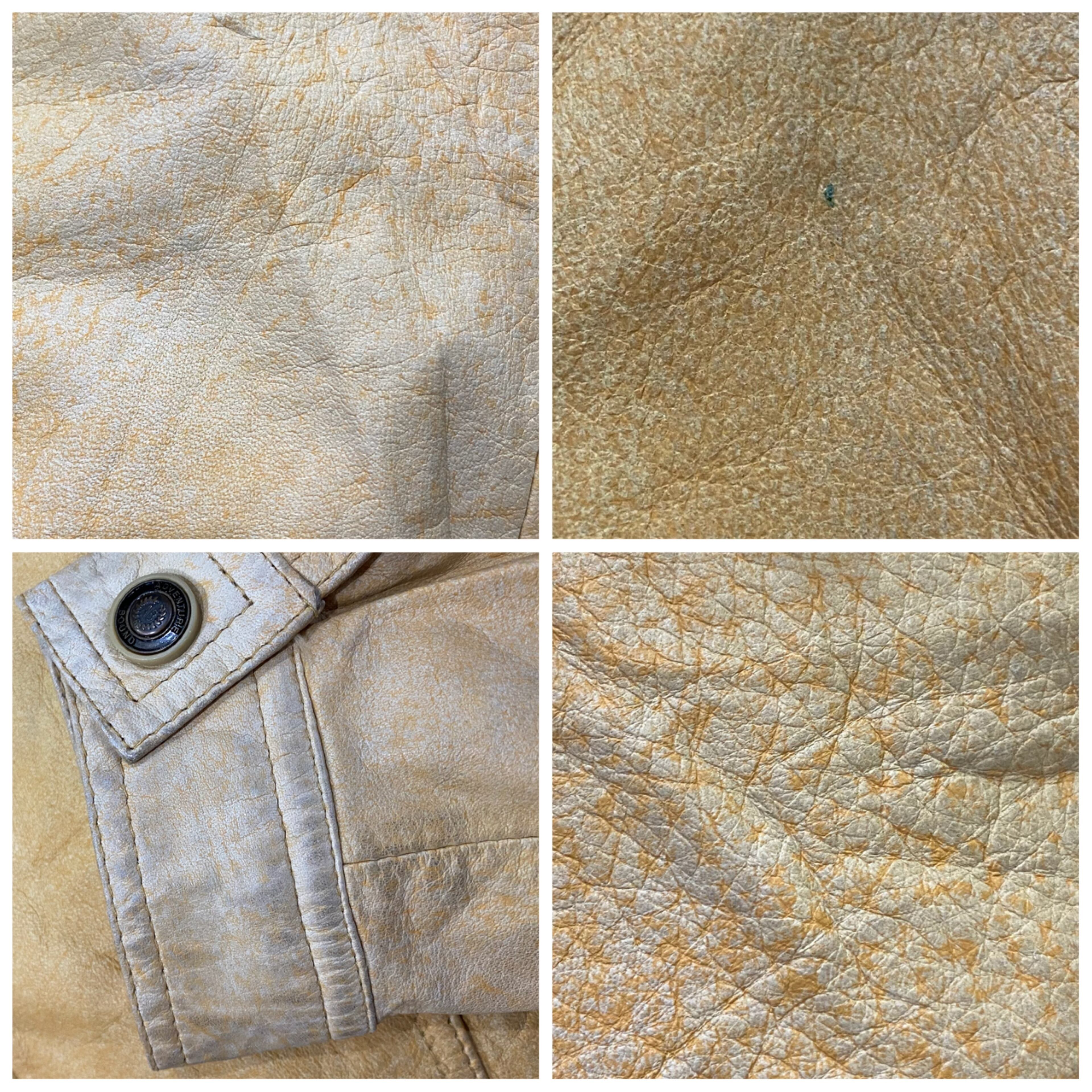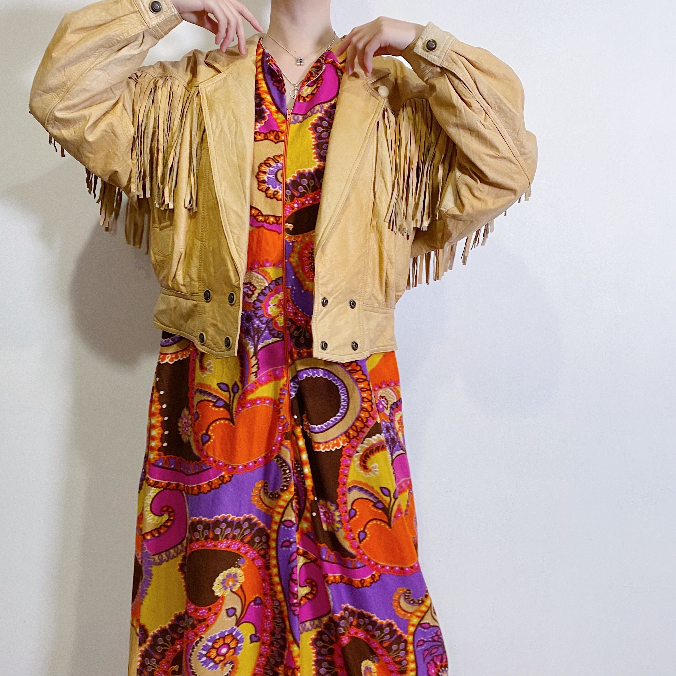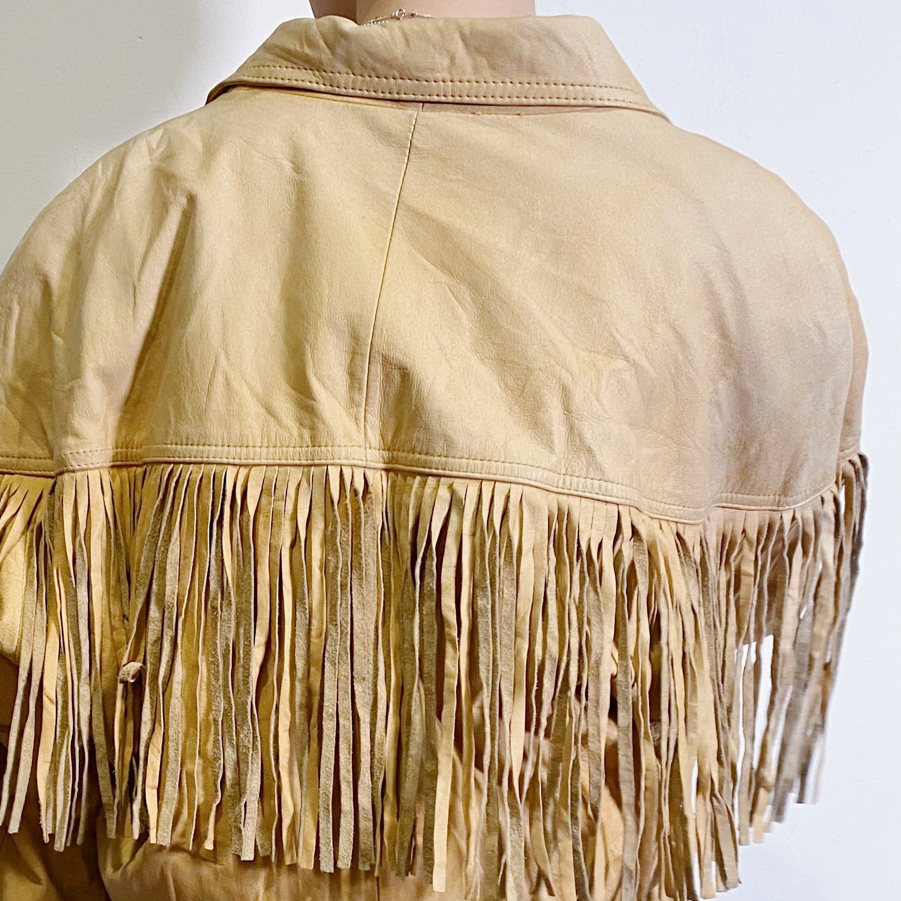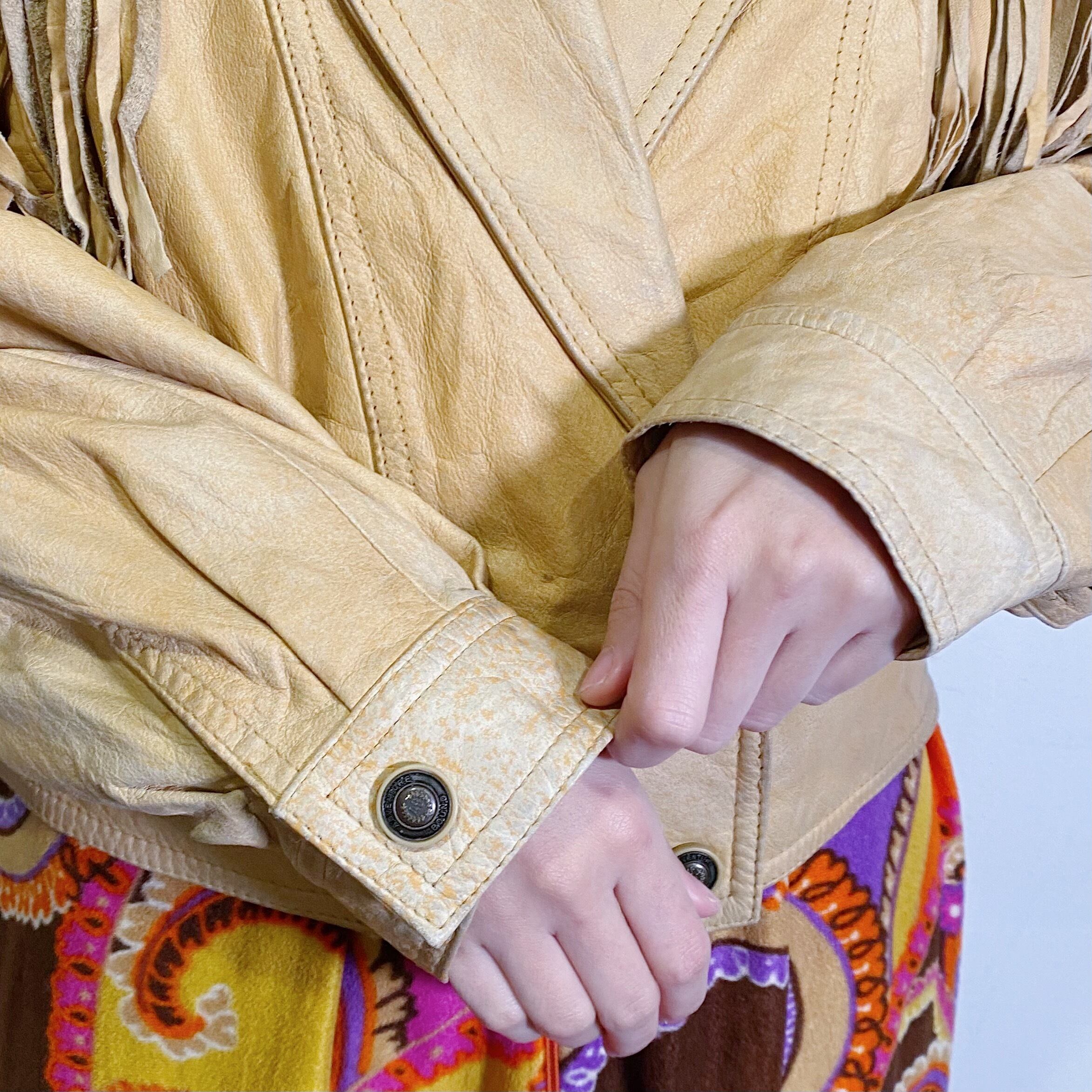 ベージュカラーにたっぷりのフリンジがかわいい、レザージャケットです。