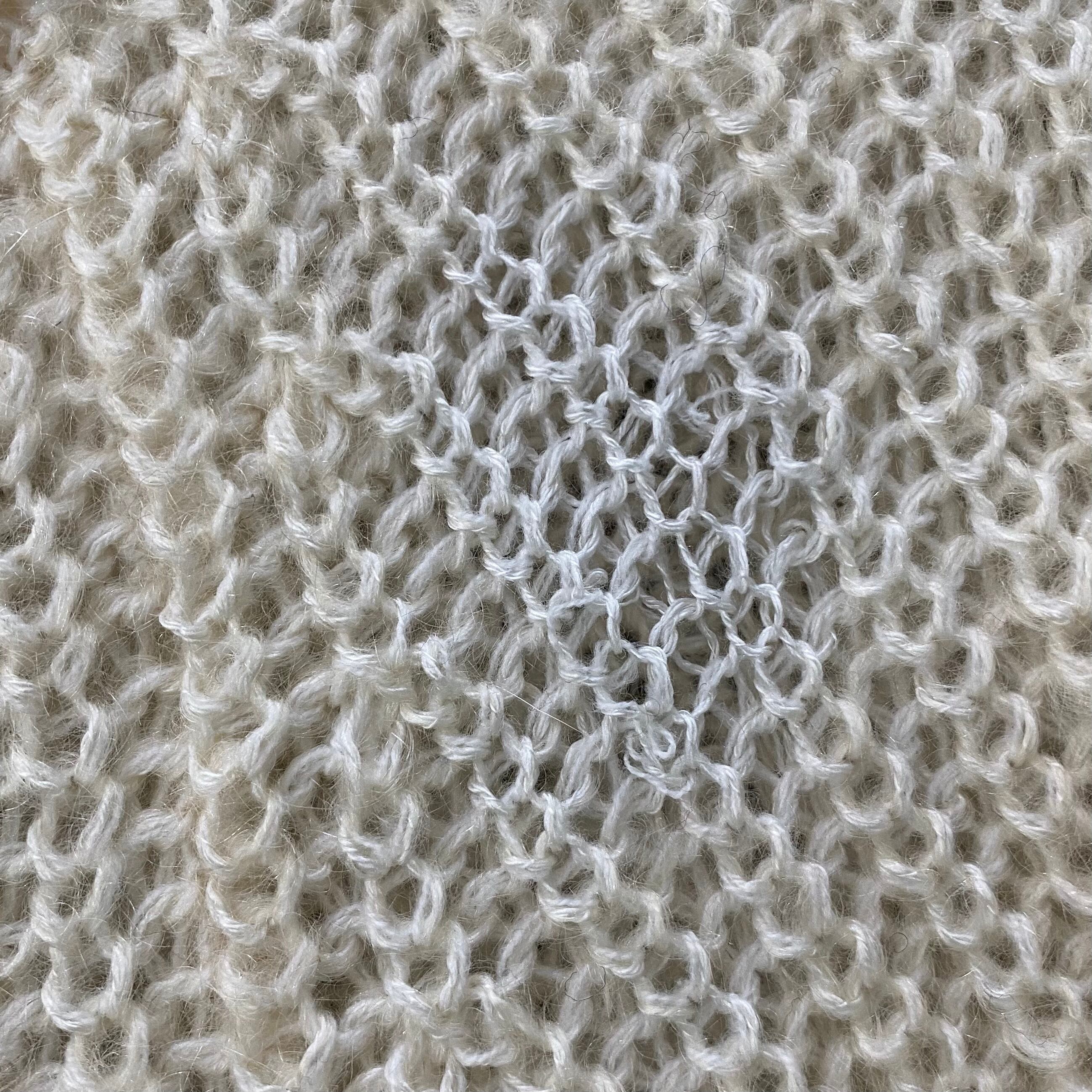 右袖に毛糸がとび出しホツレのように見える箇所がございますが、ここからほどけてしまう心配はなく見た目にも気にならない程度かと思われます。