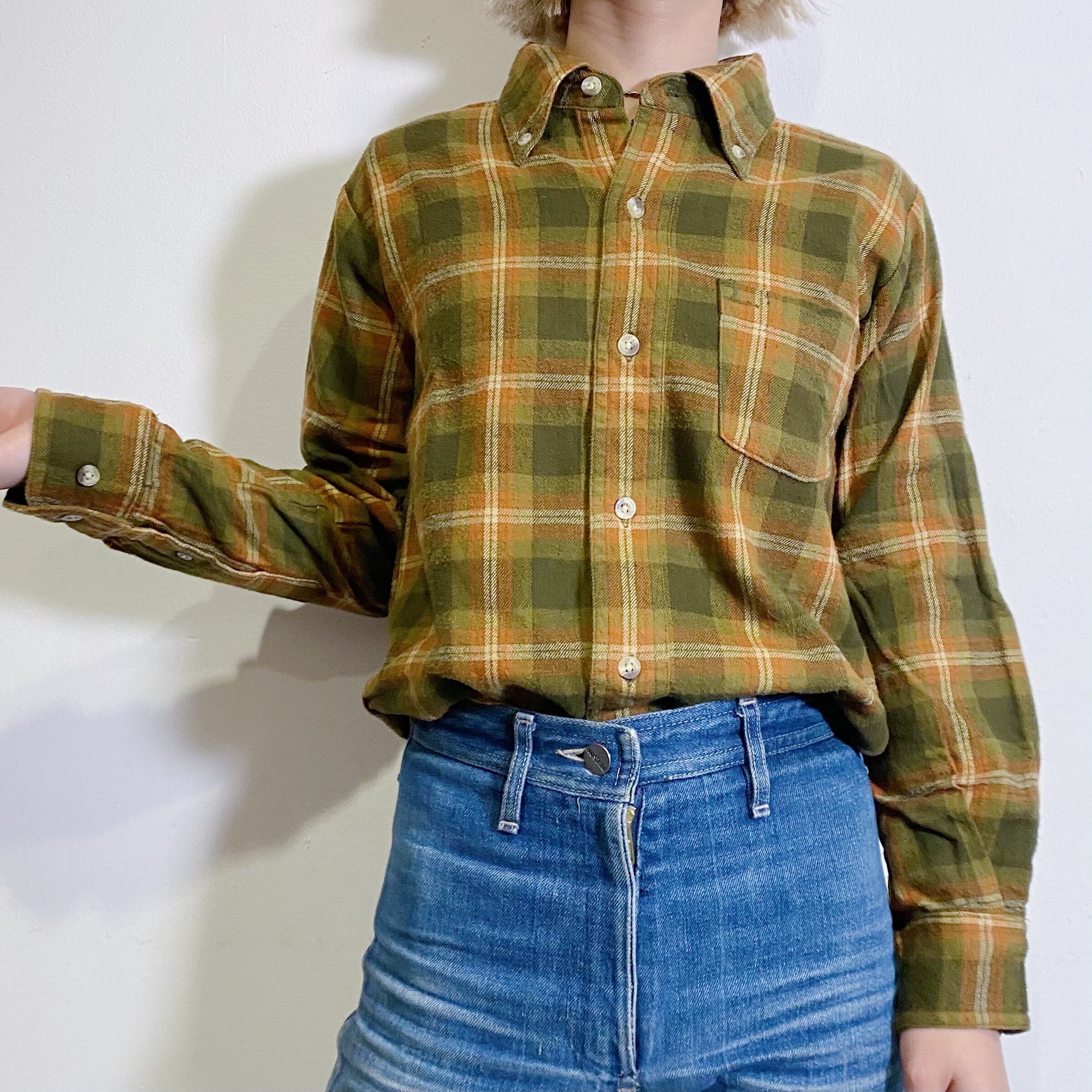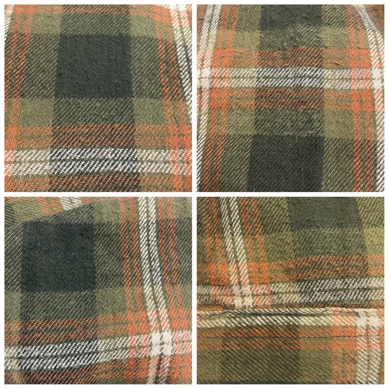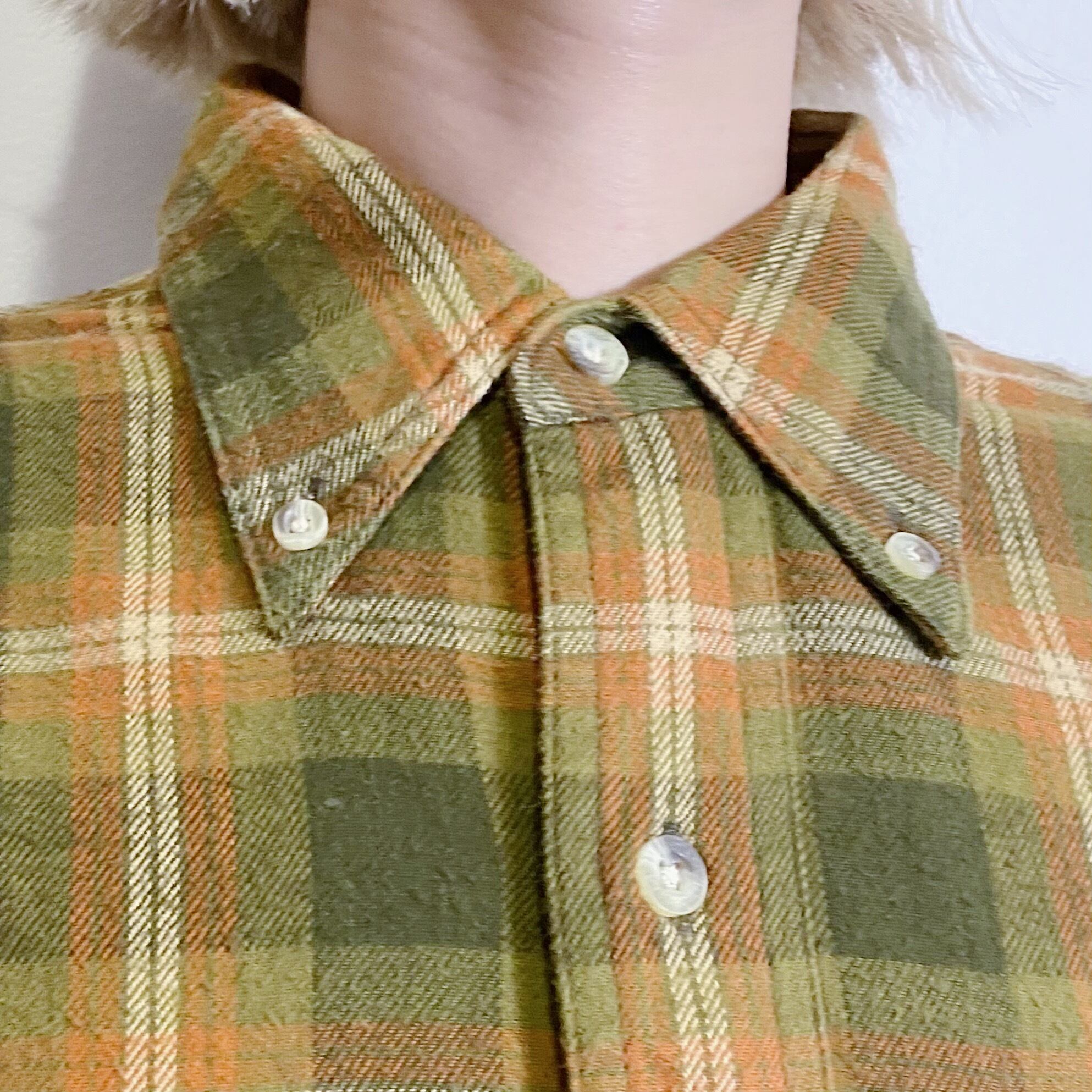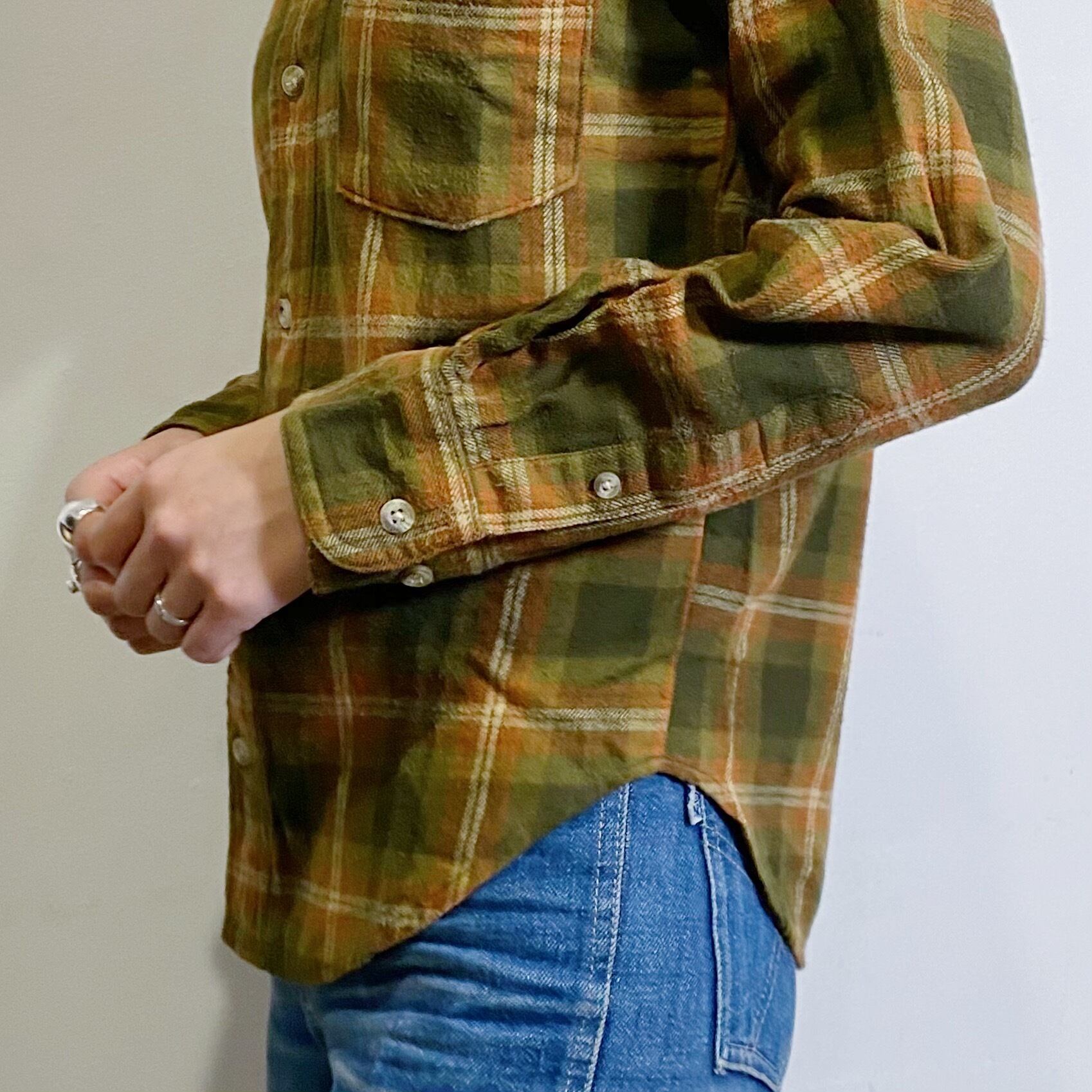 グリーンとオレンジの暖かな色合いがかわいいネルシャツです。