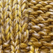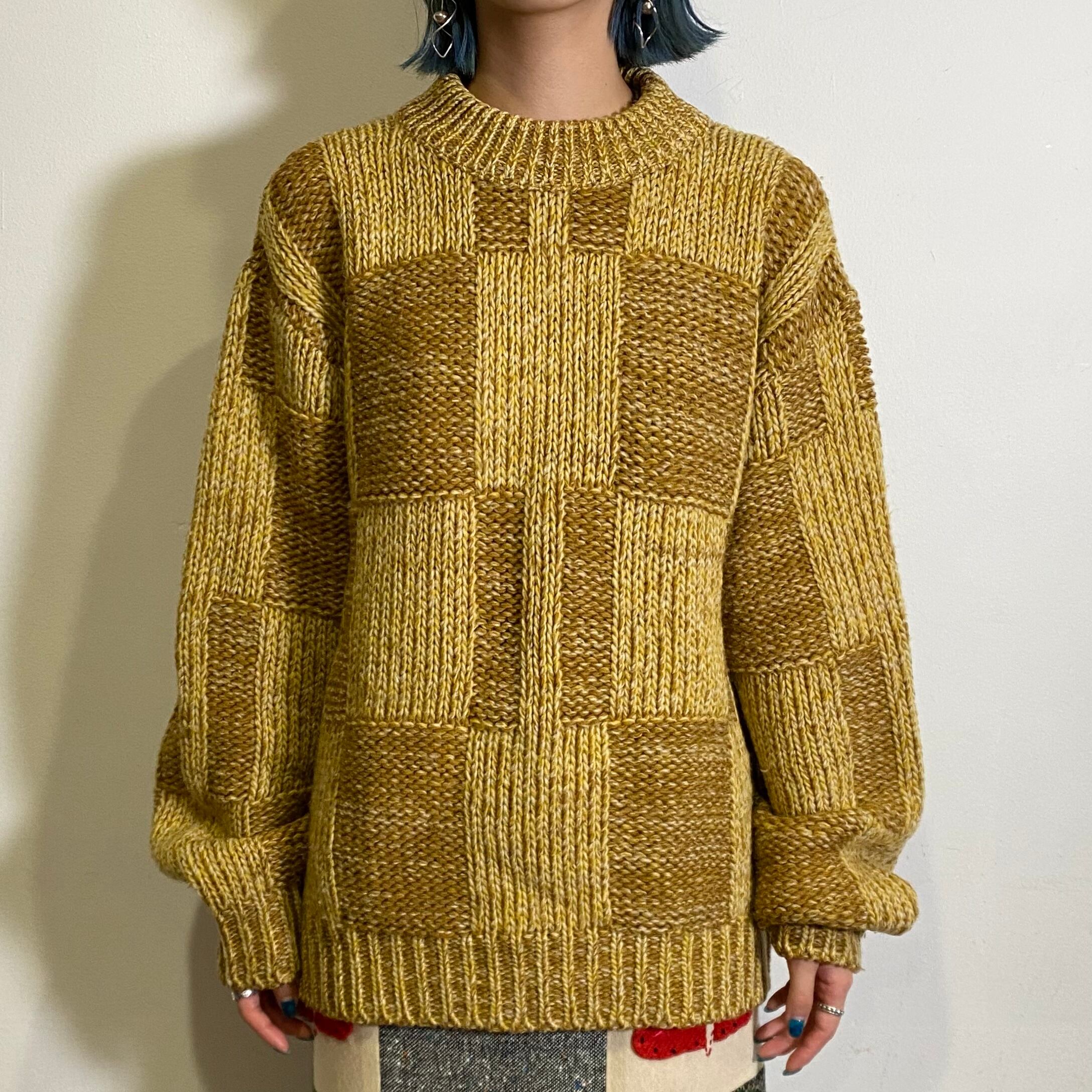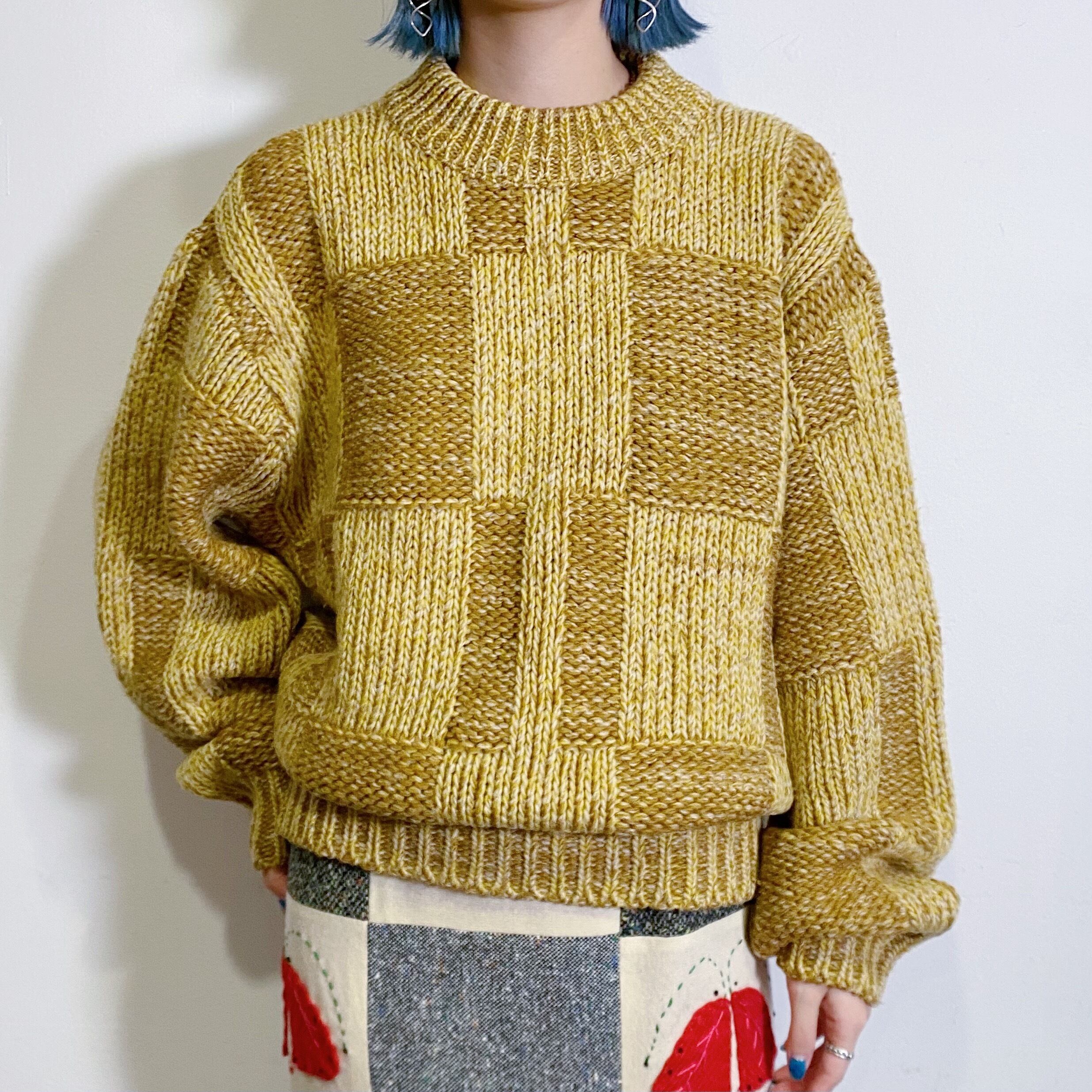 ブロックチェックのような凝った編みにマスタードカラーが可愛いウールセーターです。