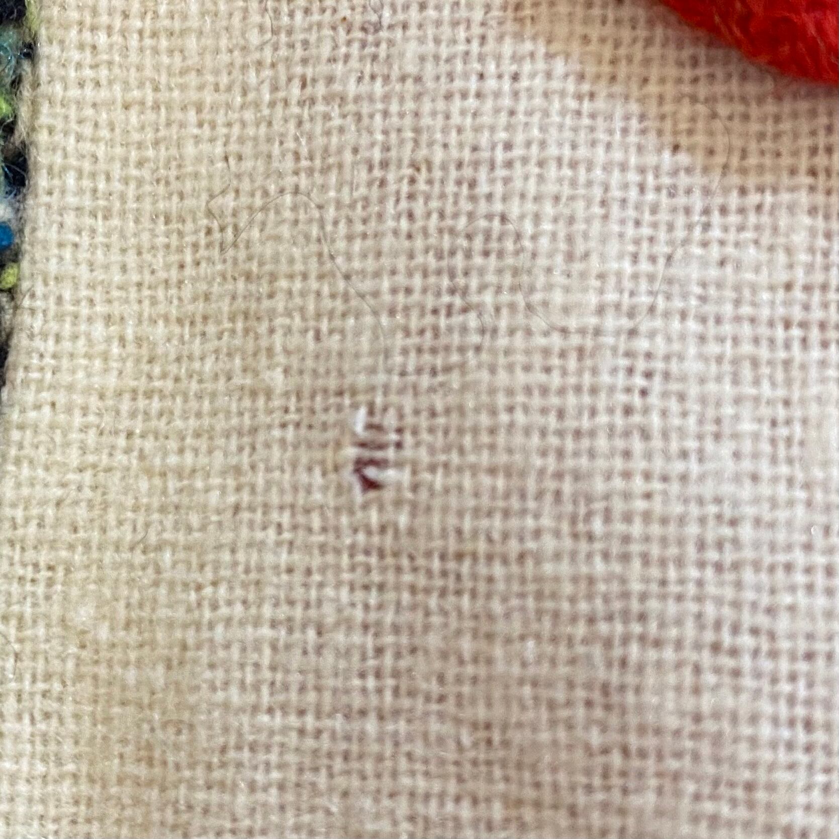 また薄っすらとしたシミや貫通していない穴、刺繍部分のホツレが見受けられますがいずれも小さくこちらも気にならないかと思われます。