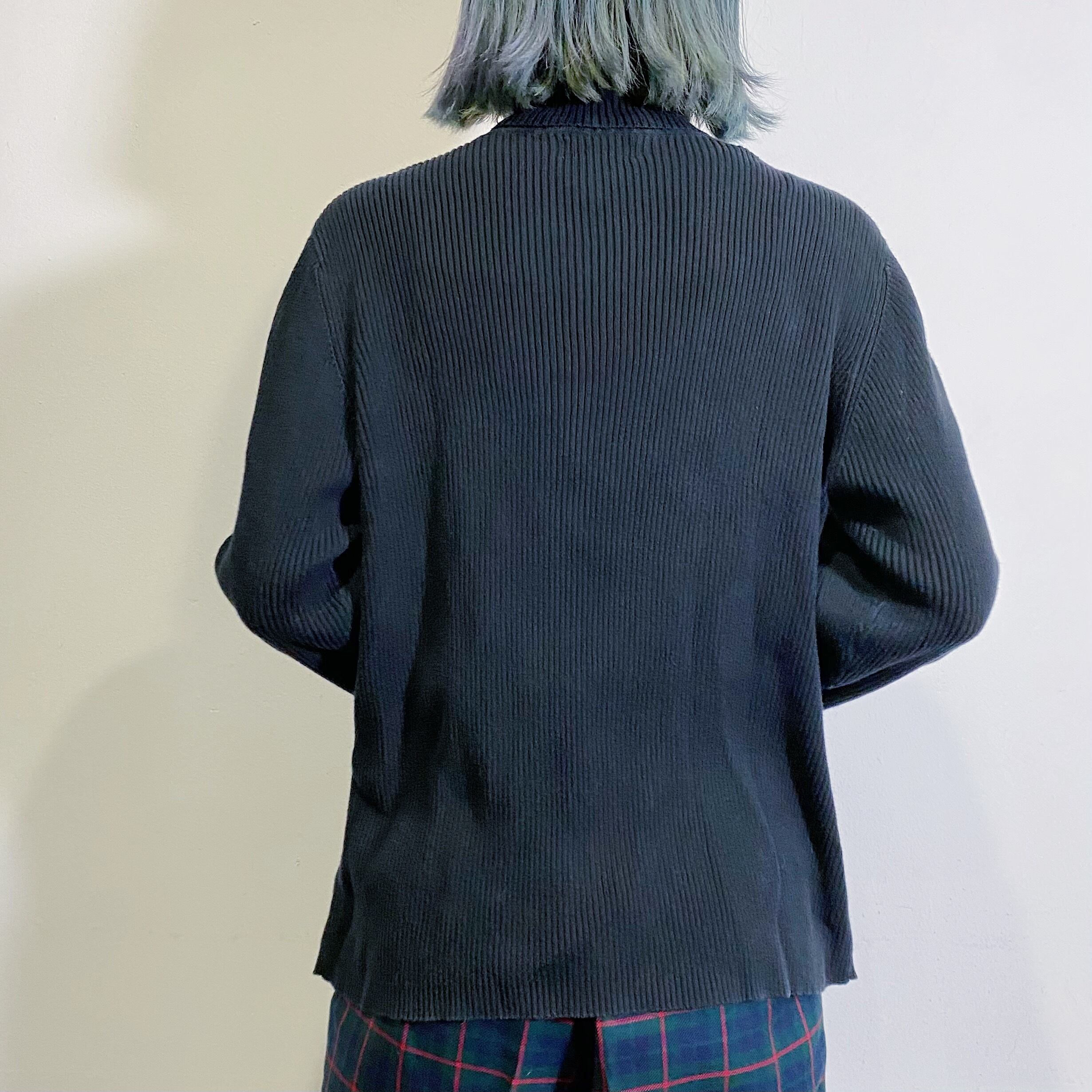 黒地のリブニットで使い勝手が大変良い、タートルトップスです。