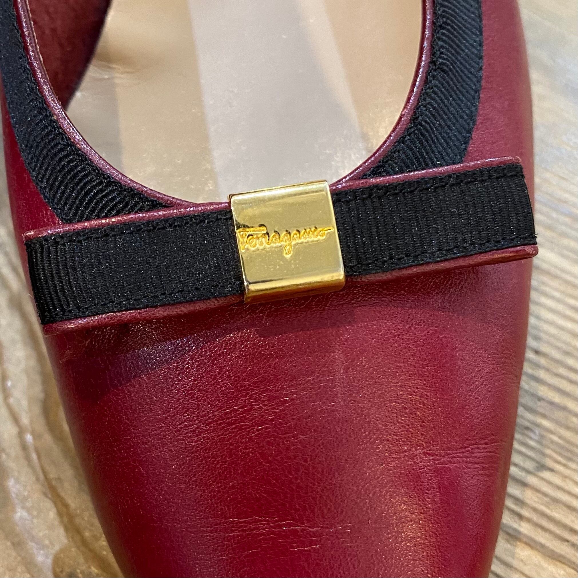 ワインレッドに黒のリボンが大人かわいい、フェラガモのパンプスです。