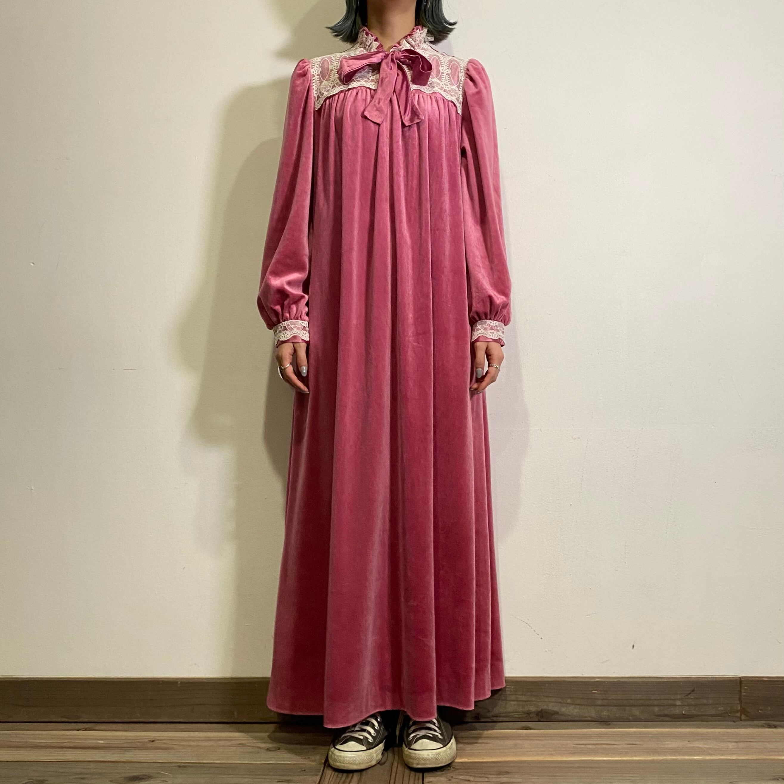 ピンクベースに胸元や袖のレース、首元のリボンがとびきり可愛い、70年代のベロアワンピースです。