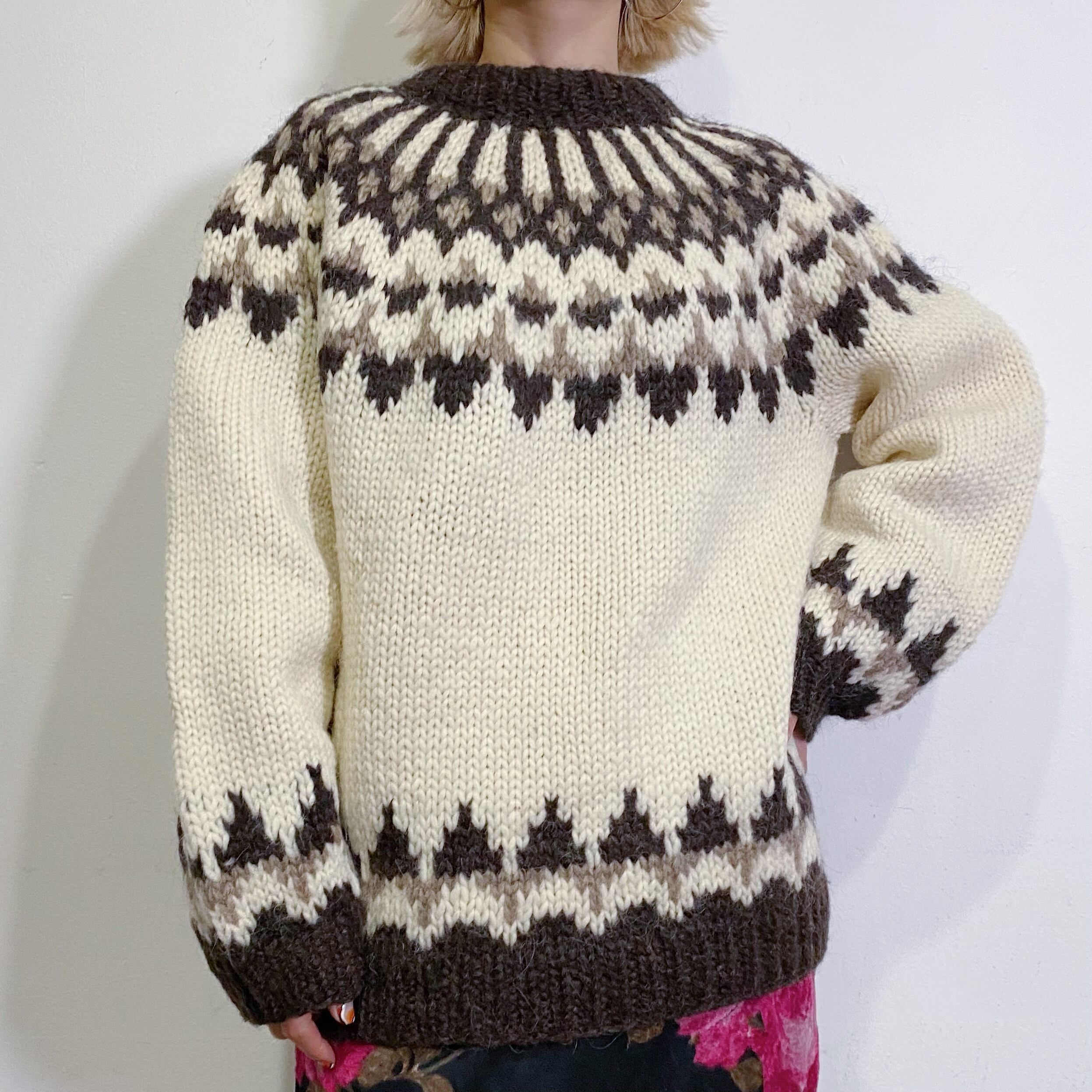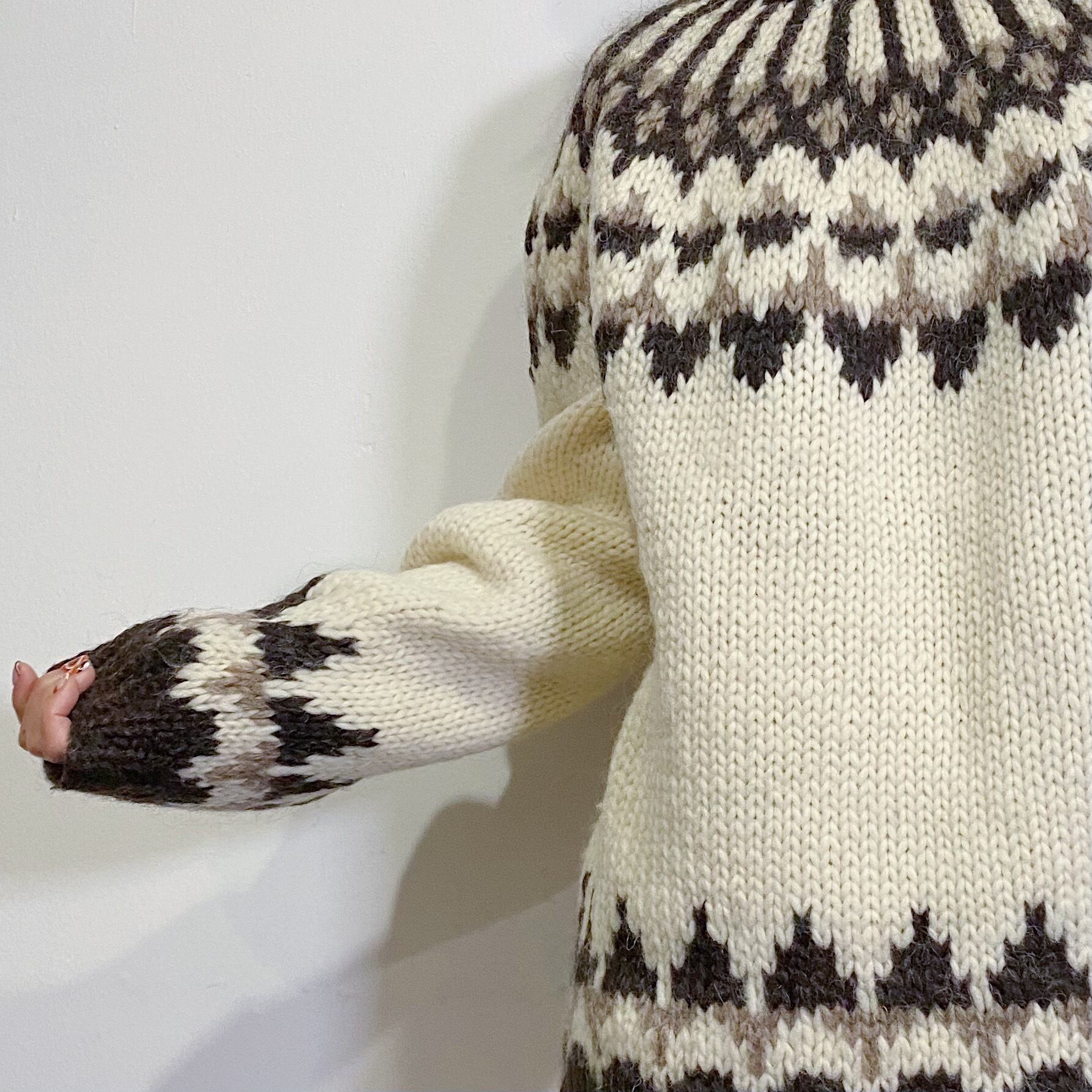 手編みのざっくり感とゆったりとしたシルエットが可愛いノルディックセーターです。