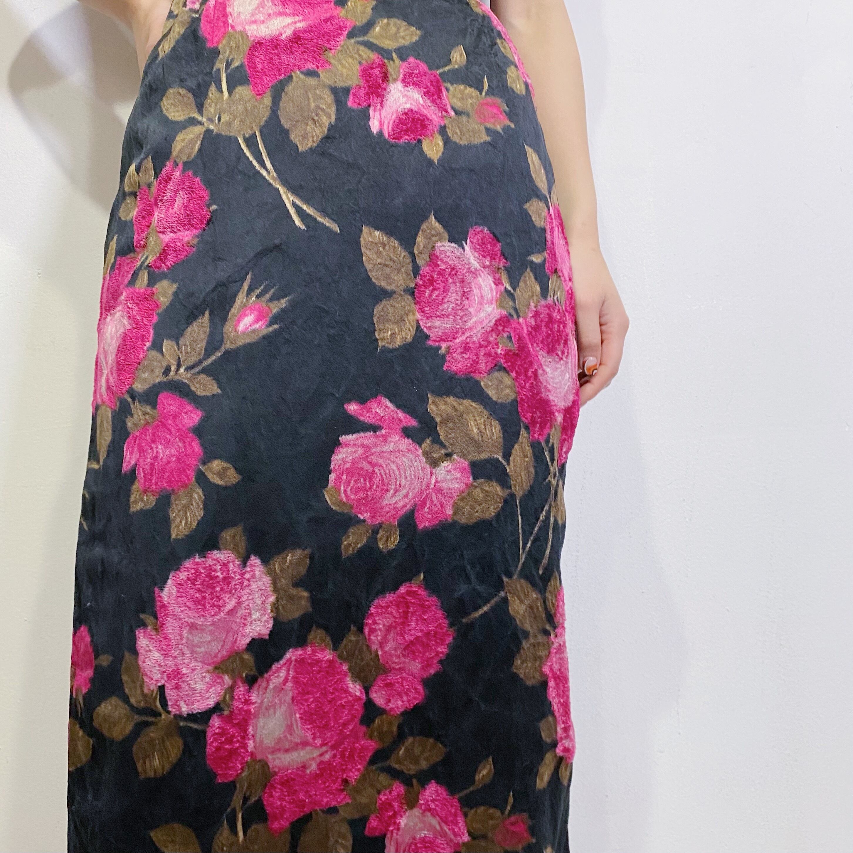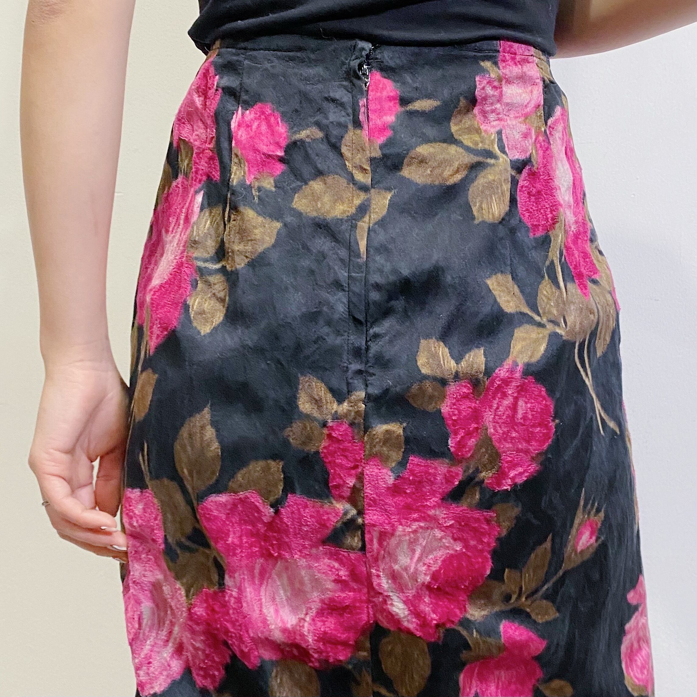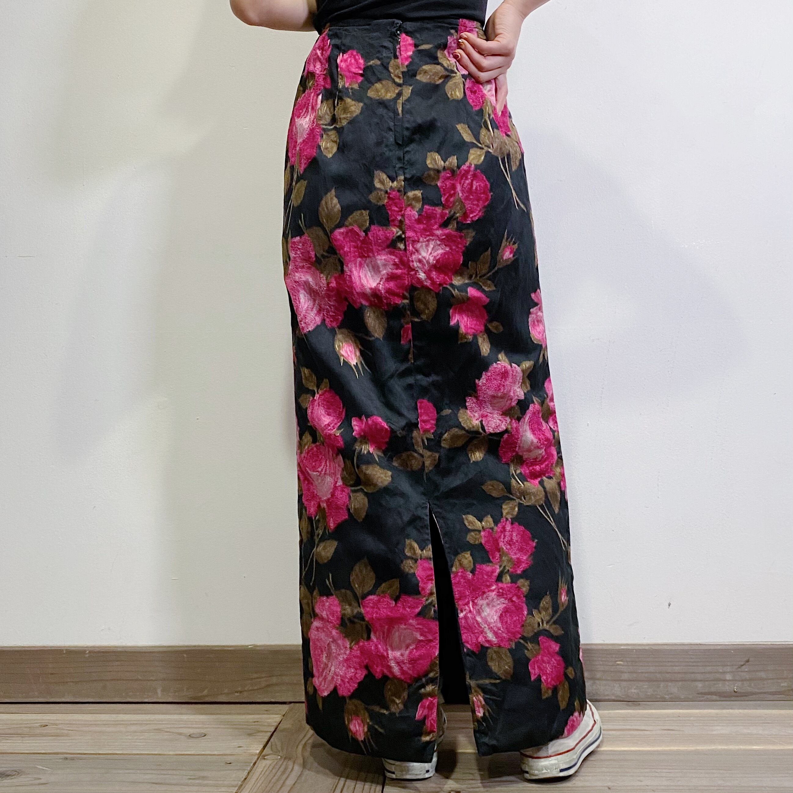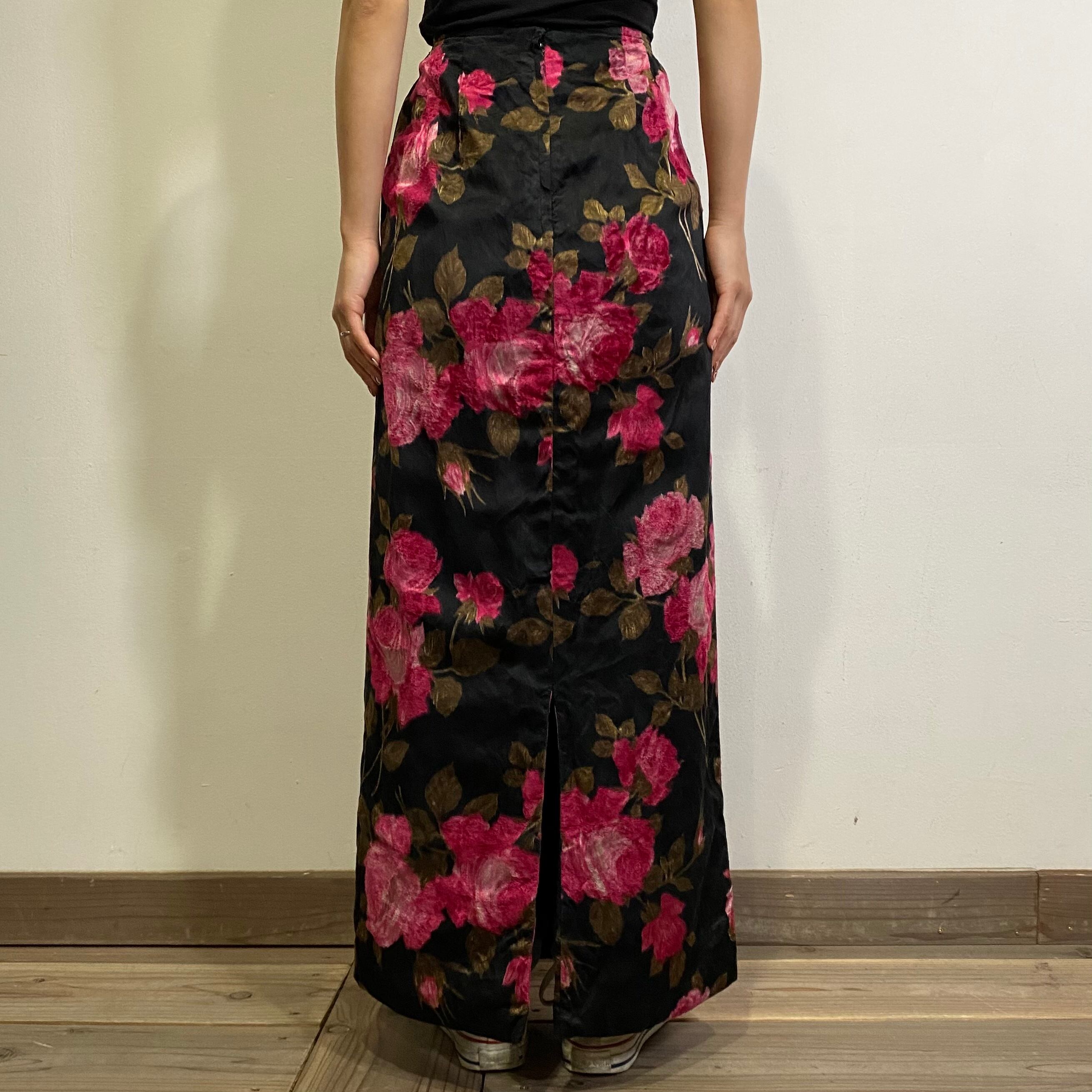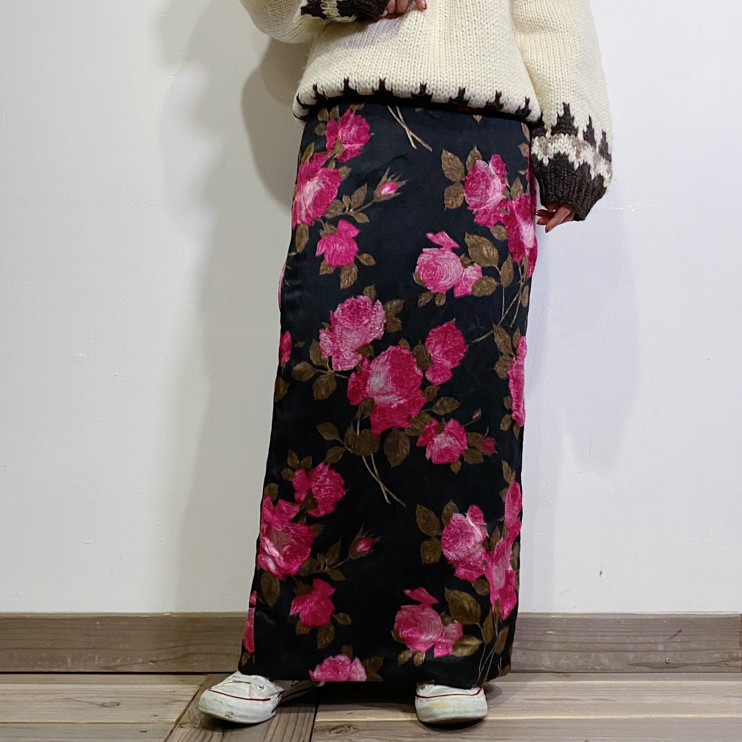 黒ベースにピンクのバラが映える、60~70年代のロングスカートです。