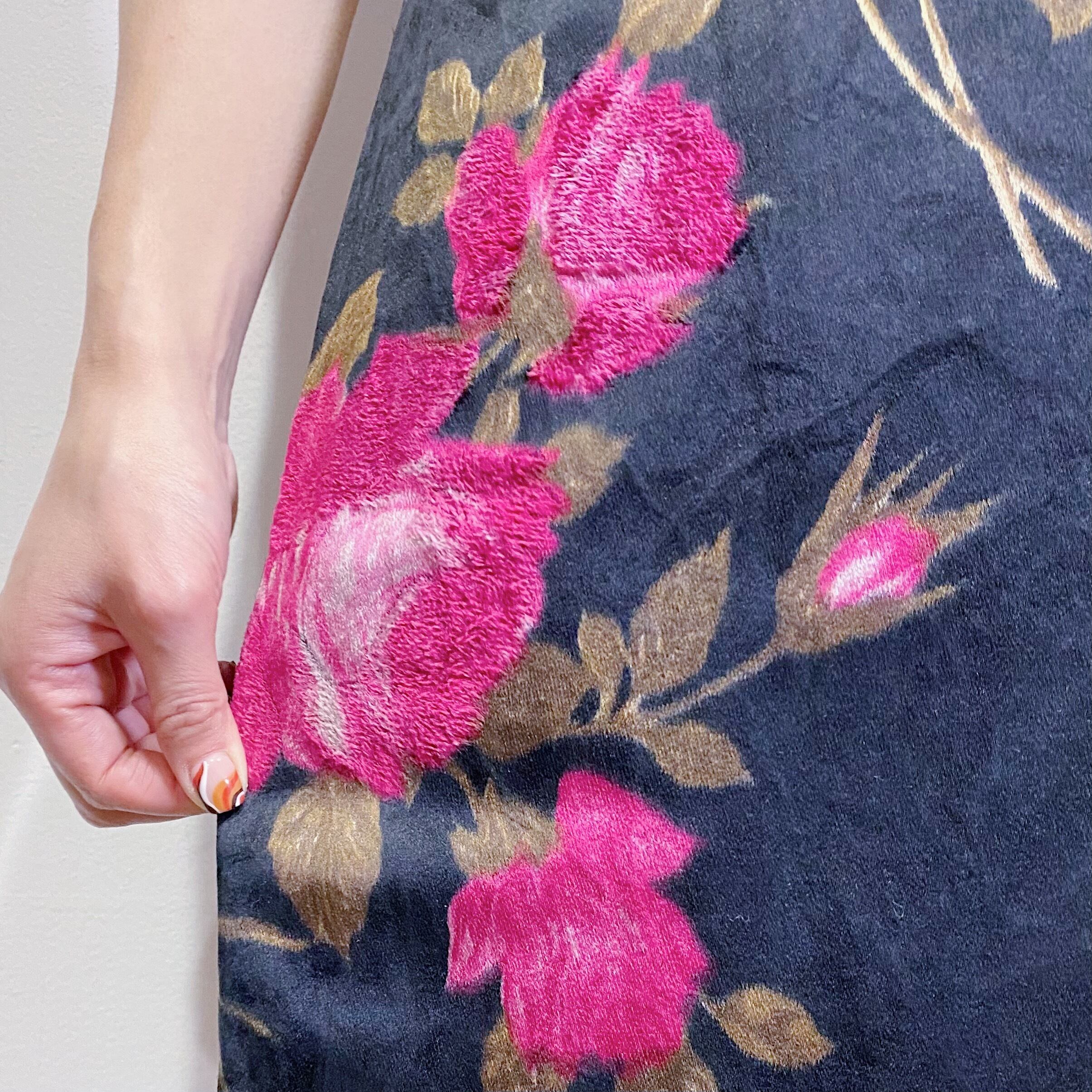 サテン地にバラの部分だけ起毛感のある素材がユニークで、凝った作りの一枚。
