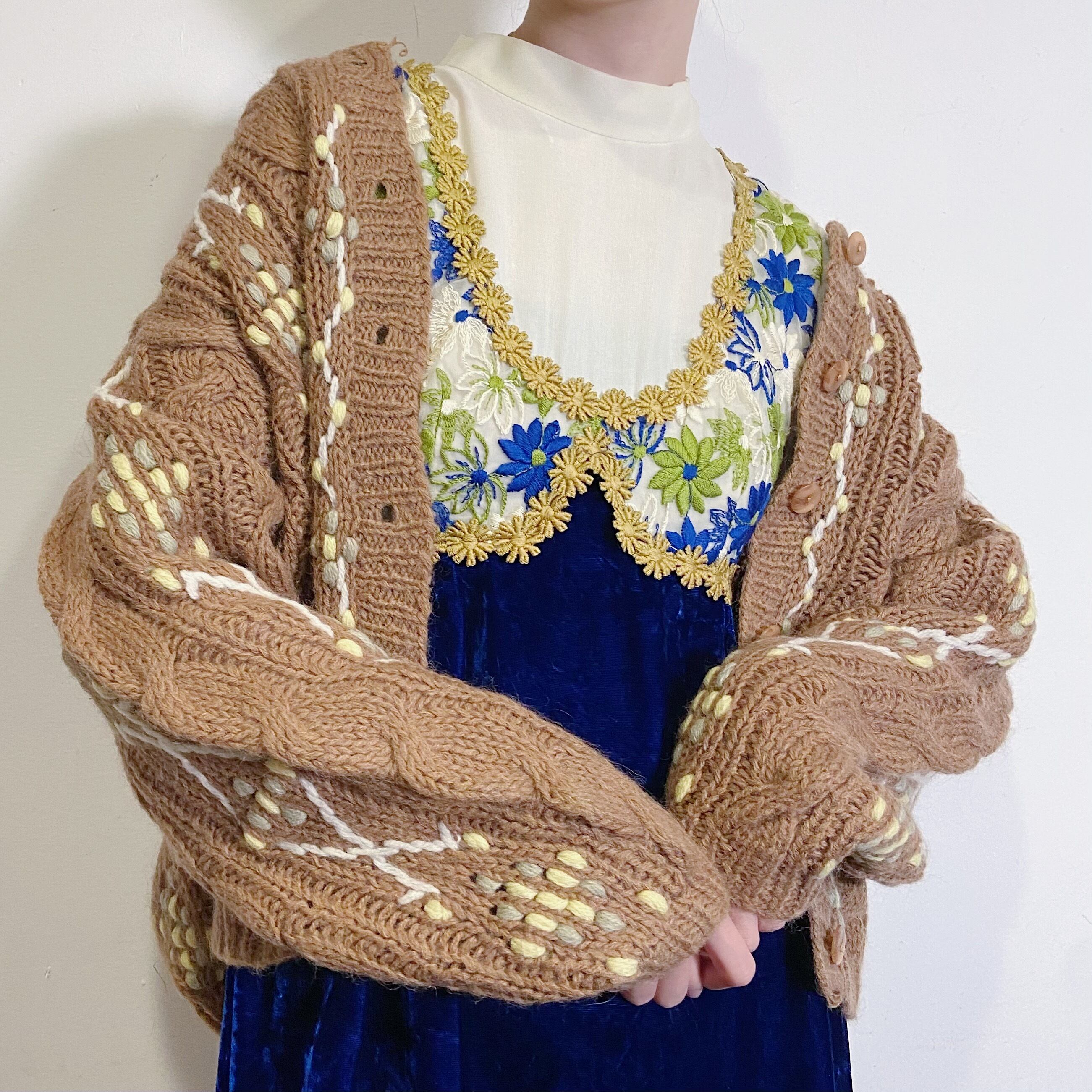 柔らかいブラウンカラーにホワイトやイエローの編みがかわいい、ニットカーディガンです。