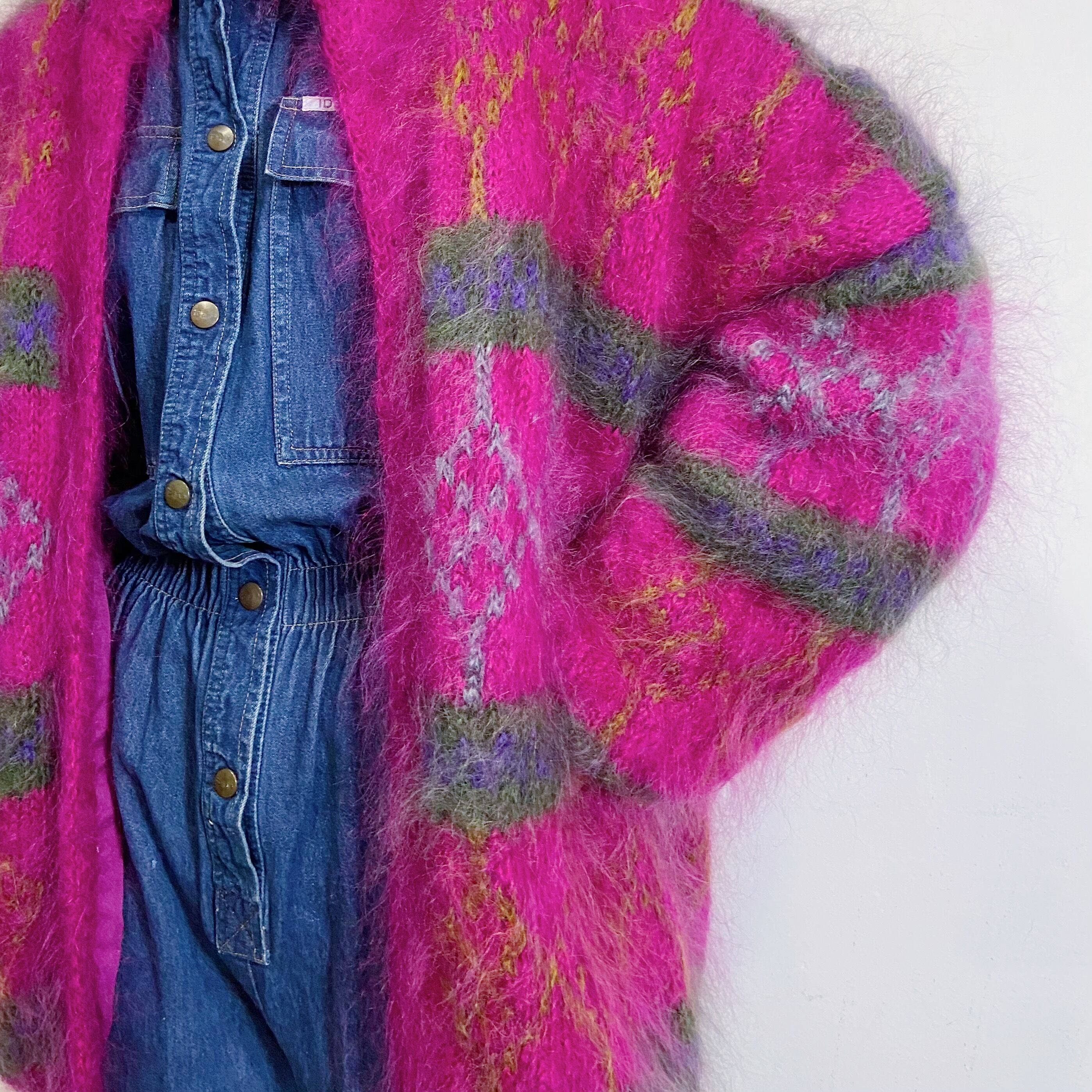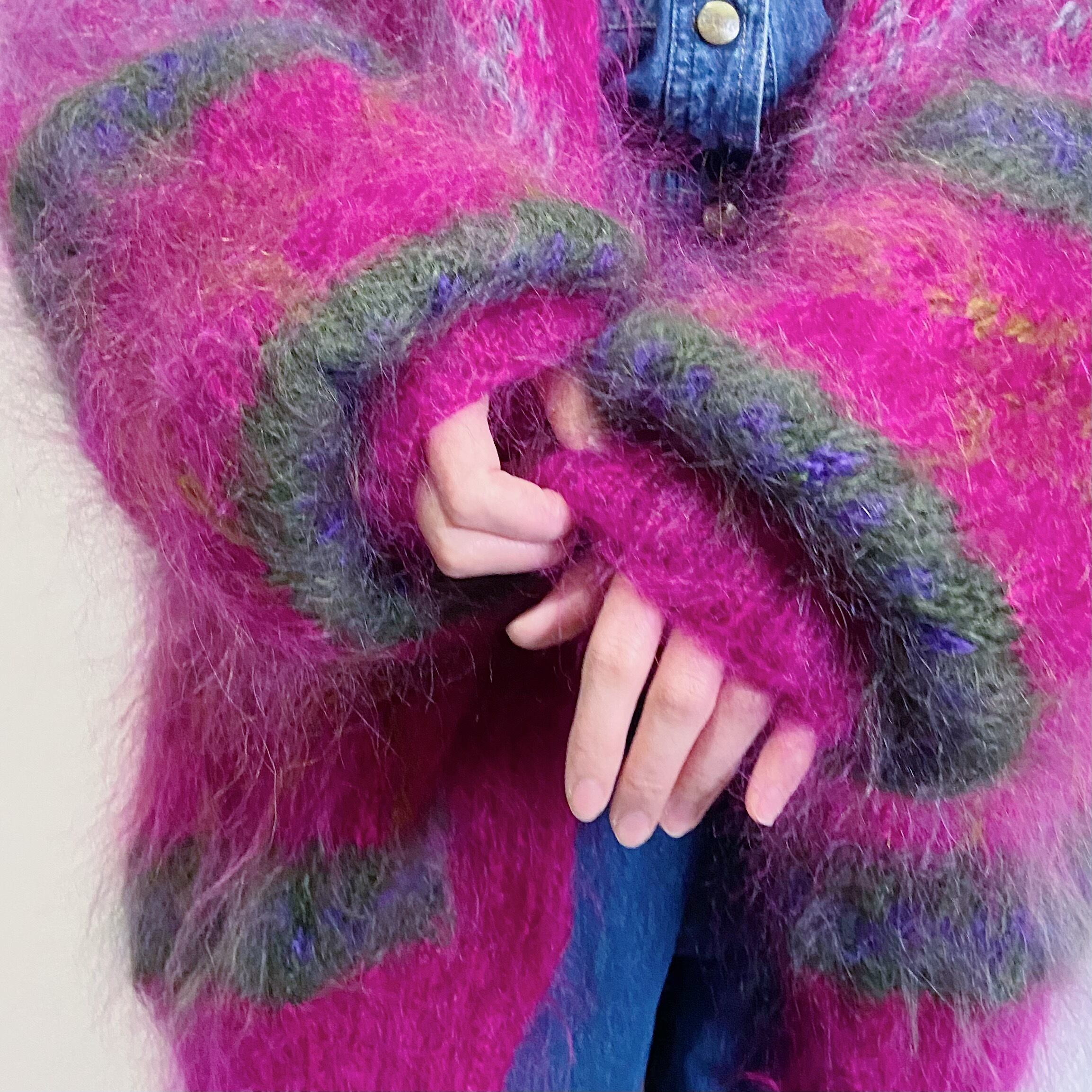 パープルカラーにグリーンやブラウンの色合いがかわいい80年代のカーディガンです。