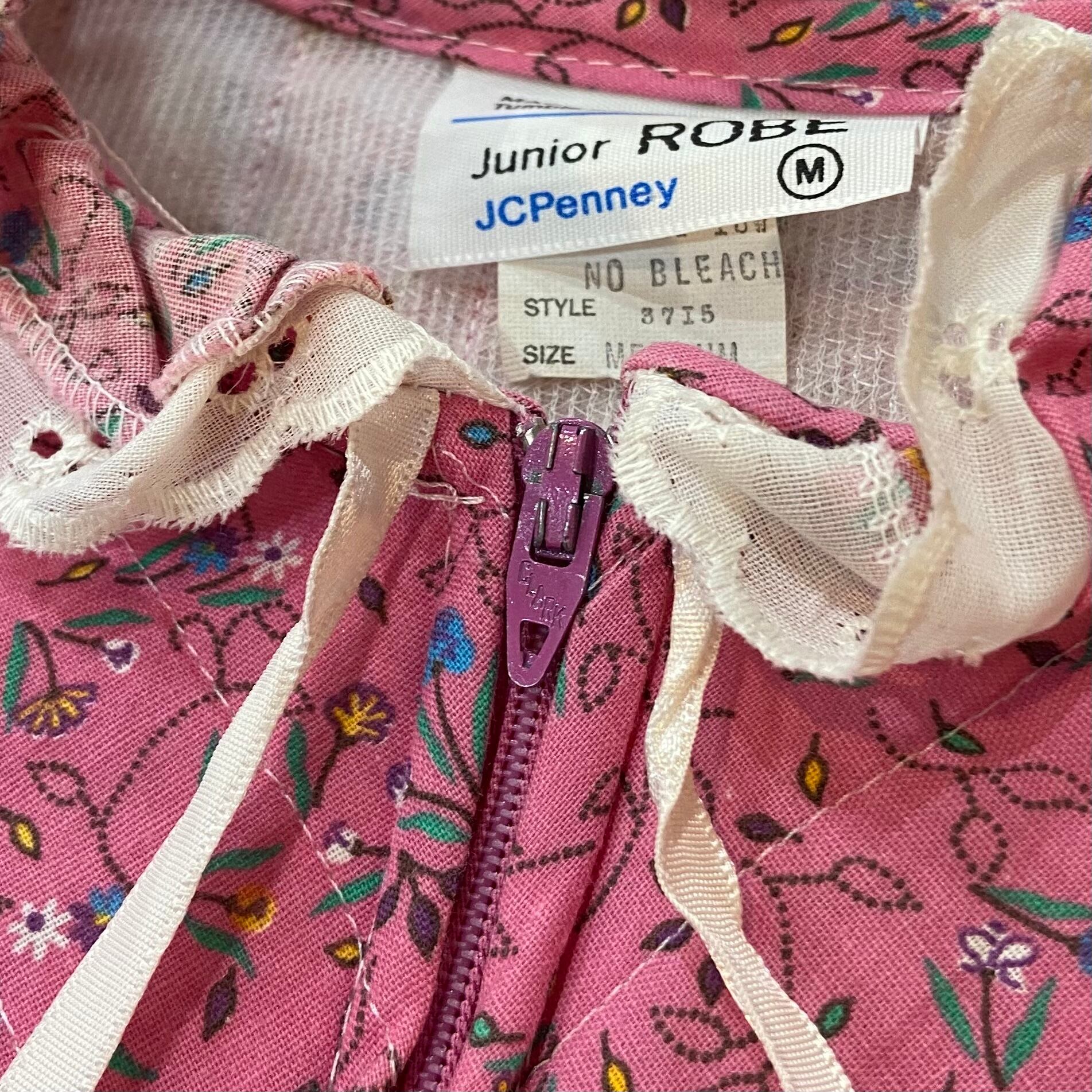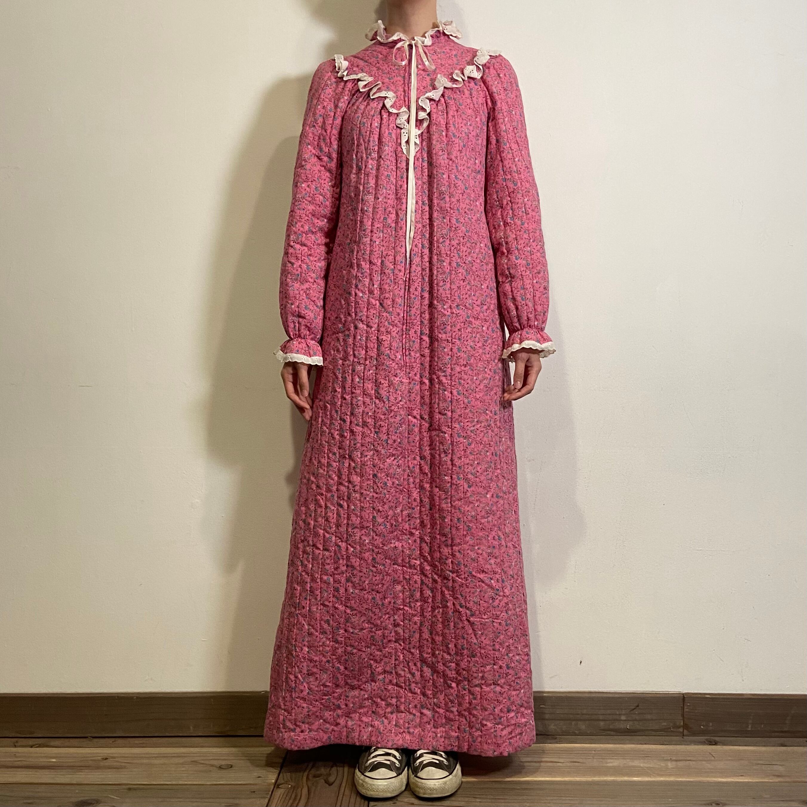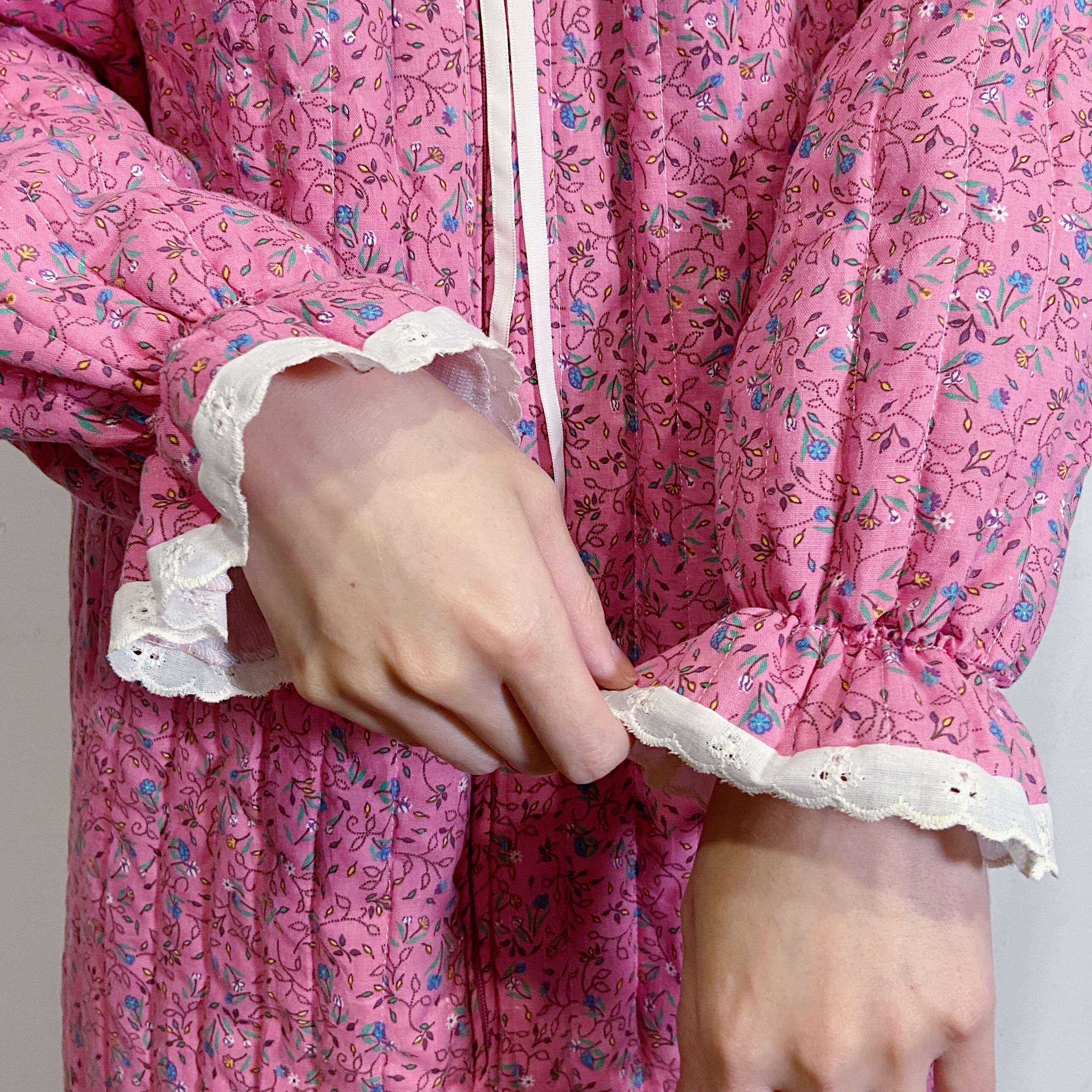 ピンクカラーにブルーやイエローなどの小花柄がかわいい、70年代のキルティングドレスです。