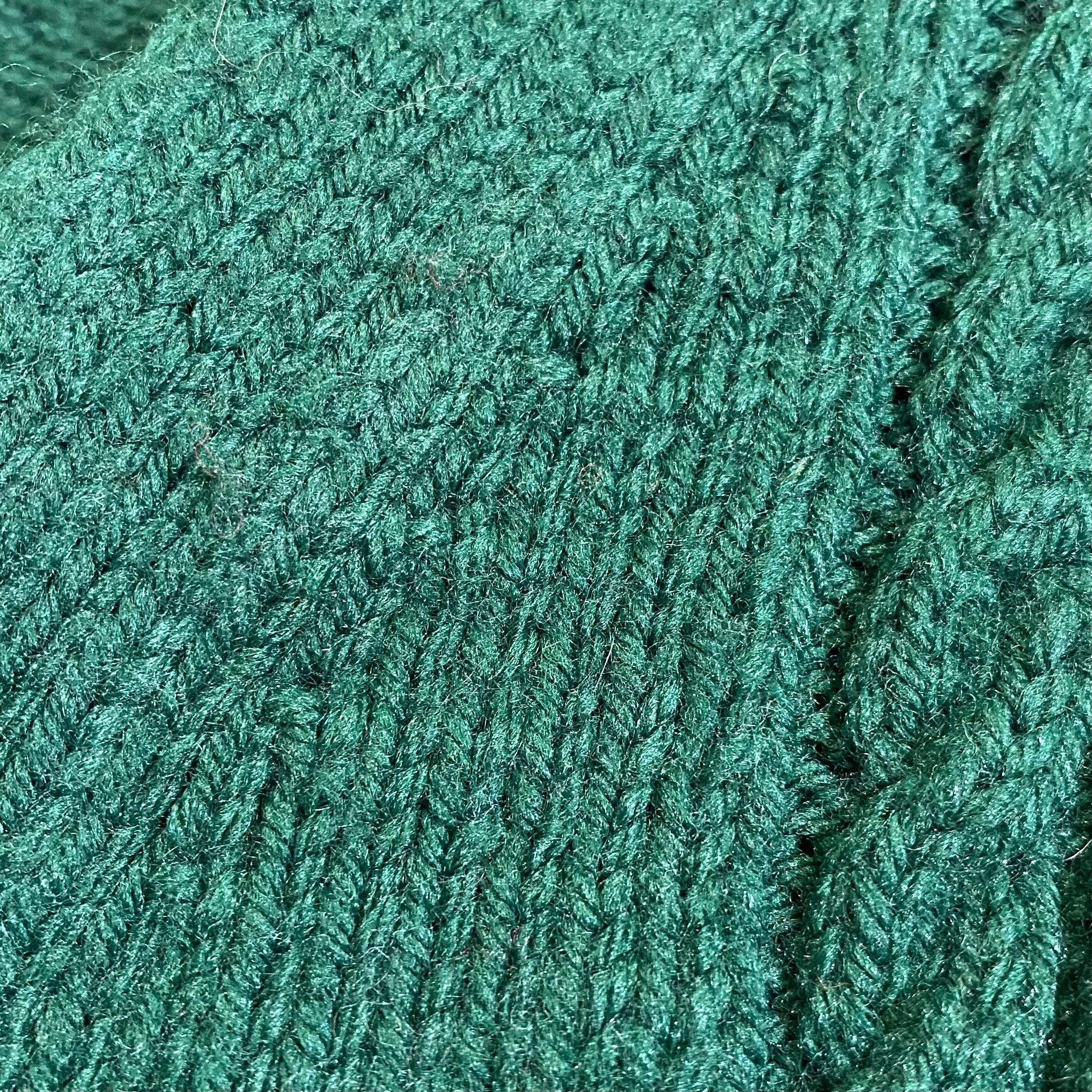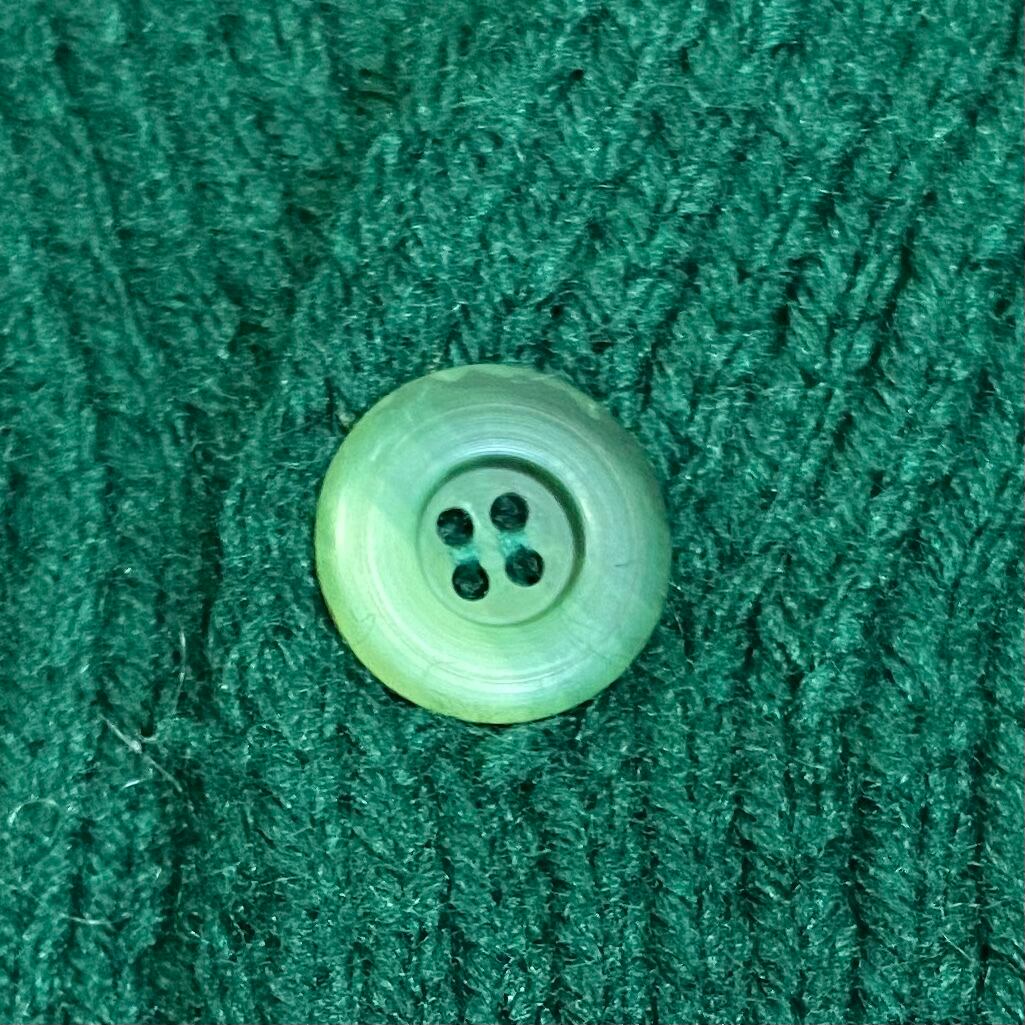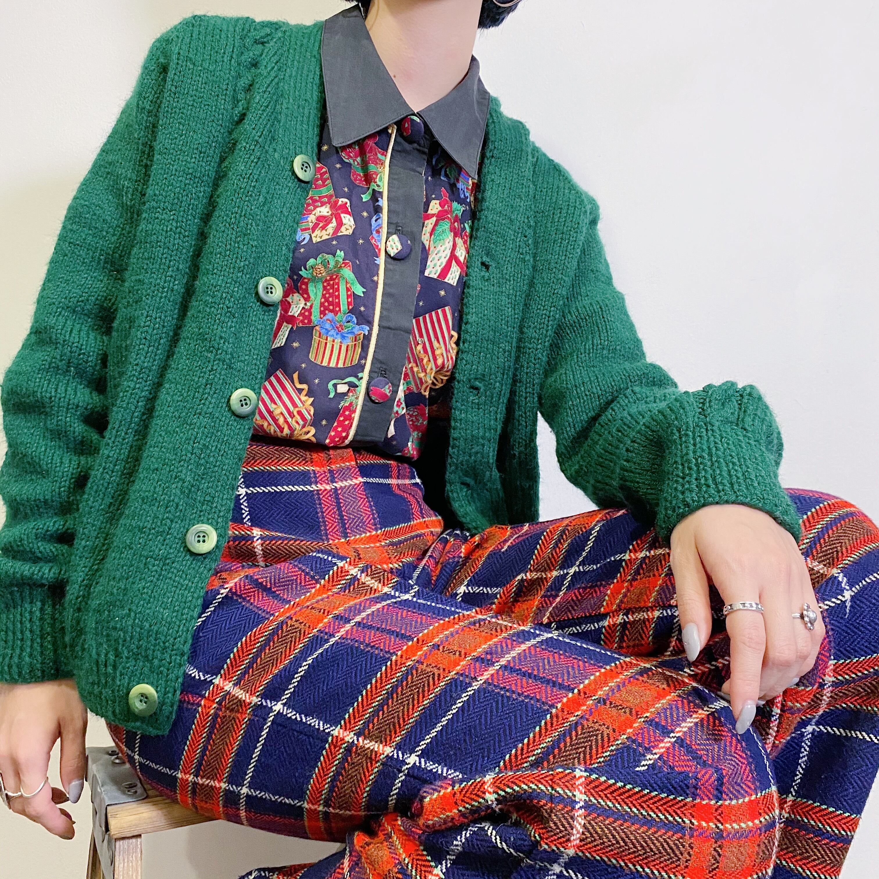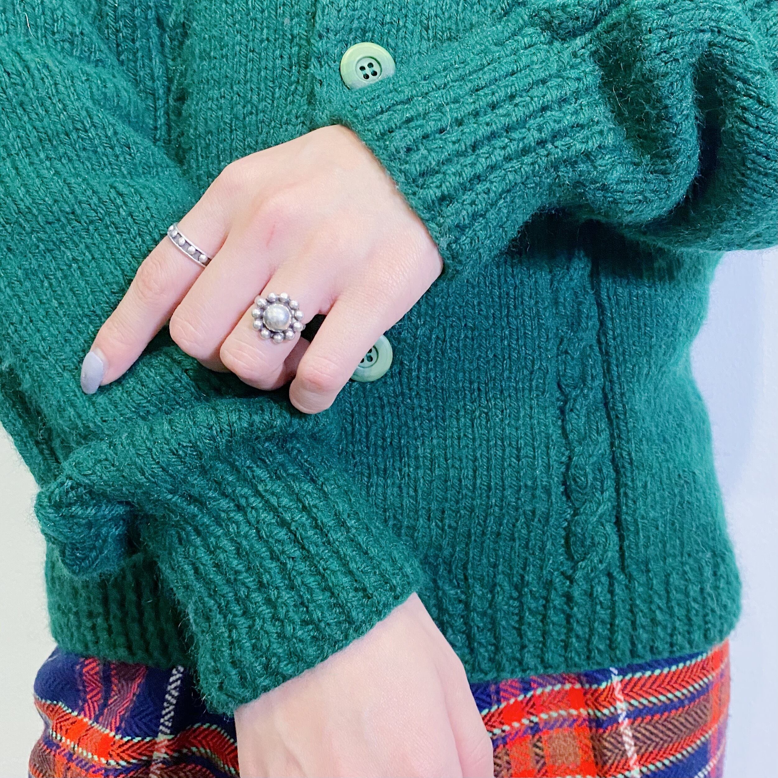 深めのグリーンカラーが素敵で使い勝手の良さそうな、ハンドニットカーディガンです。