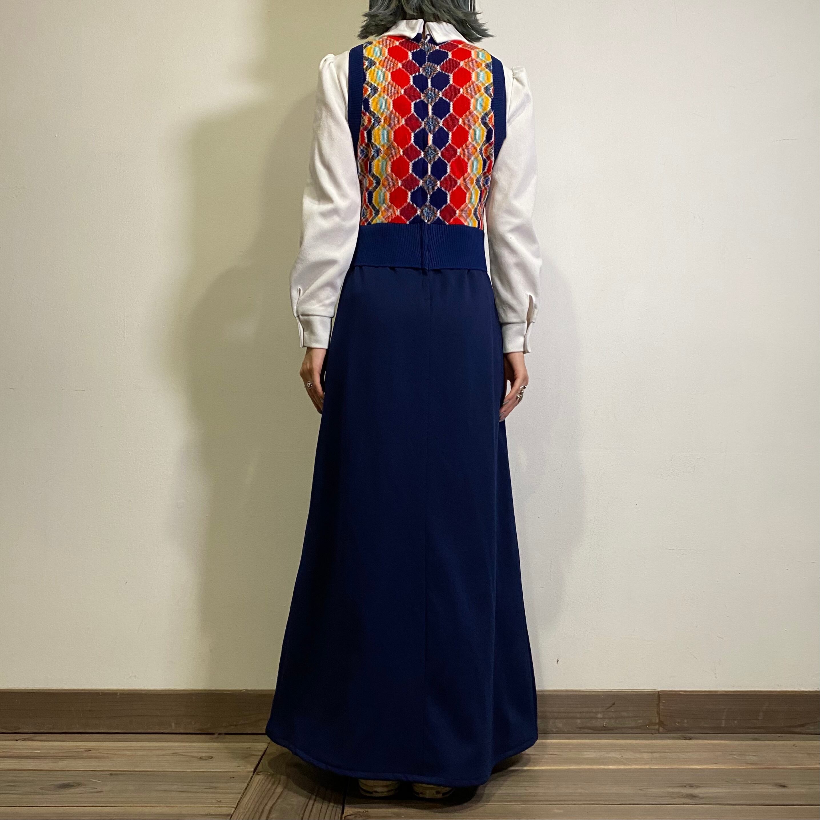 白シャツとスカート、カラフルなベストをのレイヤードスタイルをそのままワンピースにしたようなデザインがかわいい、70年代のワンピースです。