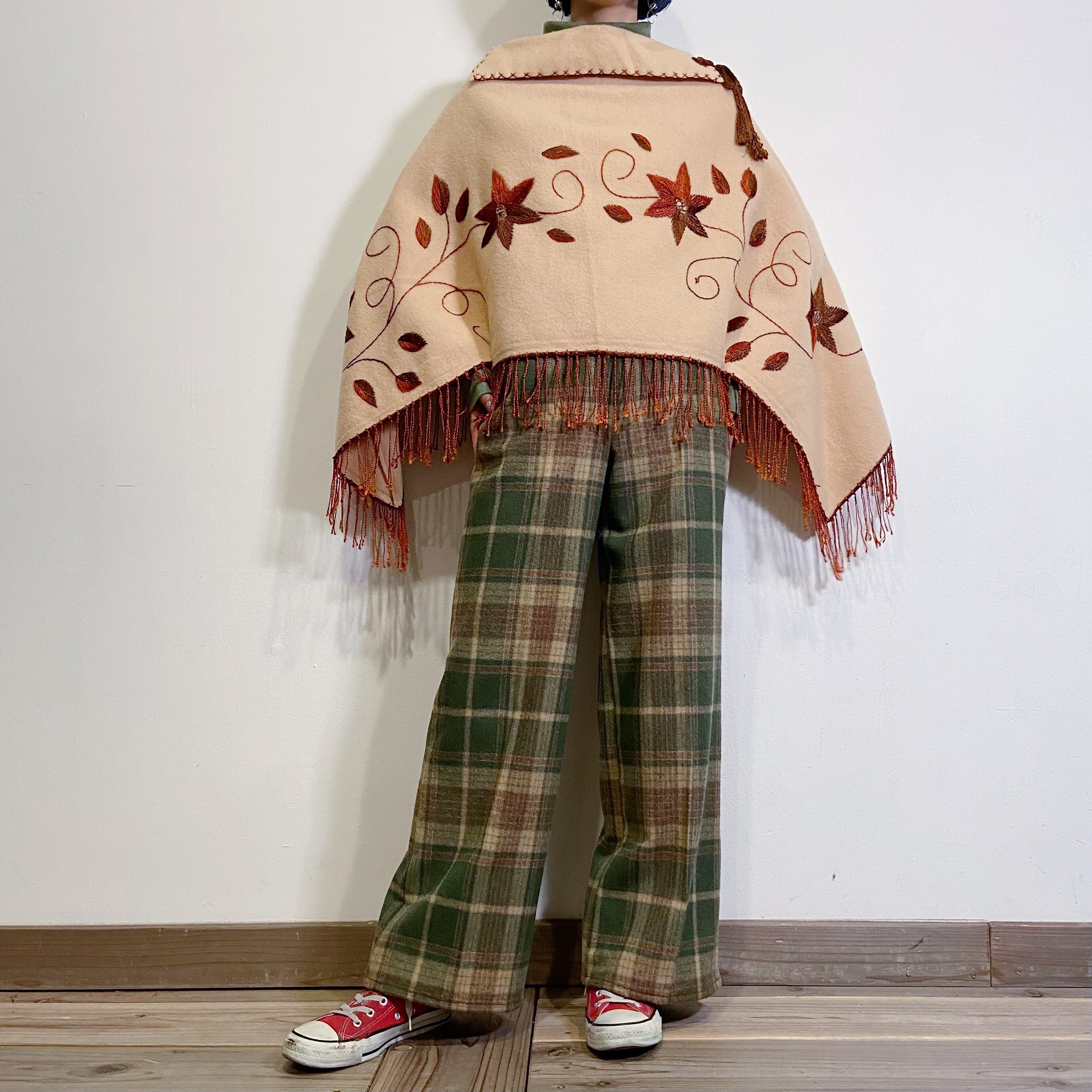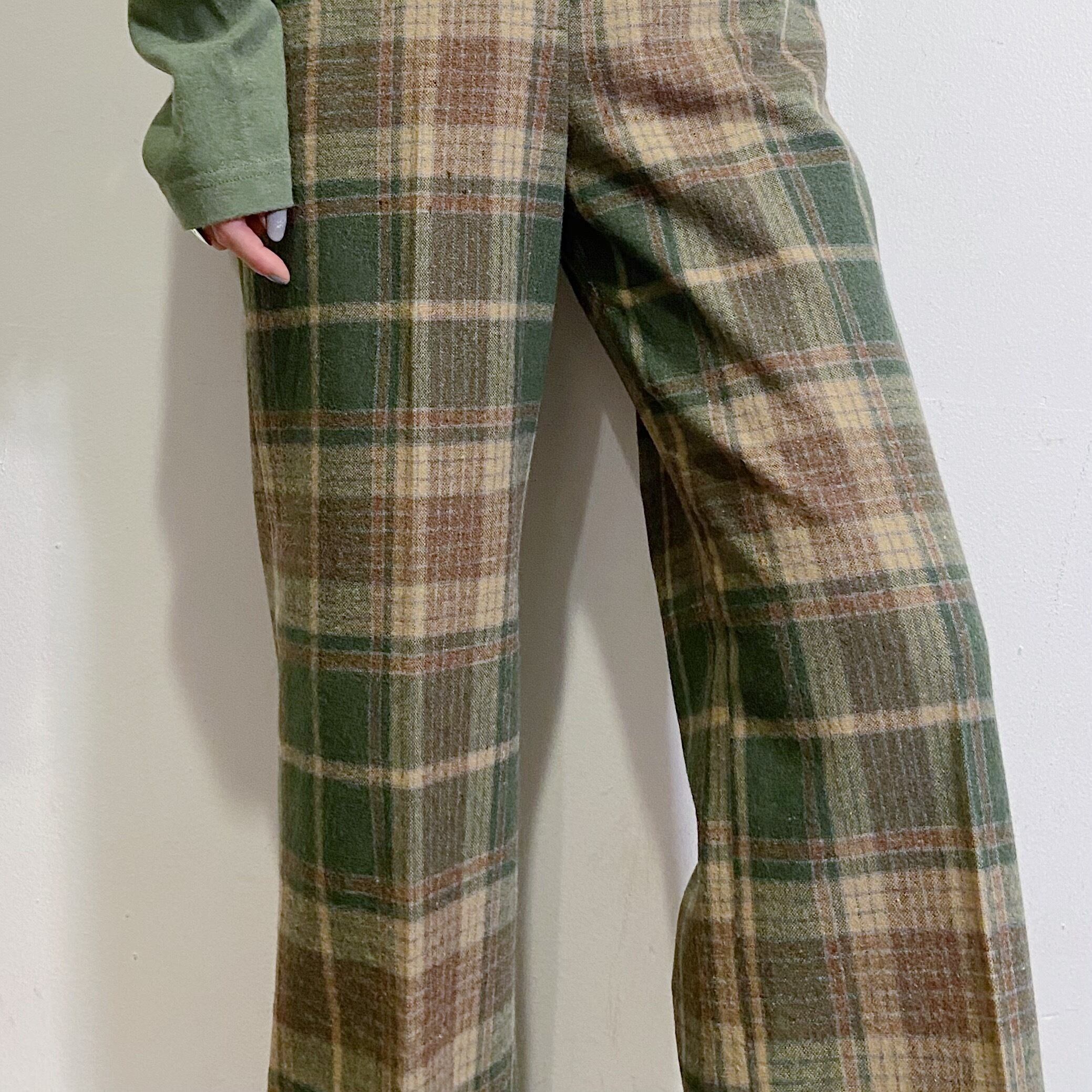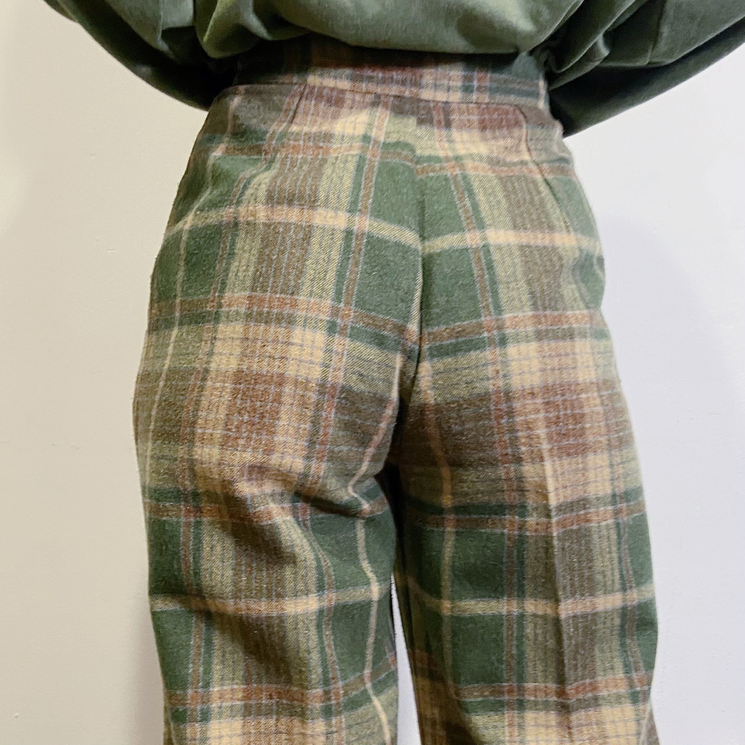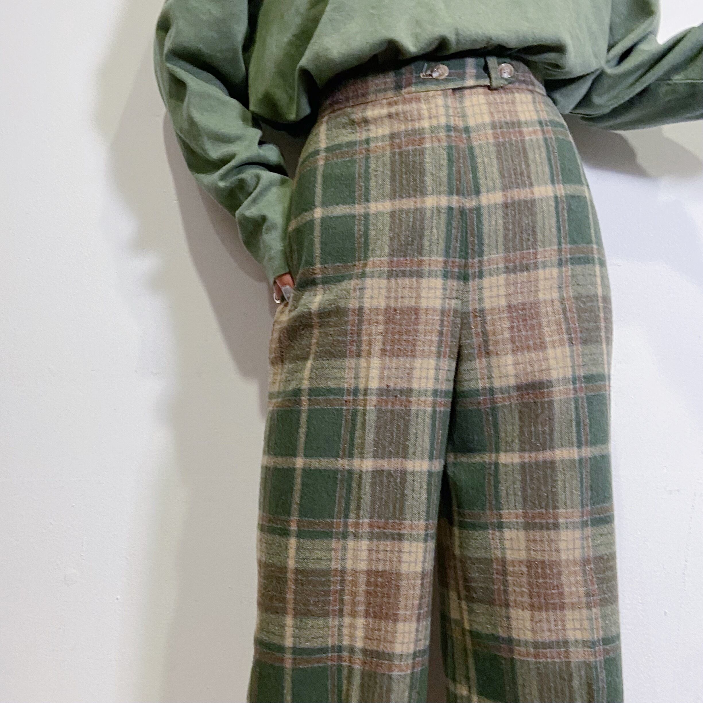 グリーンとブラウンの色合いが可愛い70年代のチェックパンツです。