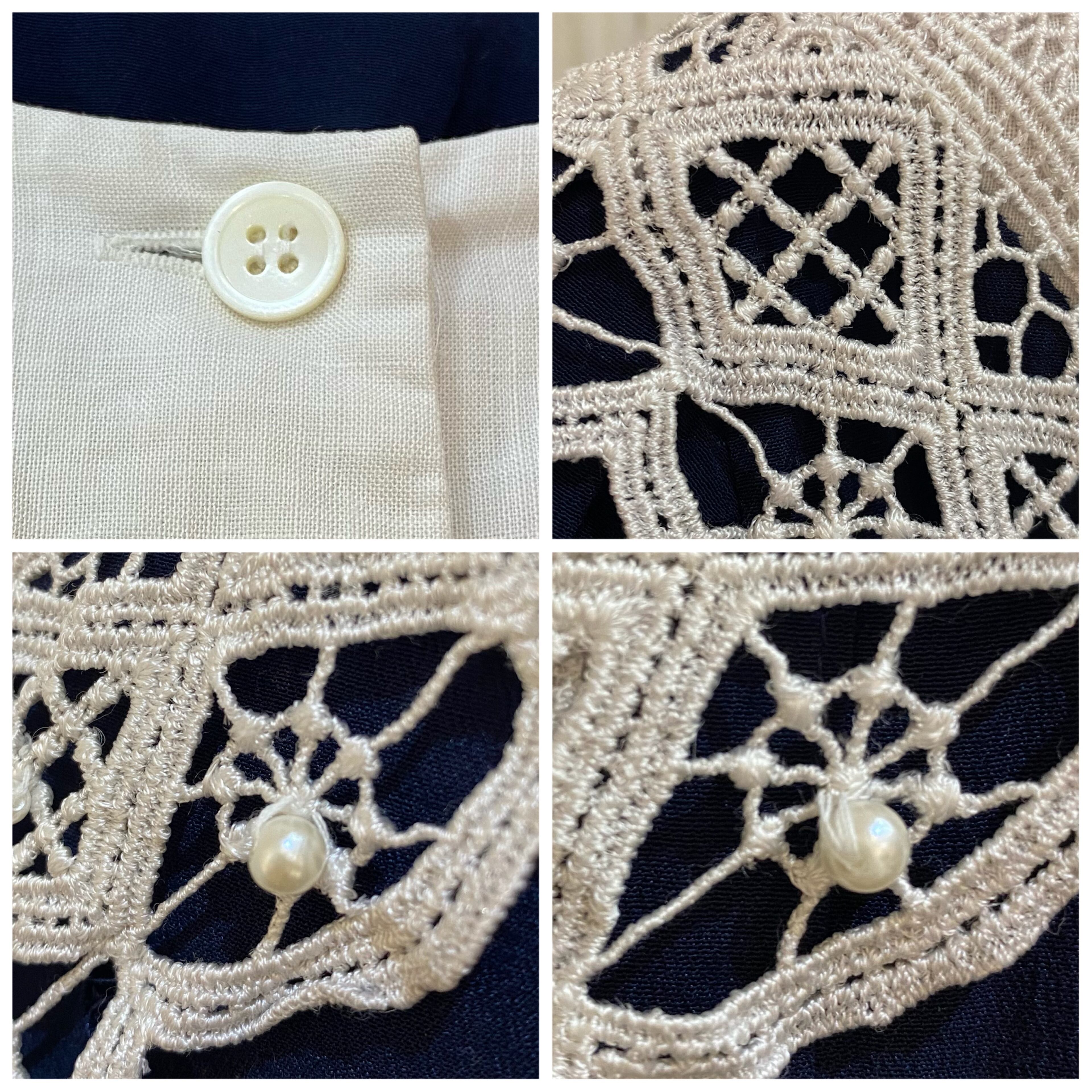 ネイビーベースに白の大きなレース襟とパールの装飾が可愛い、80年代のワンピースです。