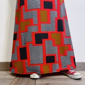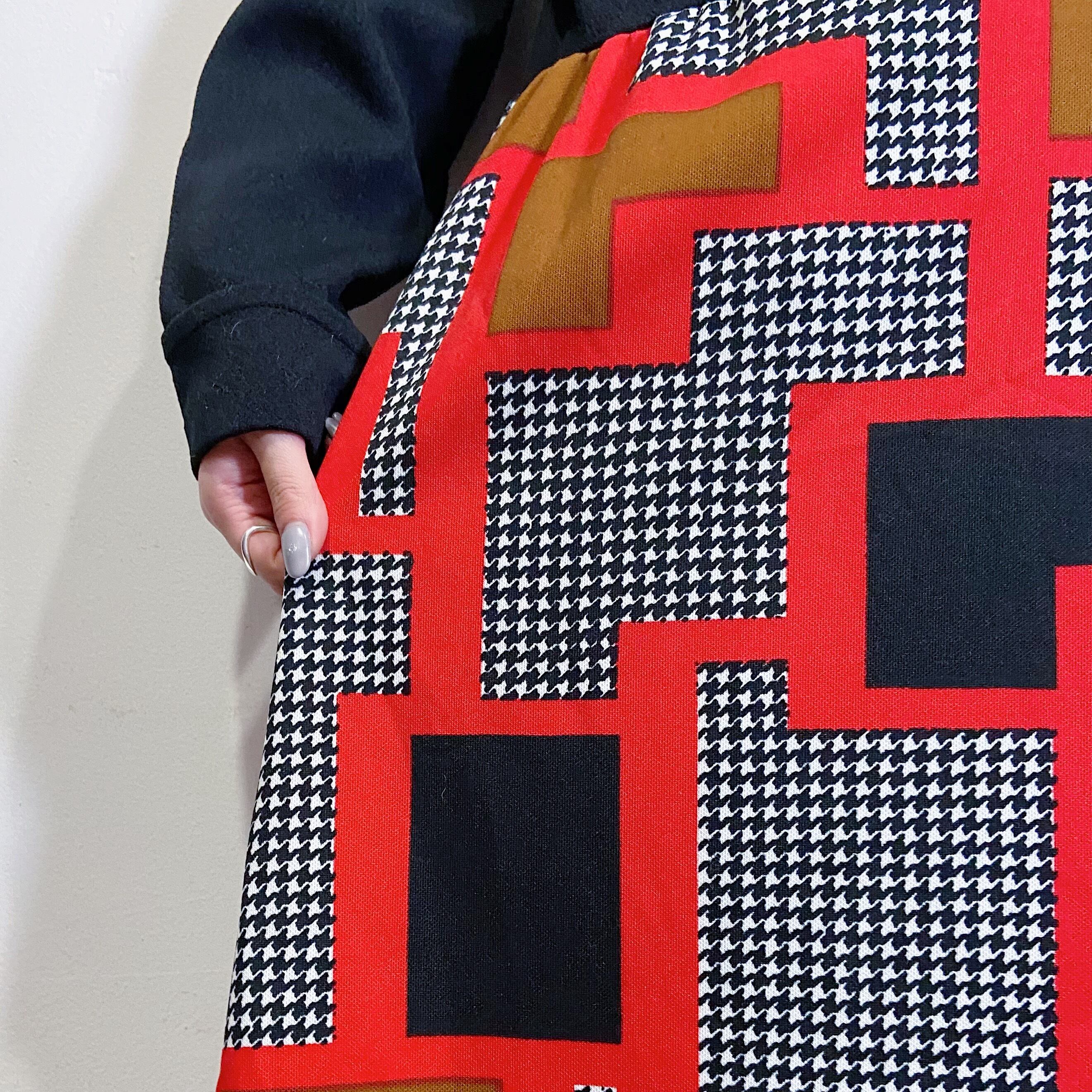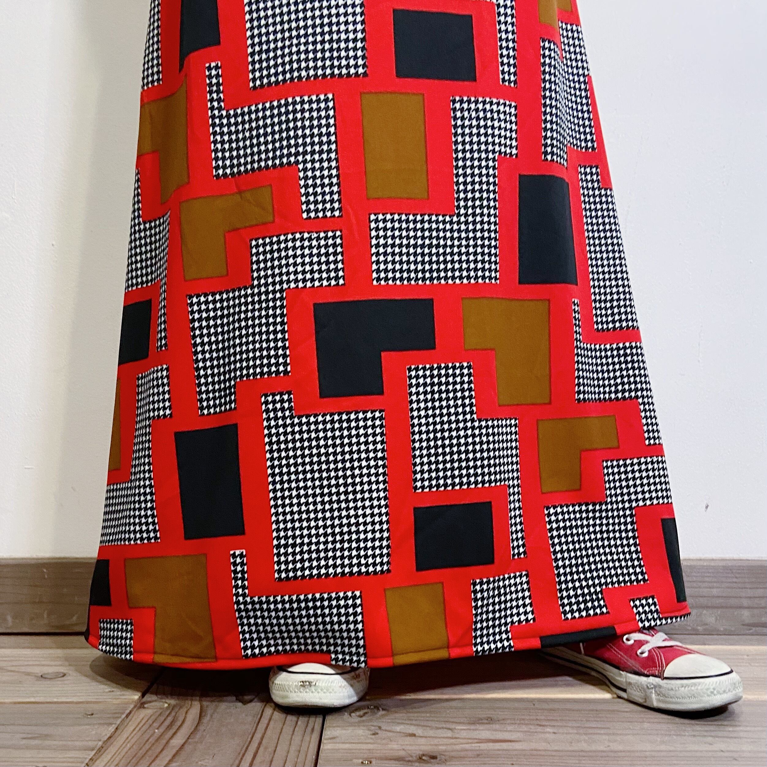 アールデコ調の幾何学模様のような、不思議な柄が大人可愛い70年代のワンピースです。