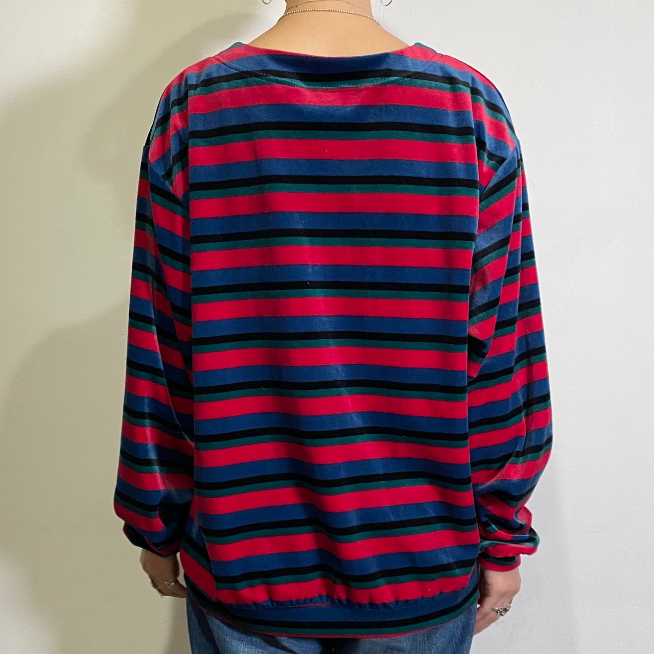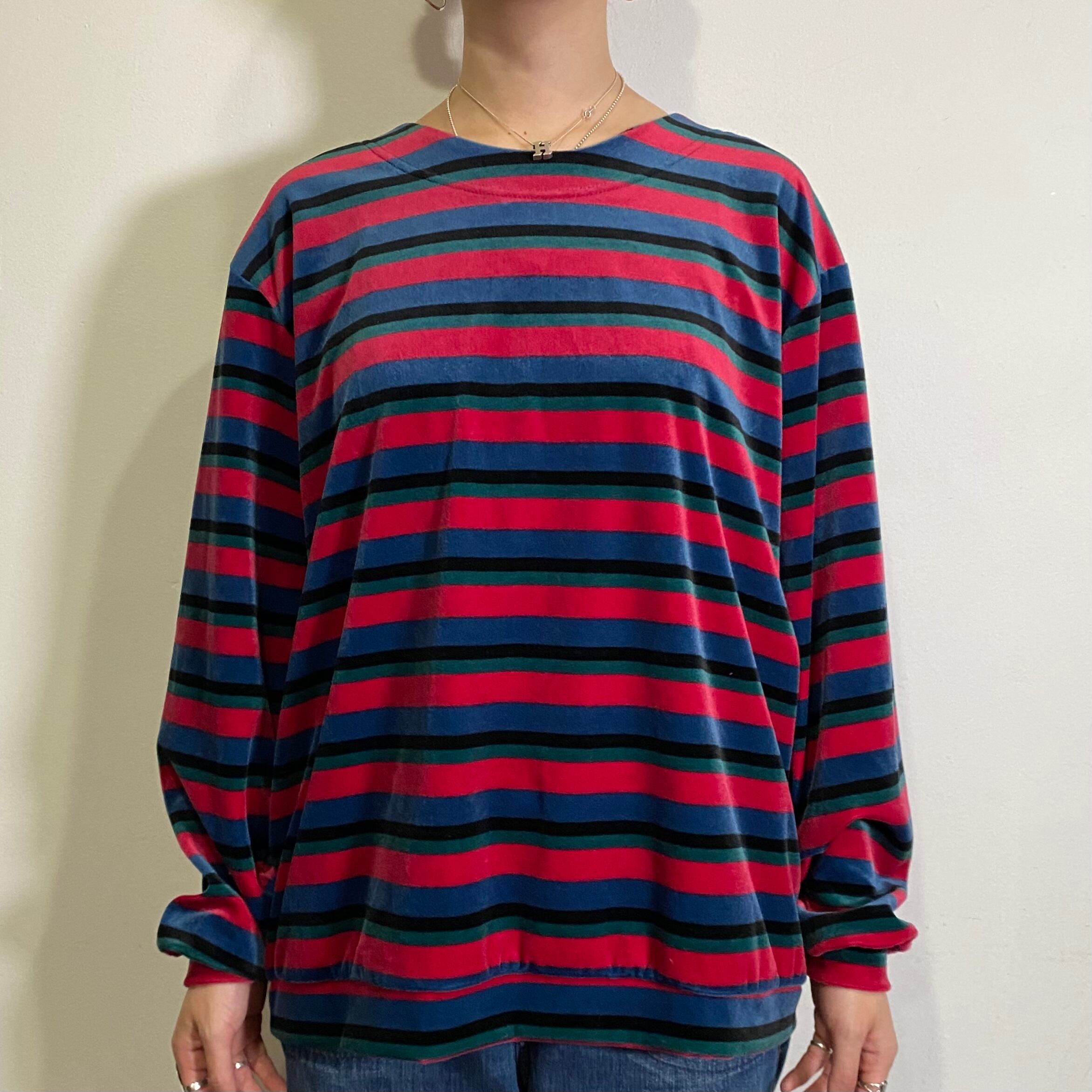 ピンクやブルーのマルチカラーが可愛い、ベロア素材の長袖トップスです。