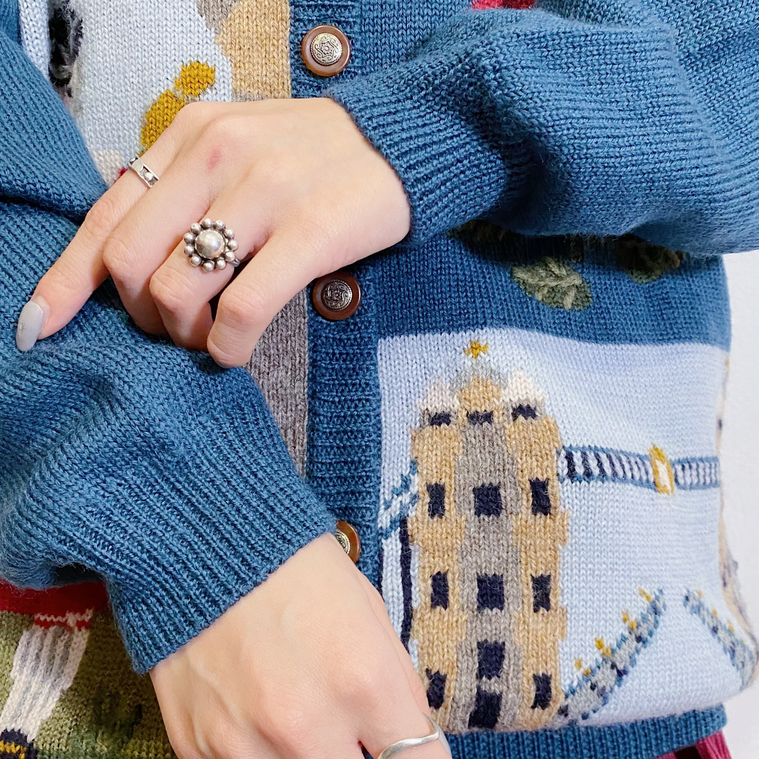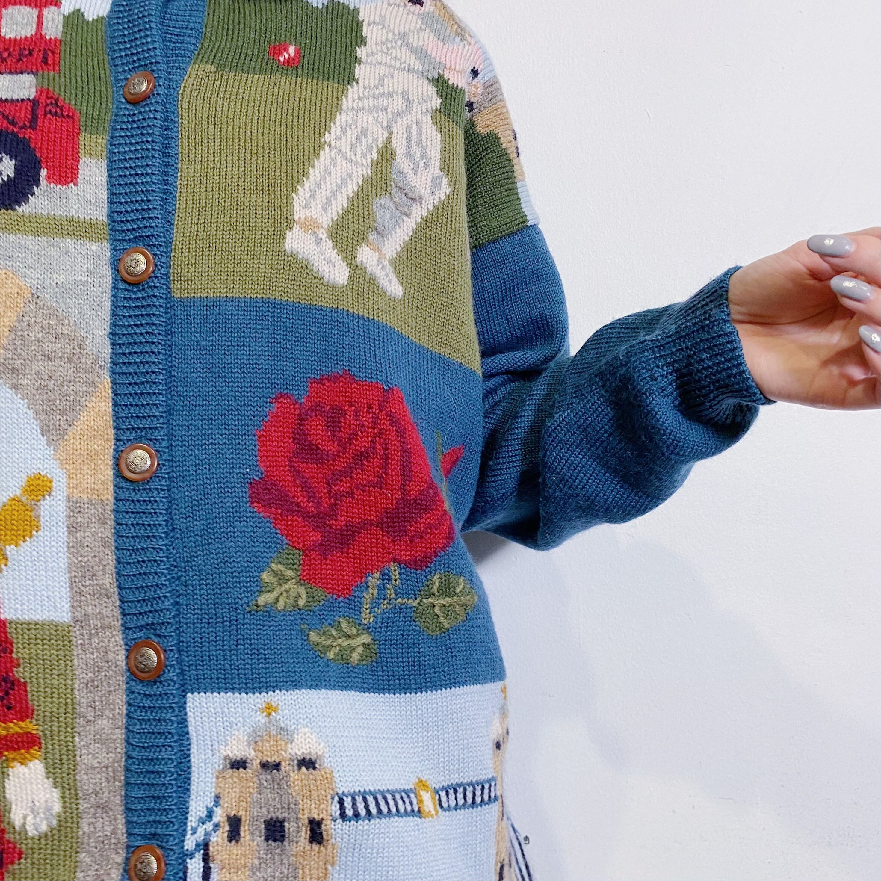 ロンドンバスやクリケットなどのモチーフがシュールでキュートなカーディガンです。
