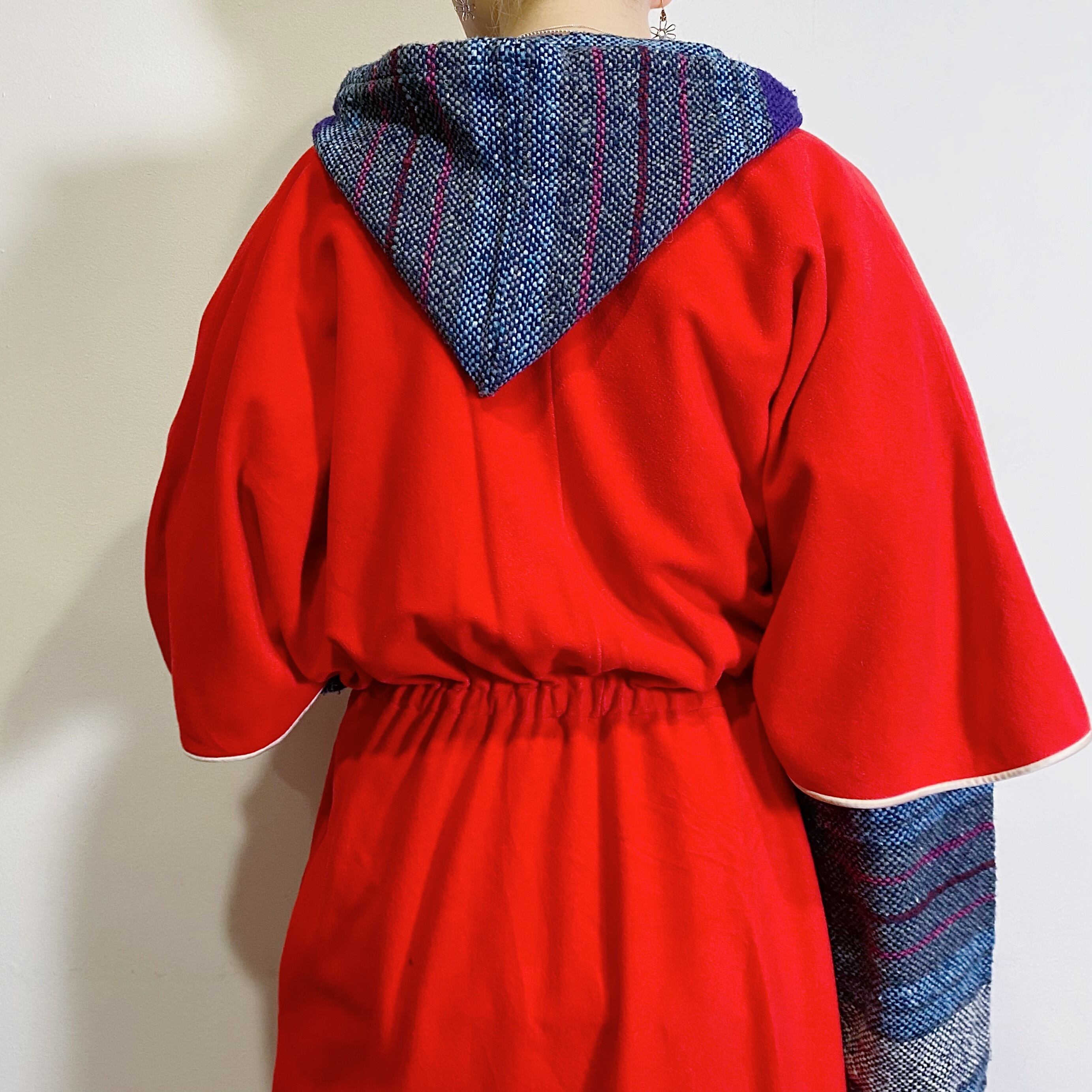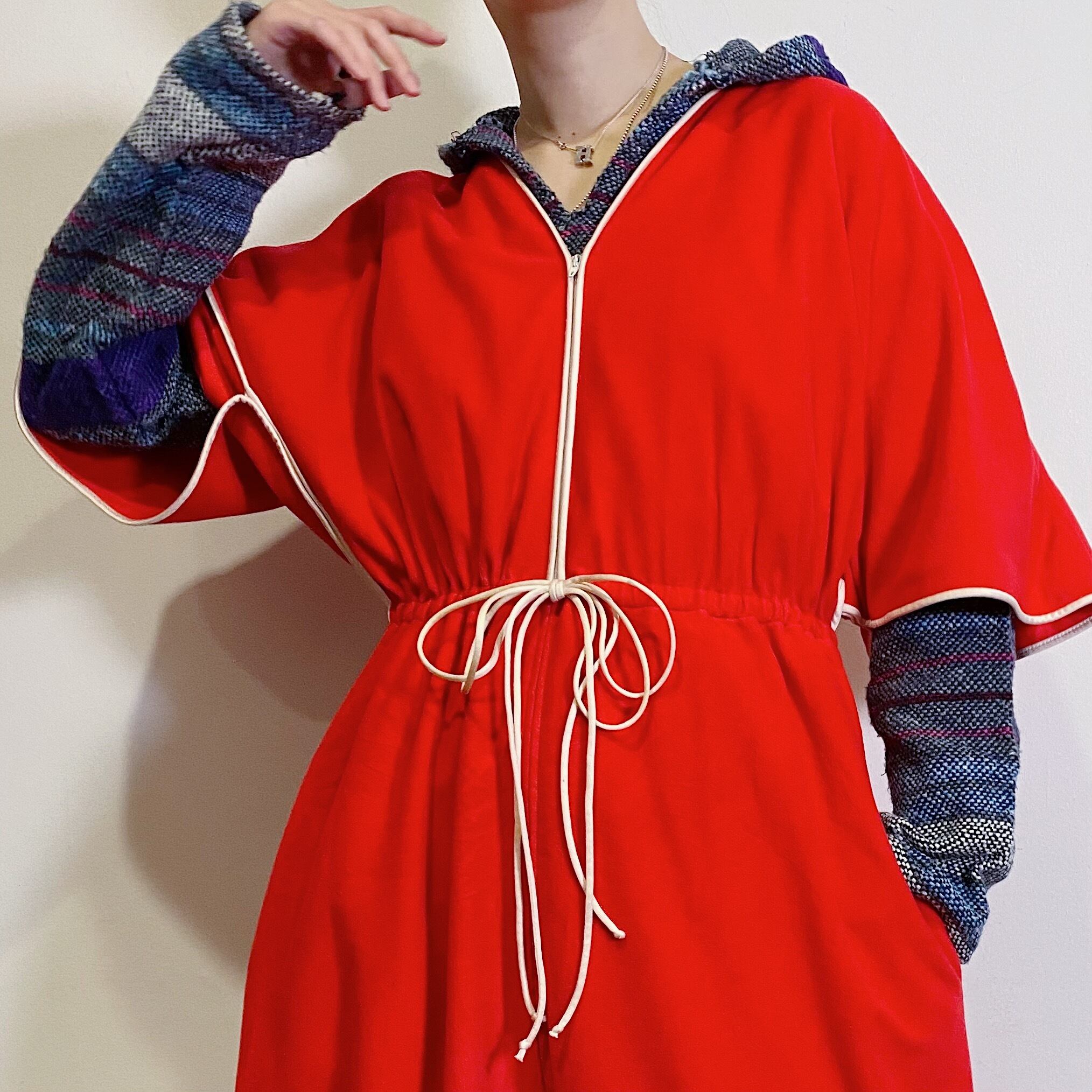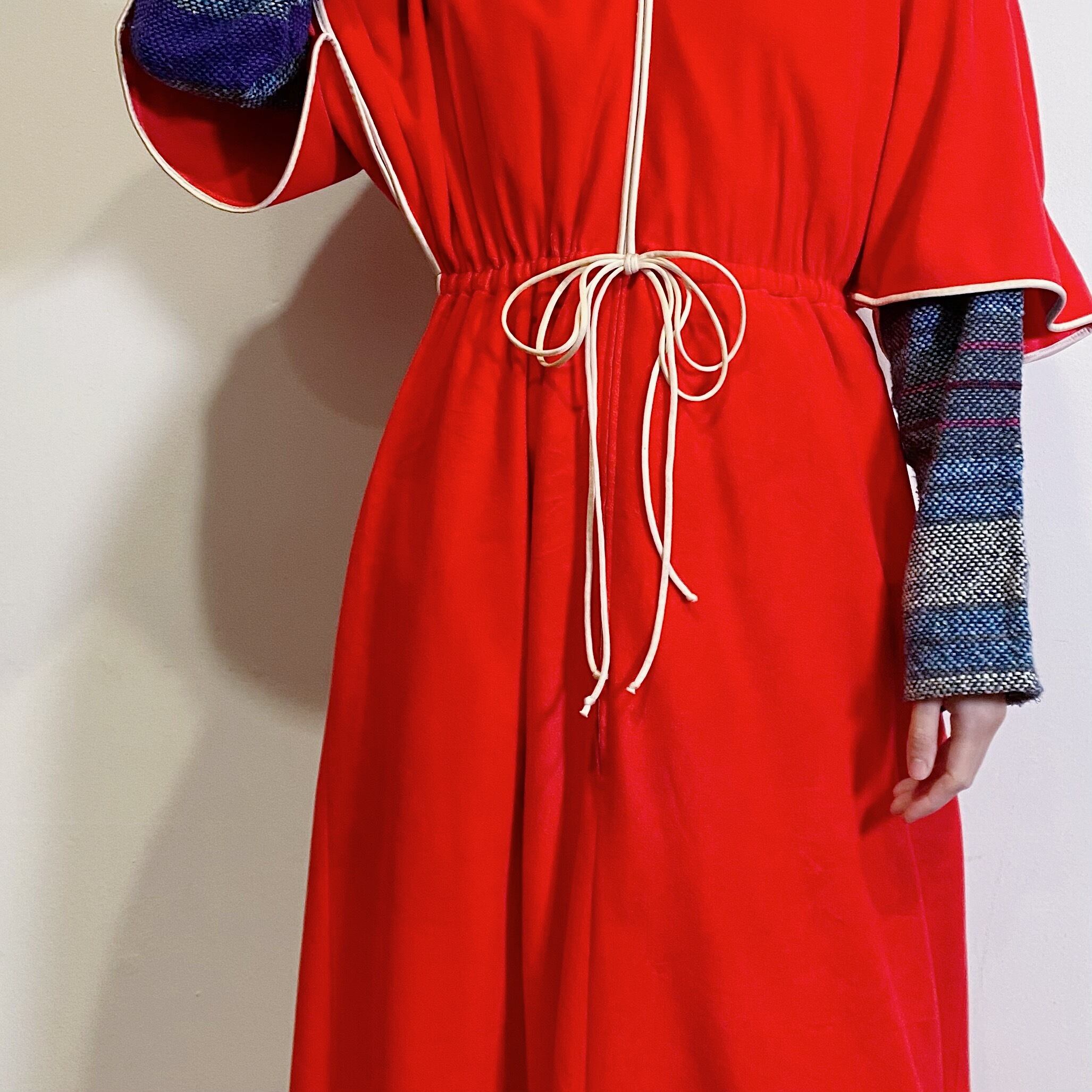 鮮やかなレッドカラーにフレアスリーブ、白いパイピングが可愛い70年代ワンピースです。