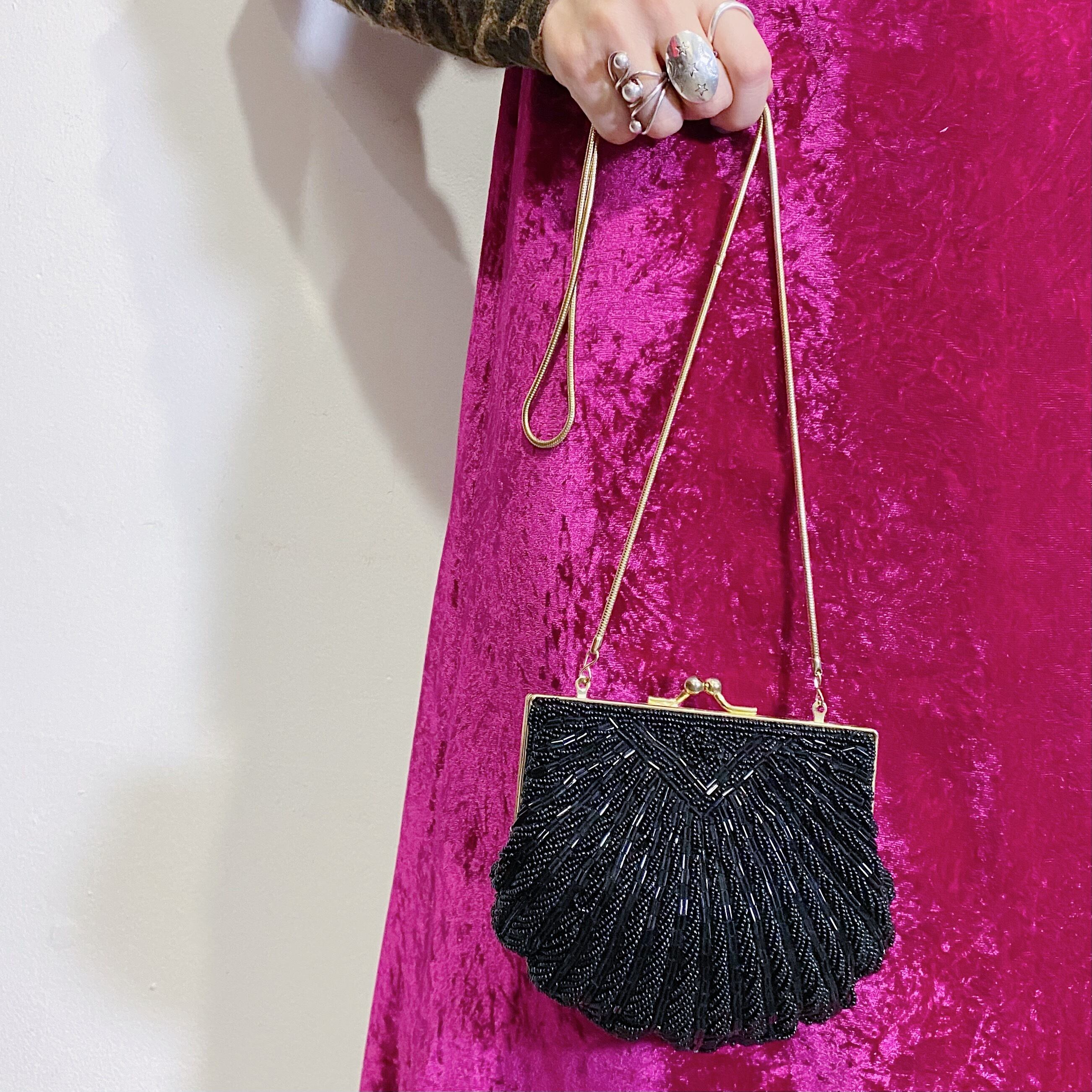 使い勝手の良い黒ベースにシェルモチーフが可愛い、80年代のビーズバッグです。