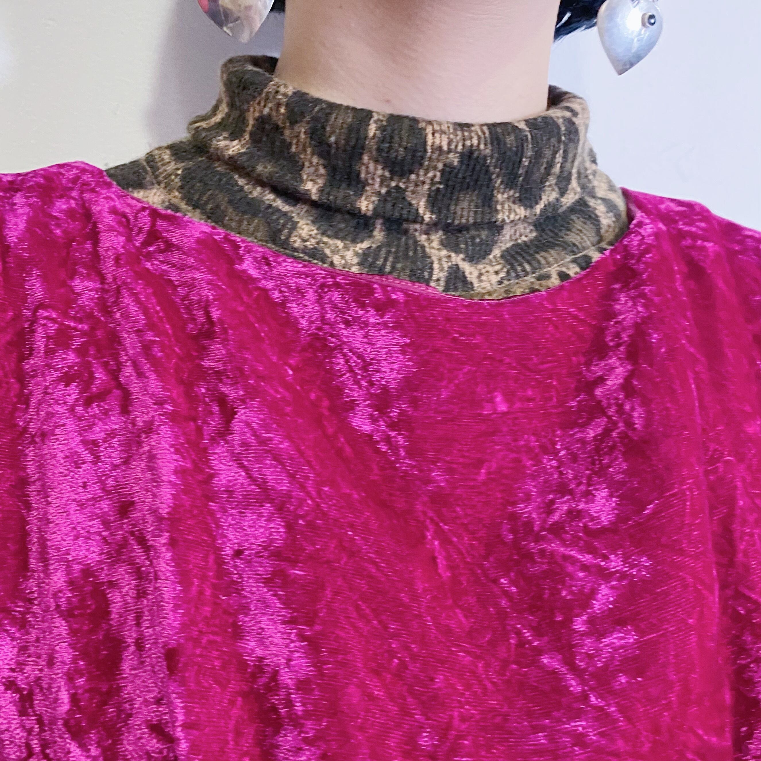 着用写真のようにハイネックを合わせても、大きな襟の付いたブラウスなどを重ねても可愛いです。