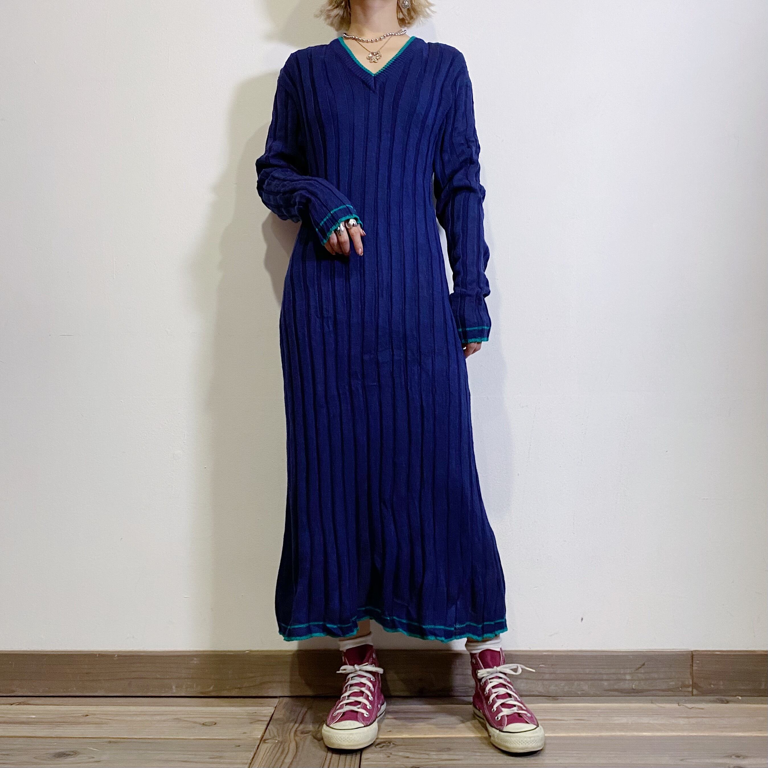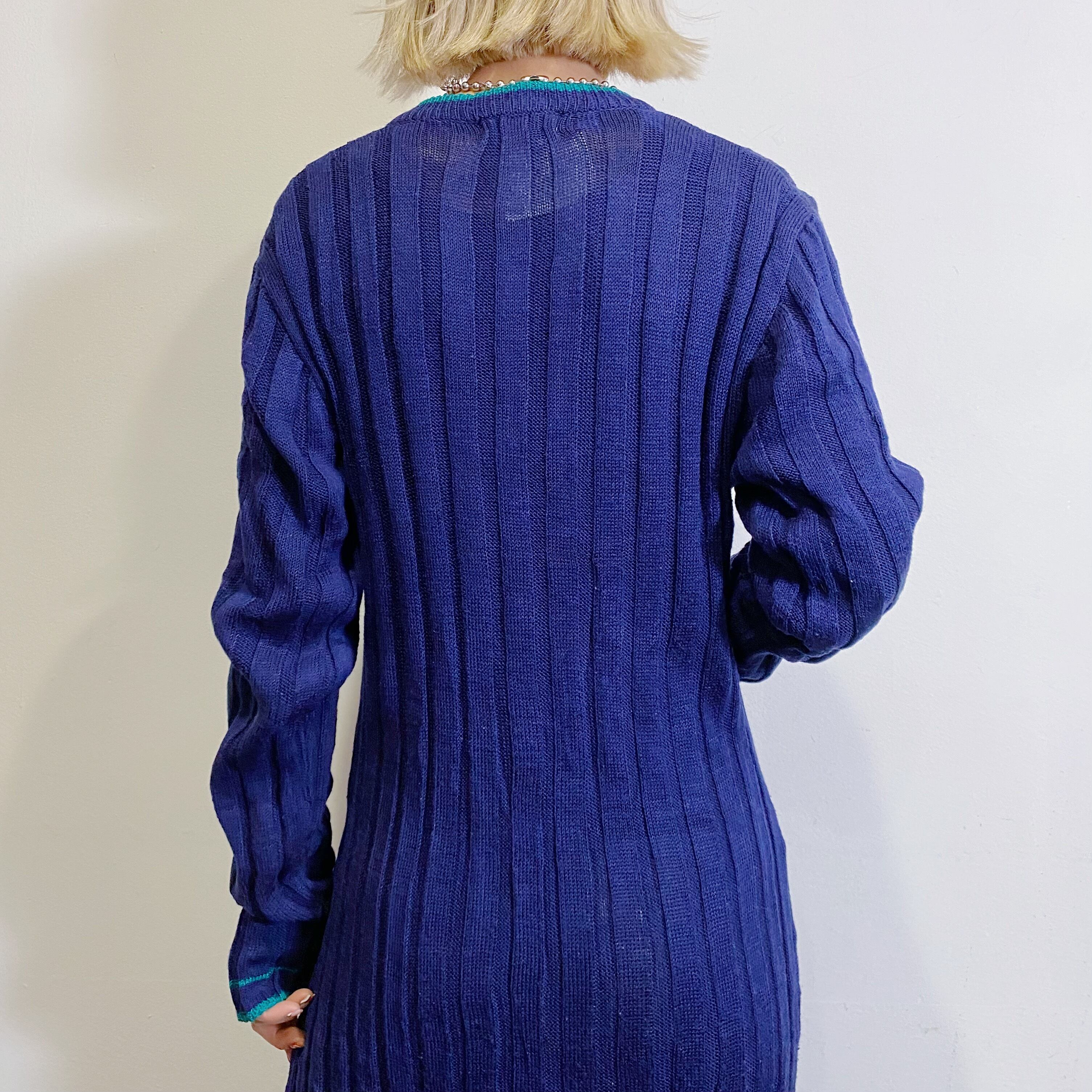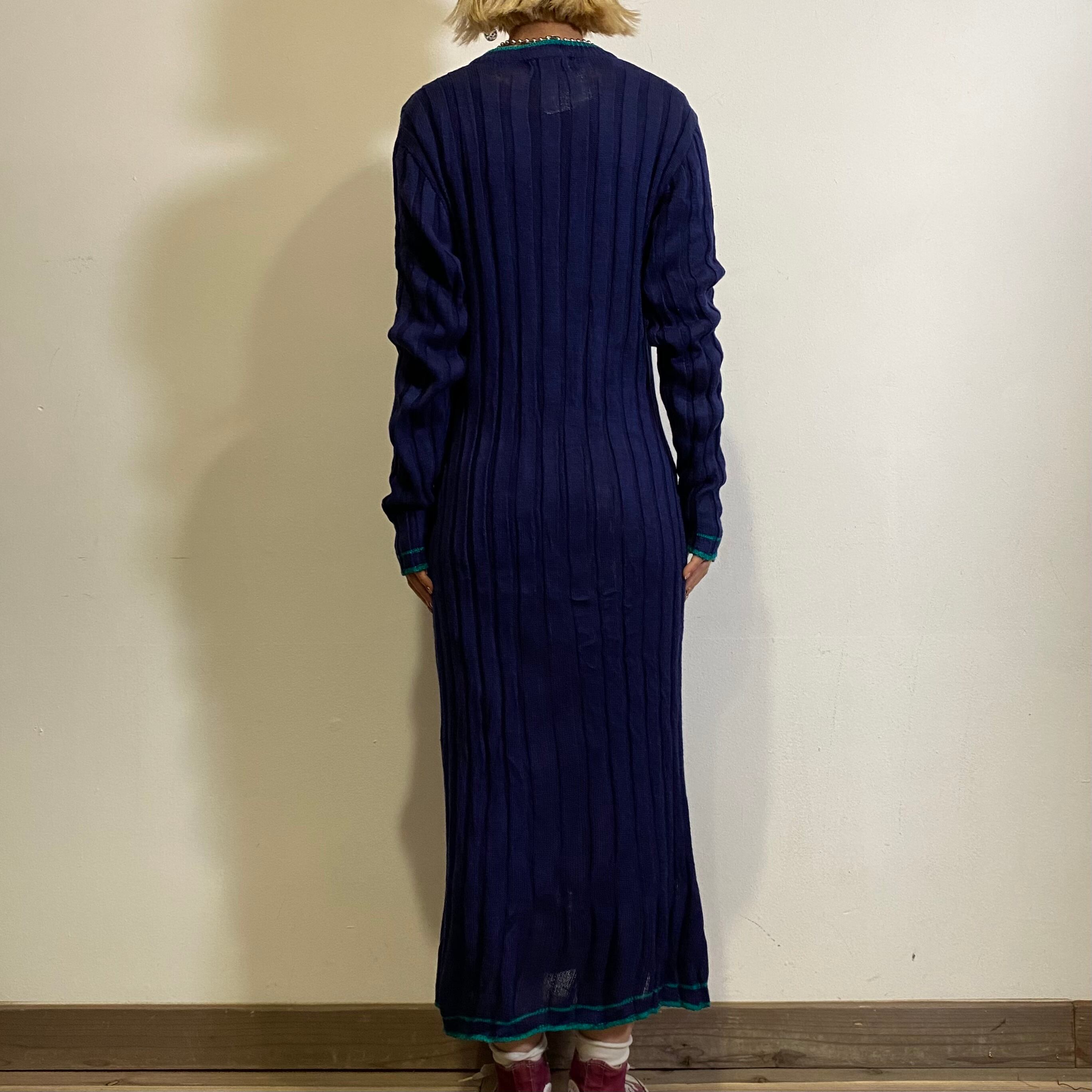 ネイビーベースにターコイズブルーのラインがポイントの80年代ニットワンピースです。