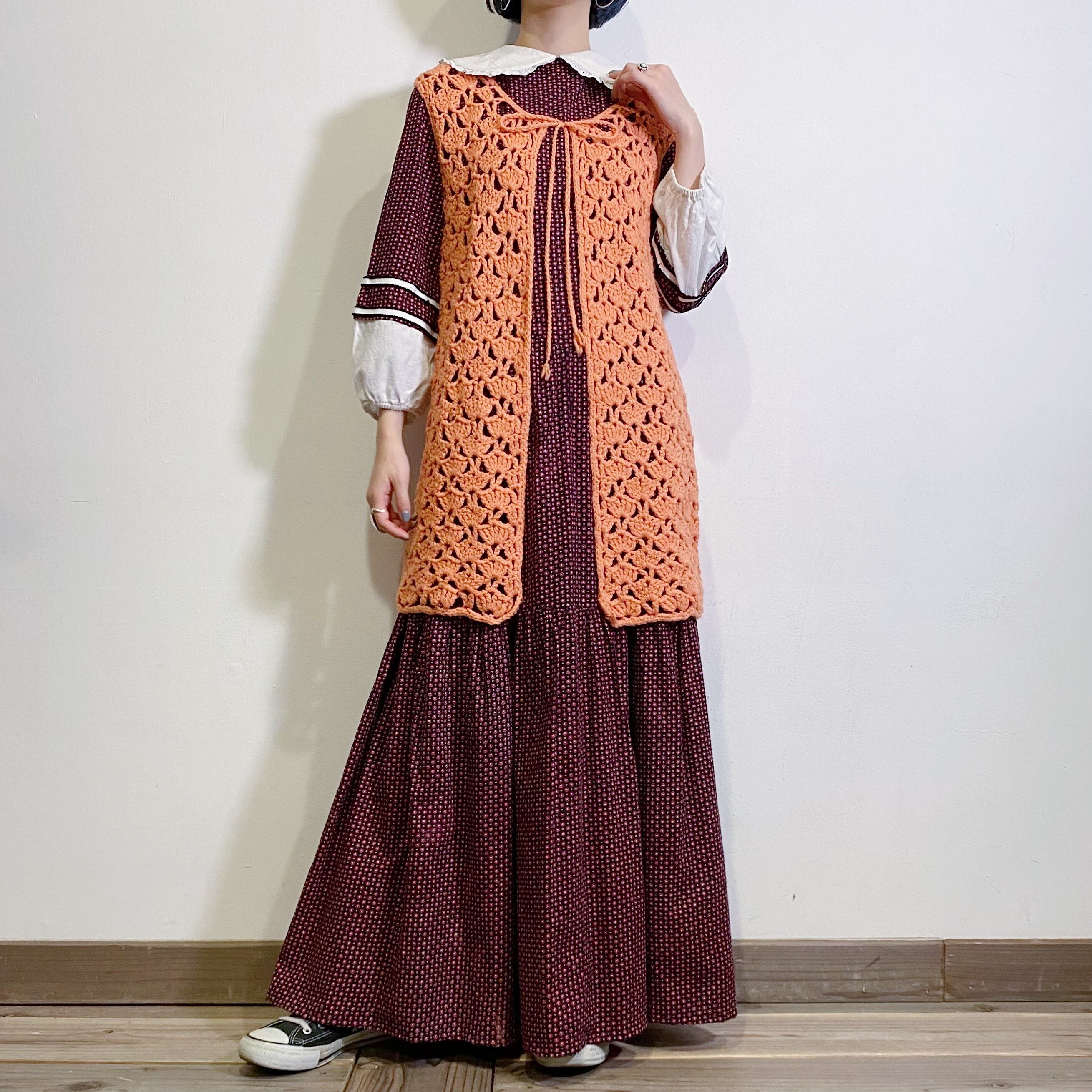 サーモンピンクに近い色合いのオレンジが可愛い、70年代の手編みのニットベストです。
