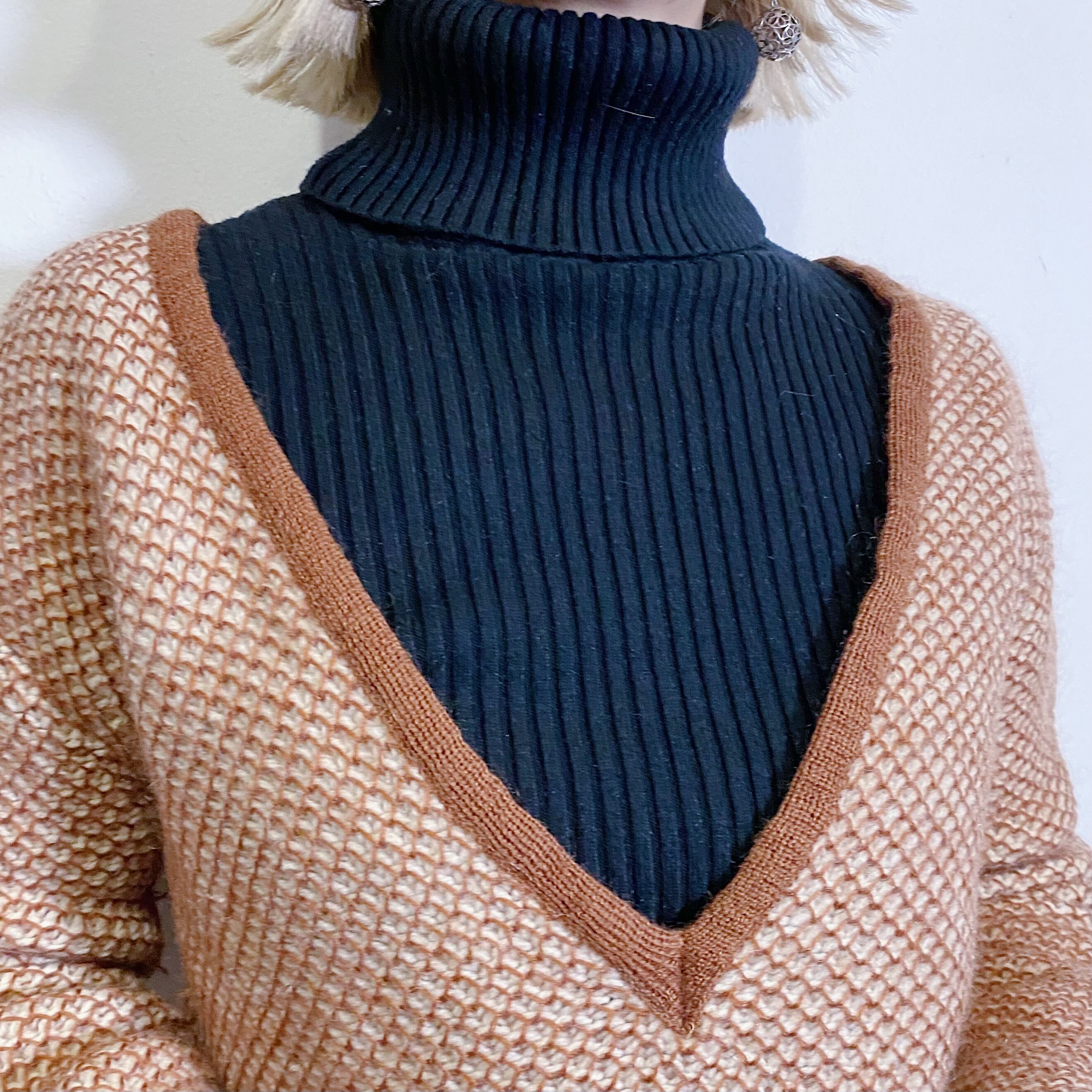 深めのVネックもポイントで、着用写真のようにタートルニットやブラウス、ボーダーカットソーなどをレイヤードしたスタイルもおススメですよ。