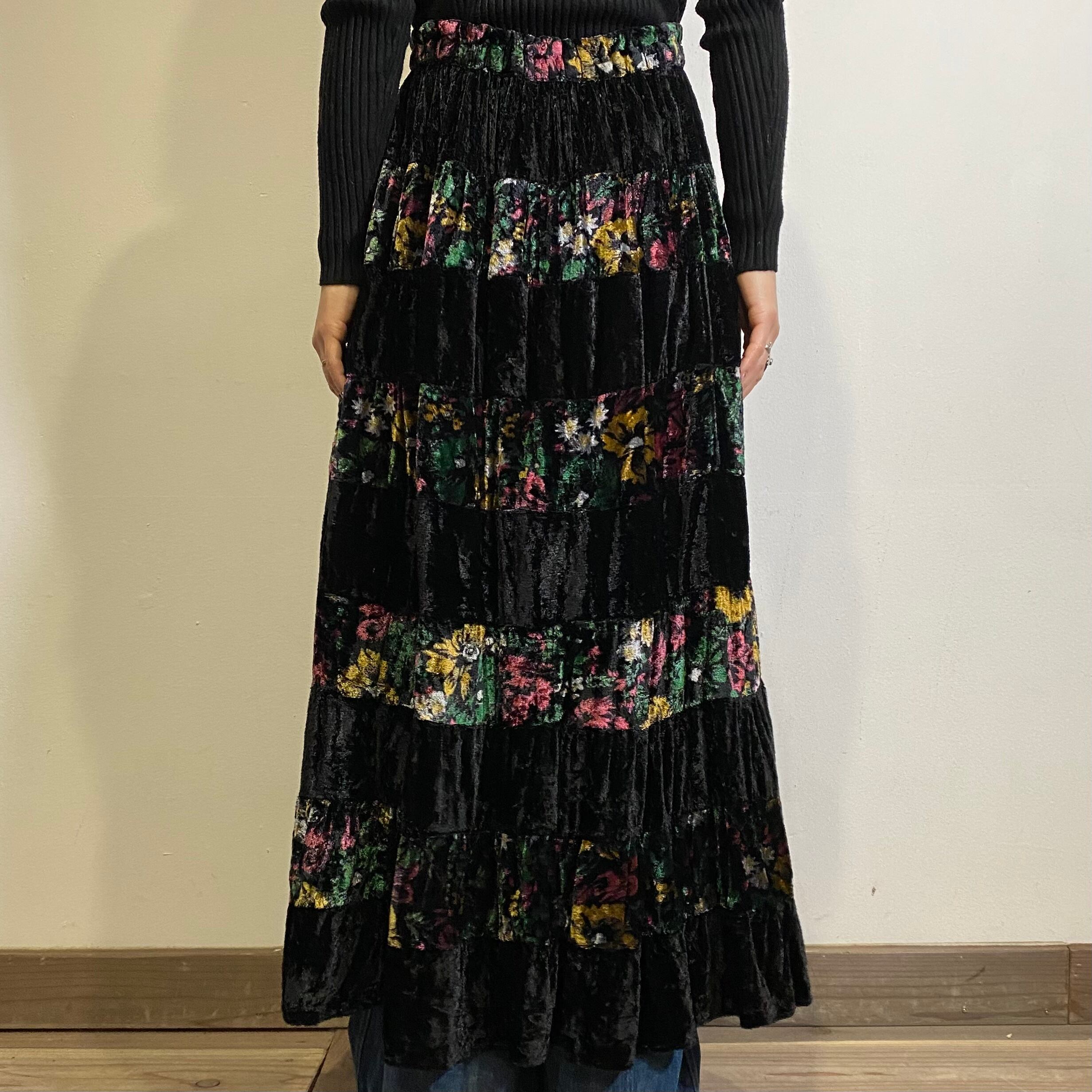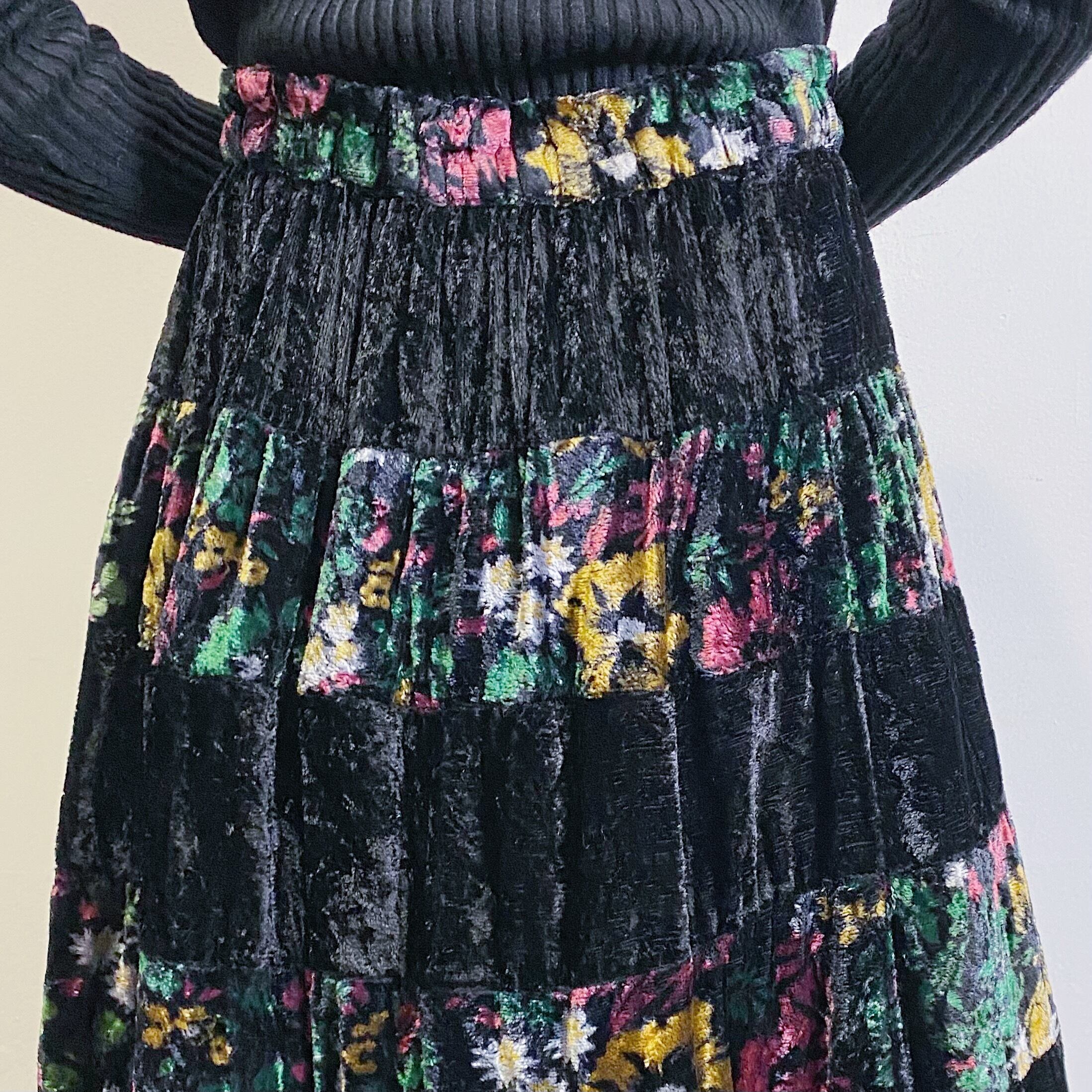 カラフルな花柄と黒の切り替えがかわいい、ベロアロングスカートです。