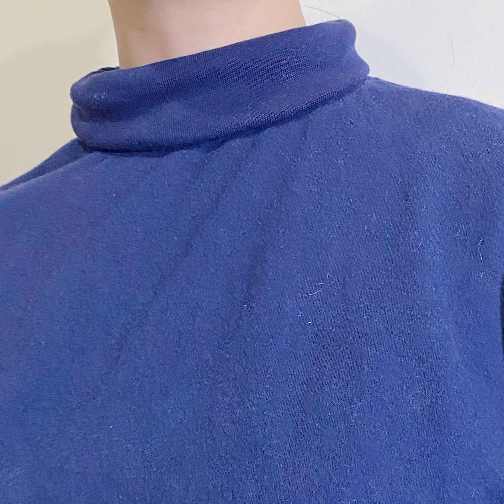 ネイビーカラーで大変使い勝手の良い、コットン素材のハイネックトップスです。