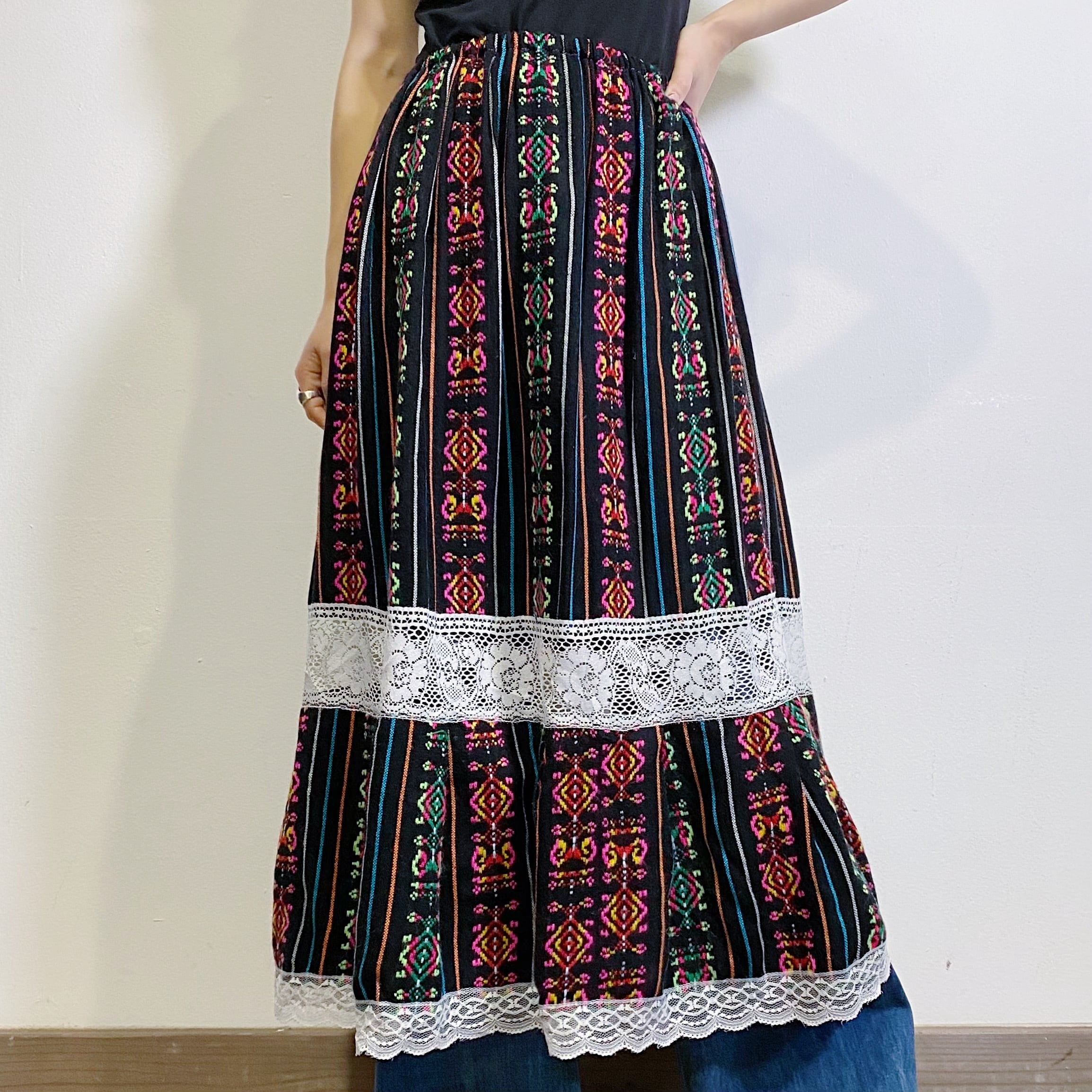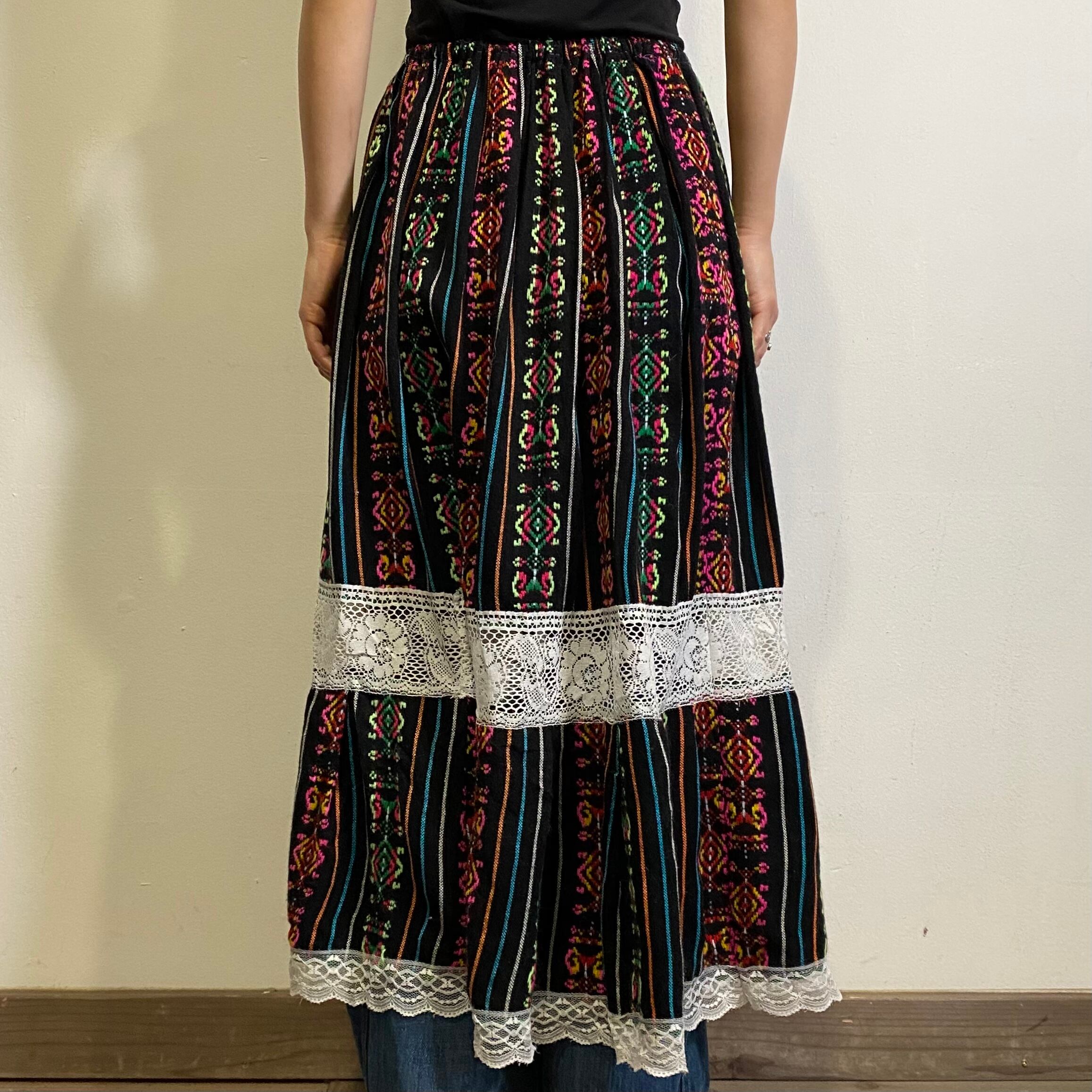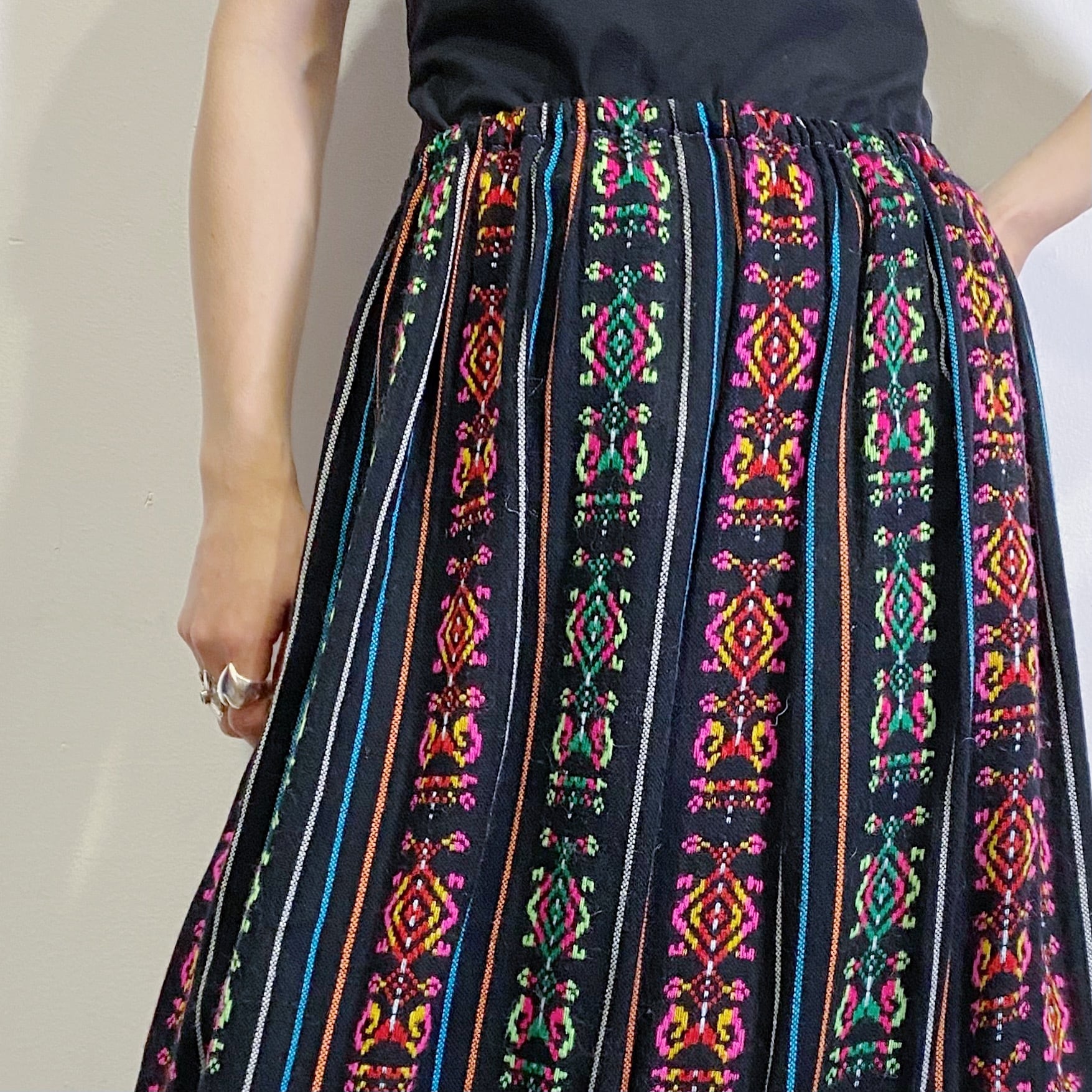 ブラックベースにカラフルなメキシコらしい幾何学模様の刺繍が映えるスカートです。