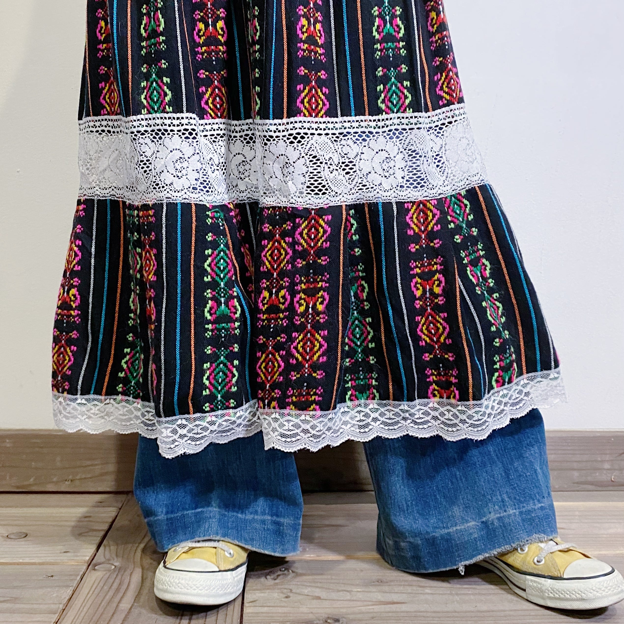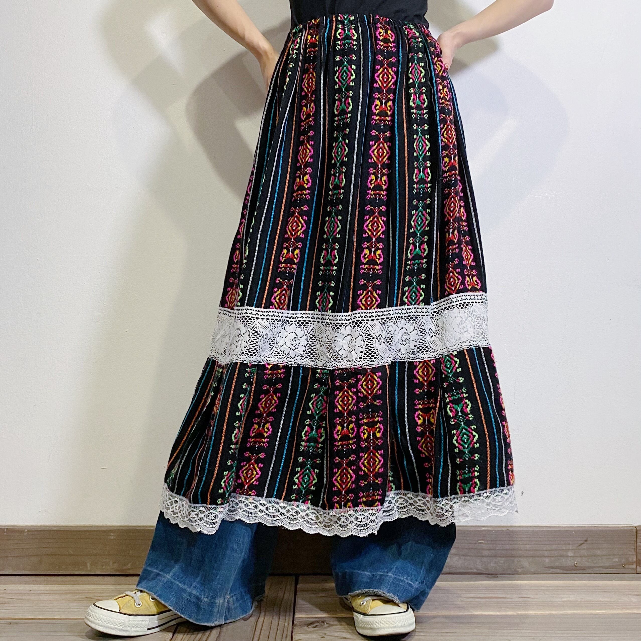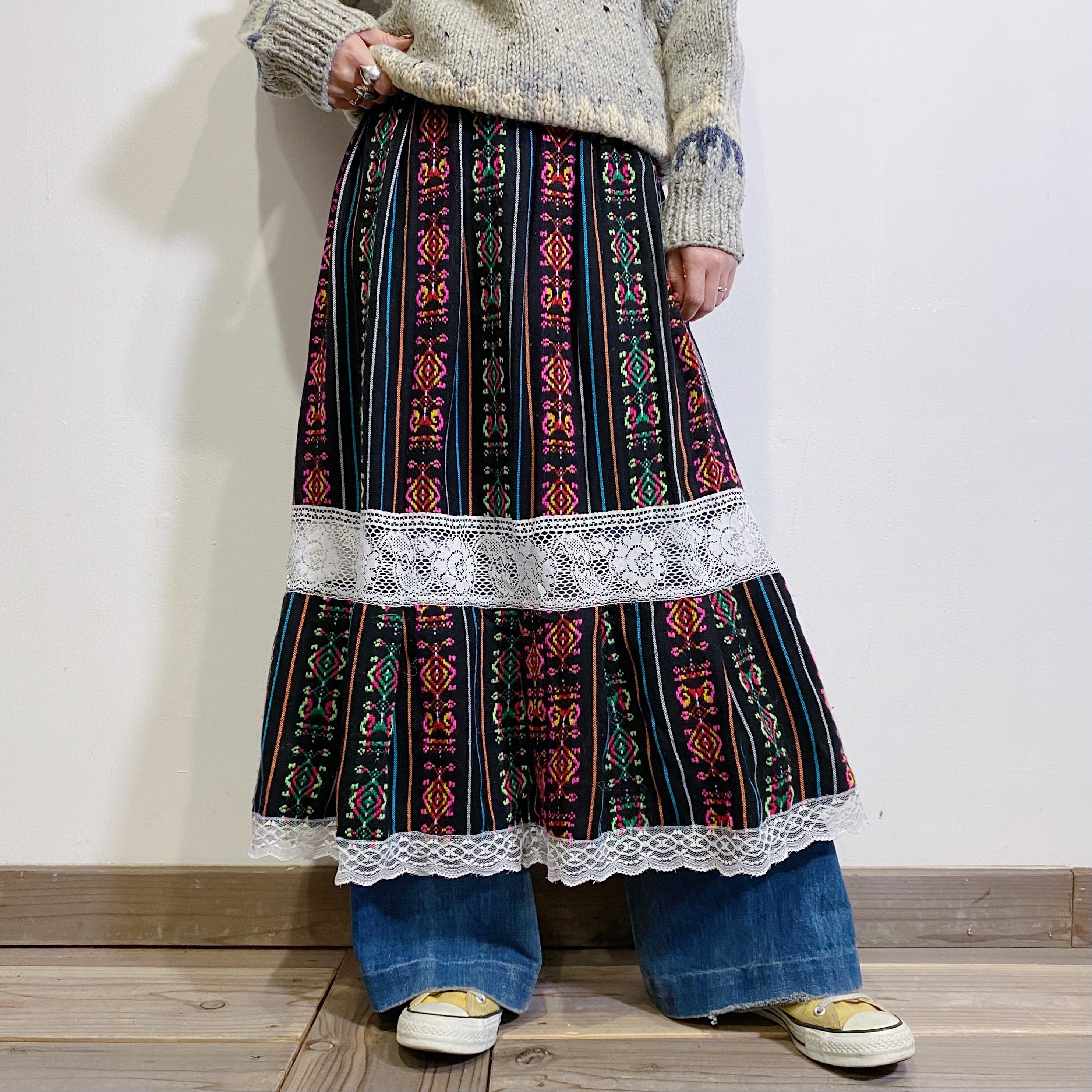 ブラックベースにカラフルなメキシコらしい幾何学模様の刺繍が映えるスカートです。