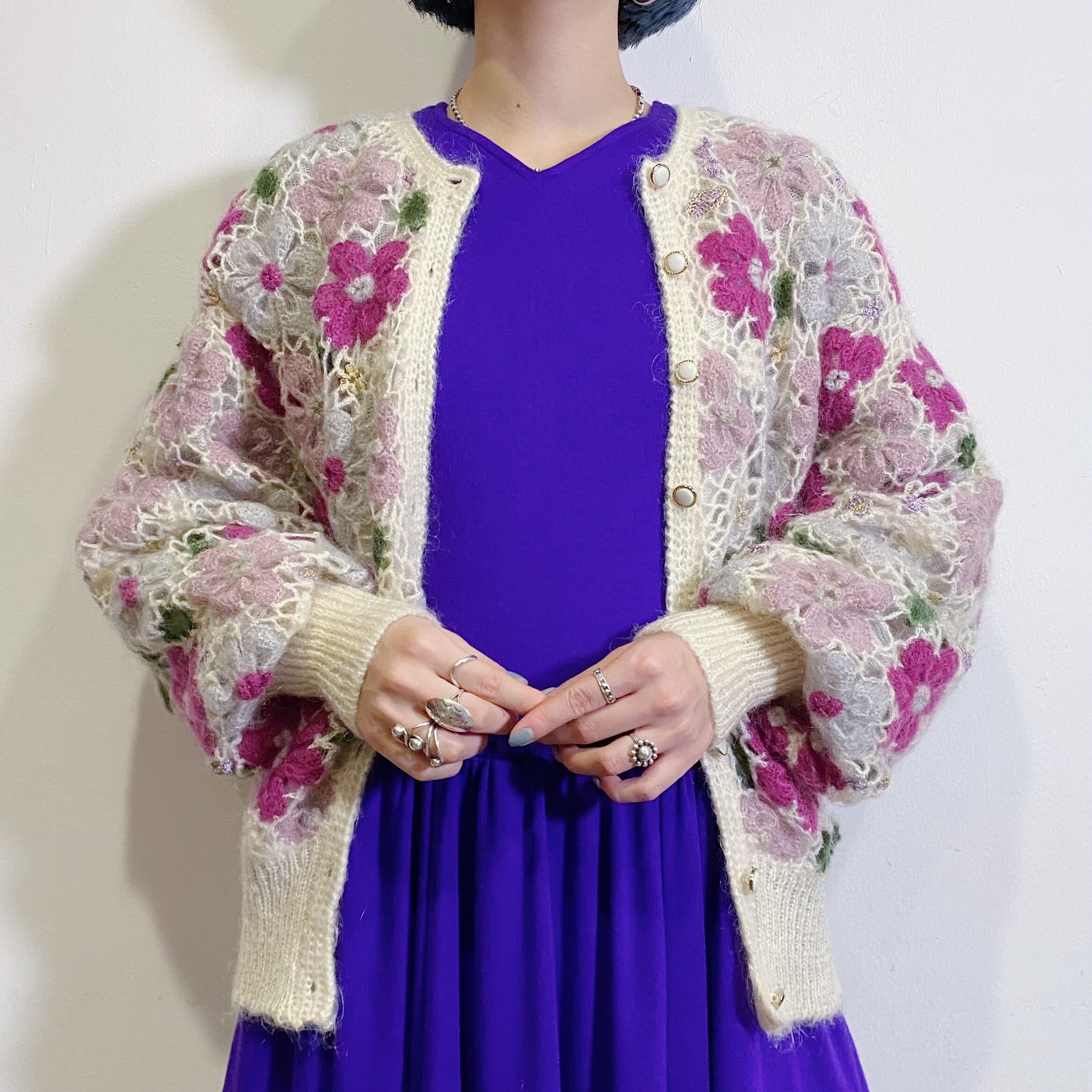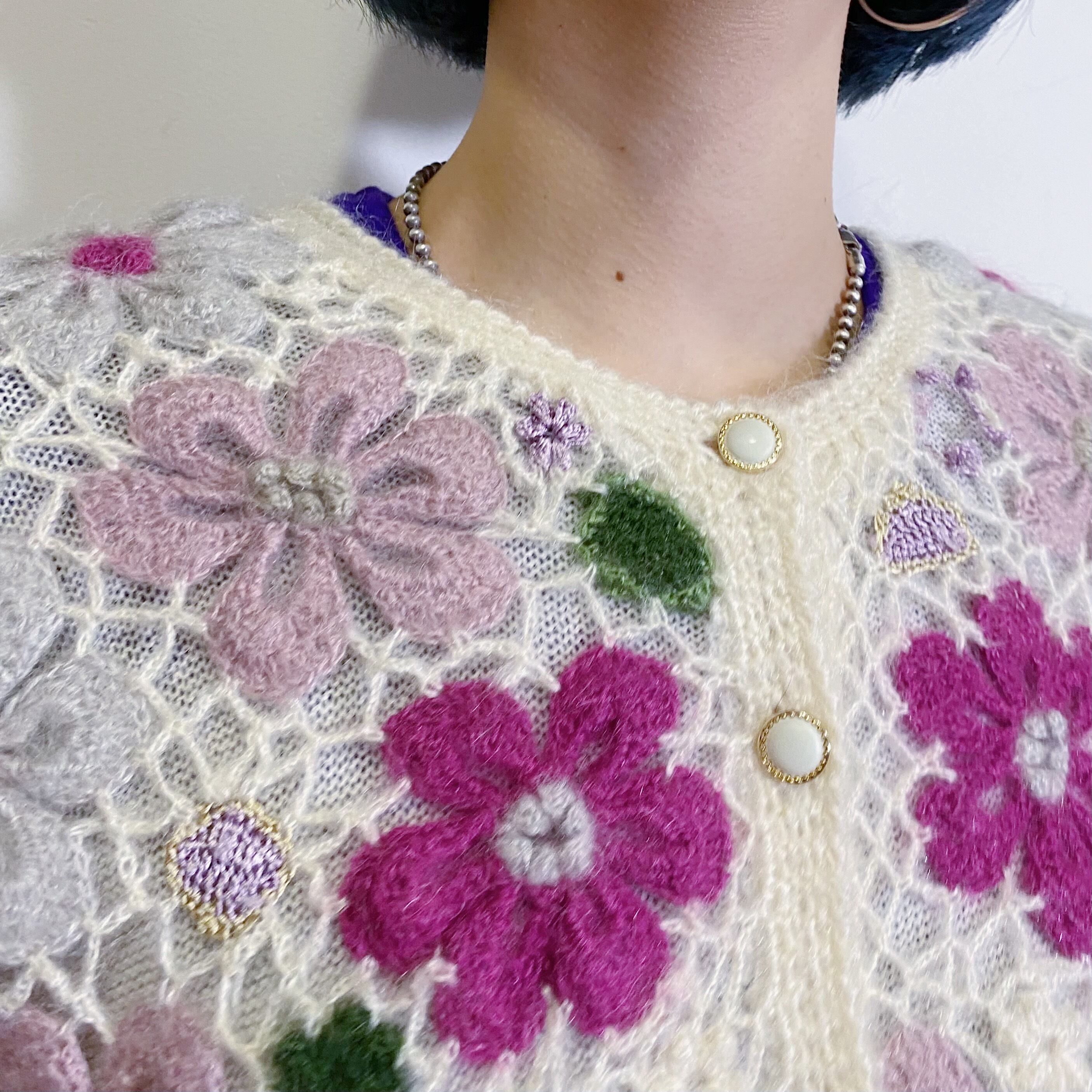 淡い紫カラーとお花モチーフのカギ編みが可愛いカーディガンです。