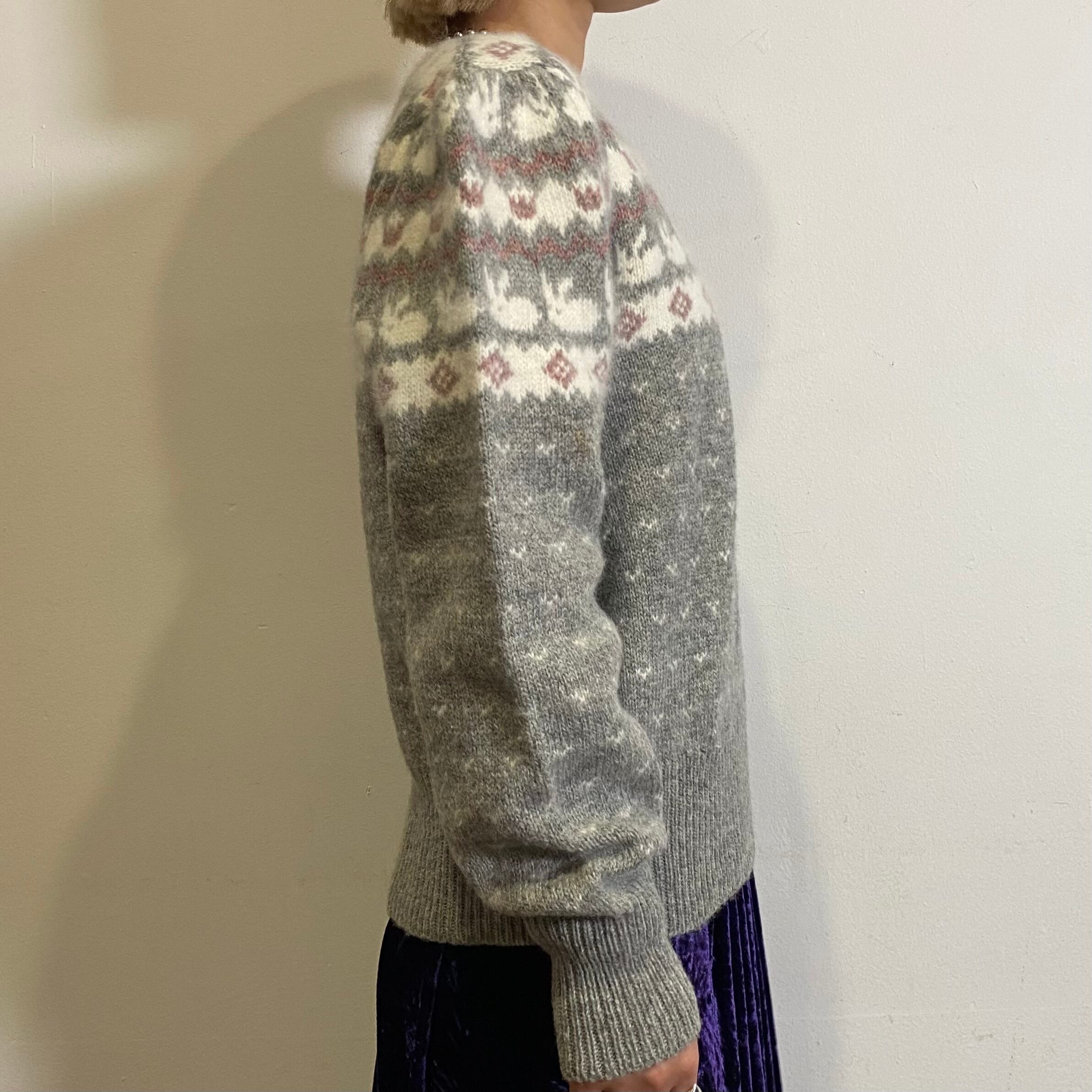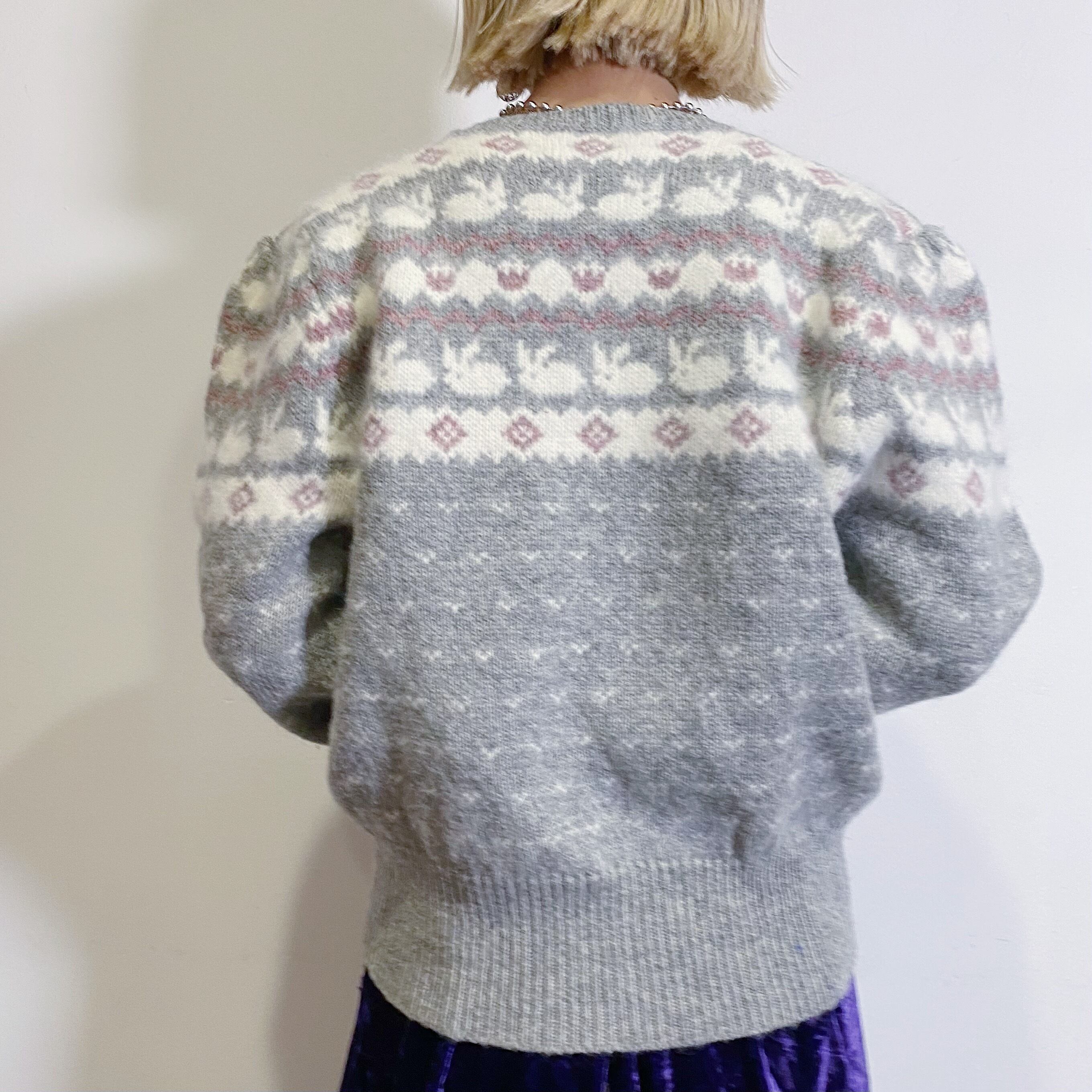 ウサギやお花や雪の結晶がたくさん並んでいるのがかわいい、ウールニットセーターです。