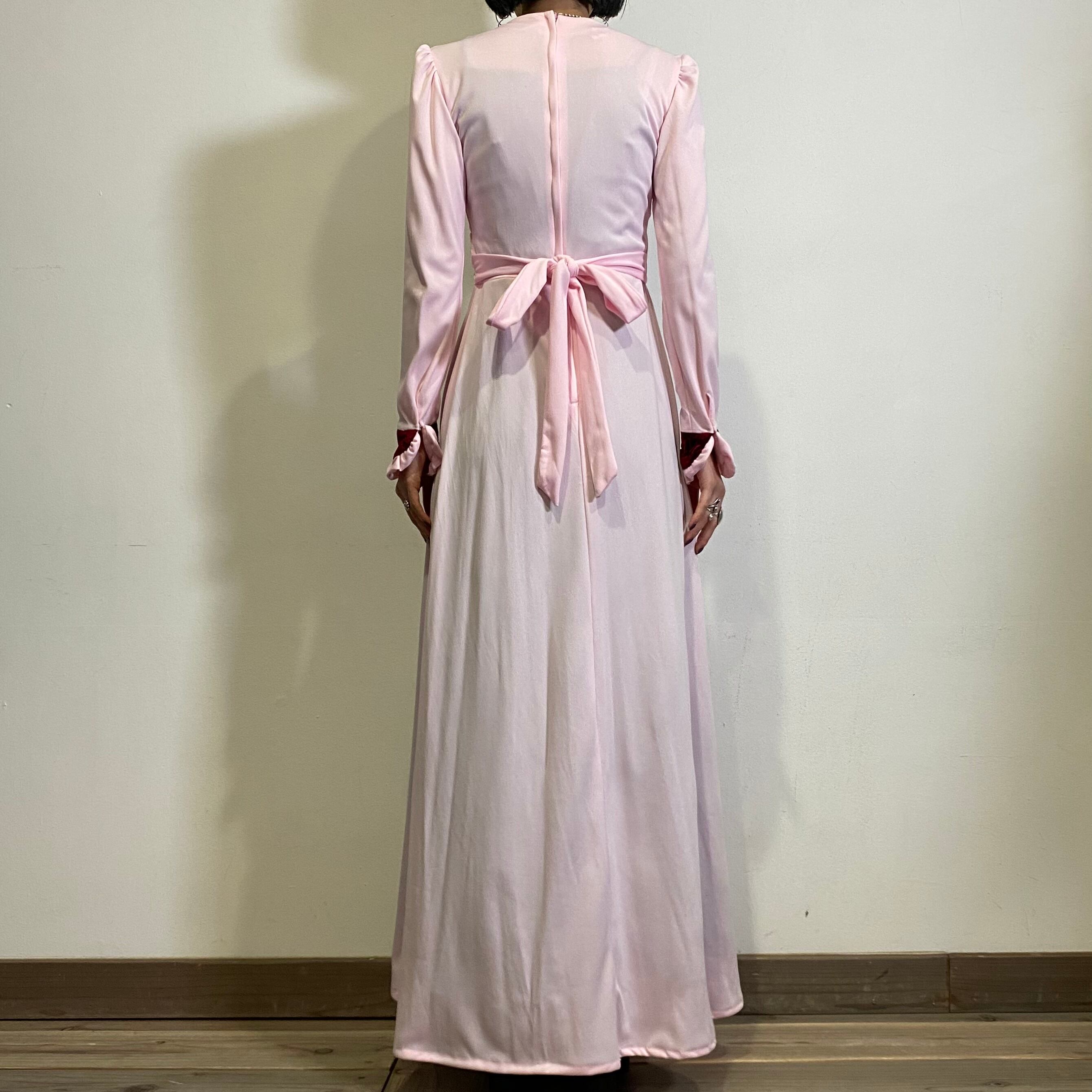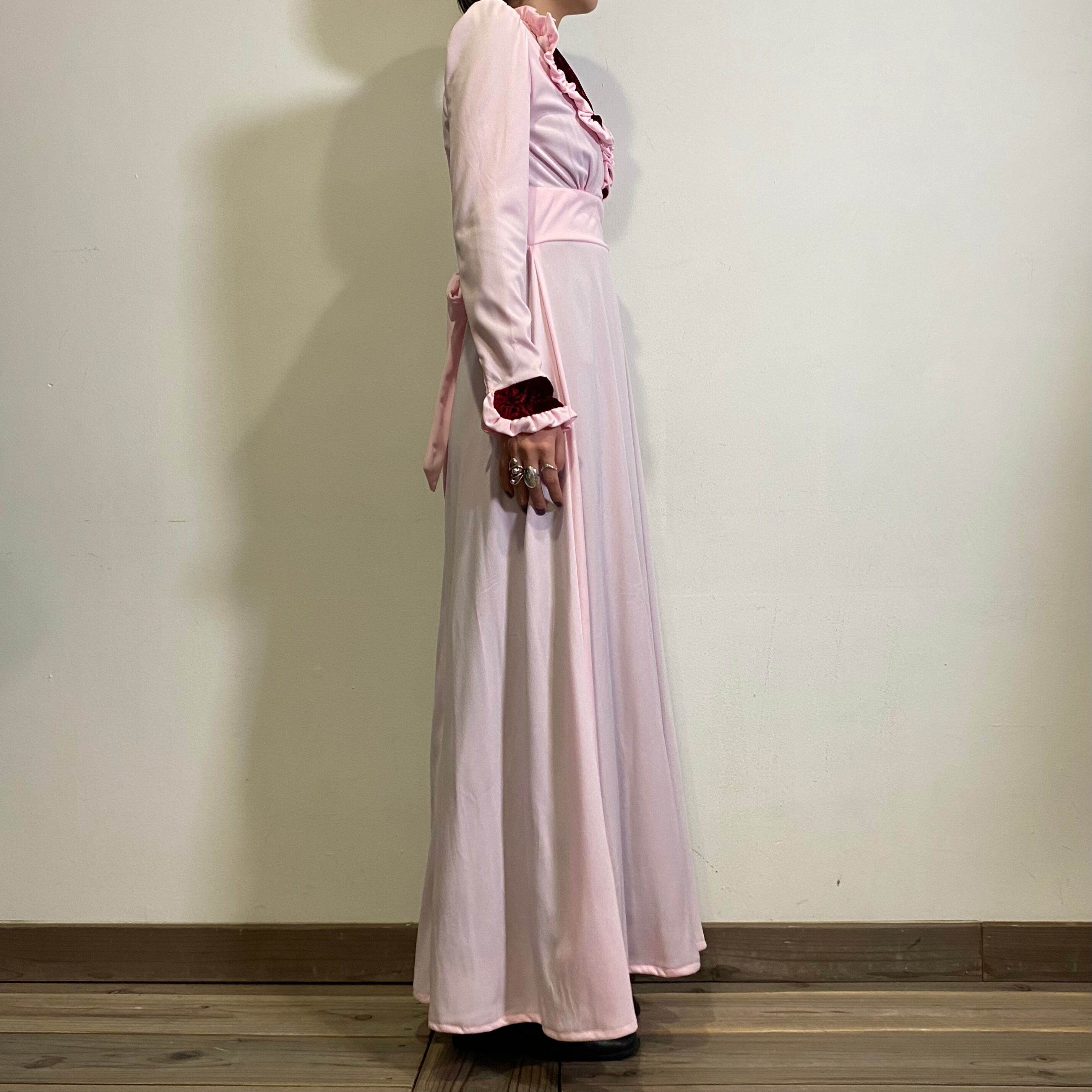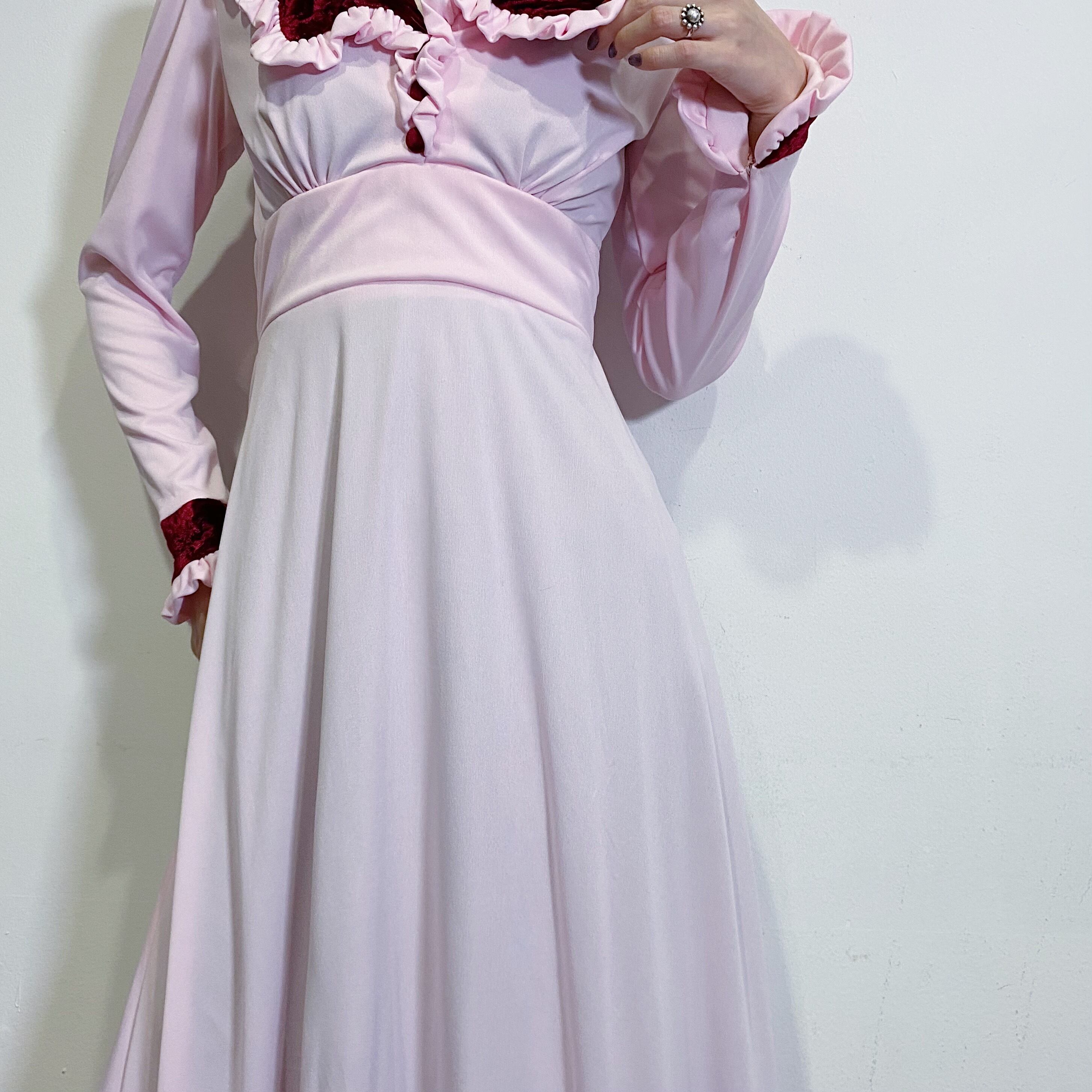 襟とお袖のベロアとフリルがとってもかわいい、70年代のロングワンピースです。