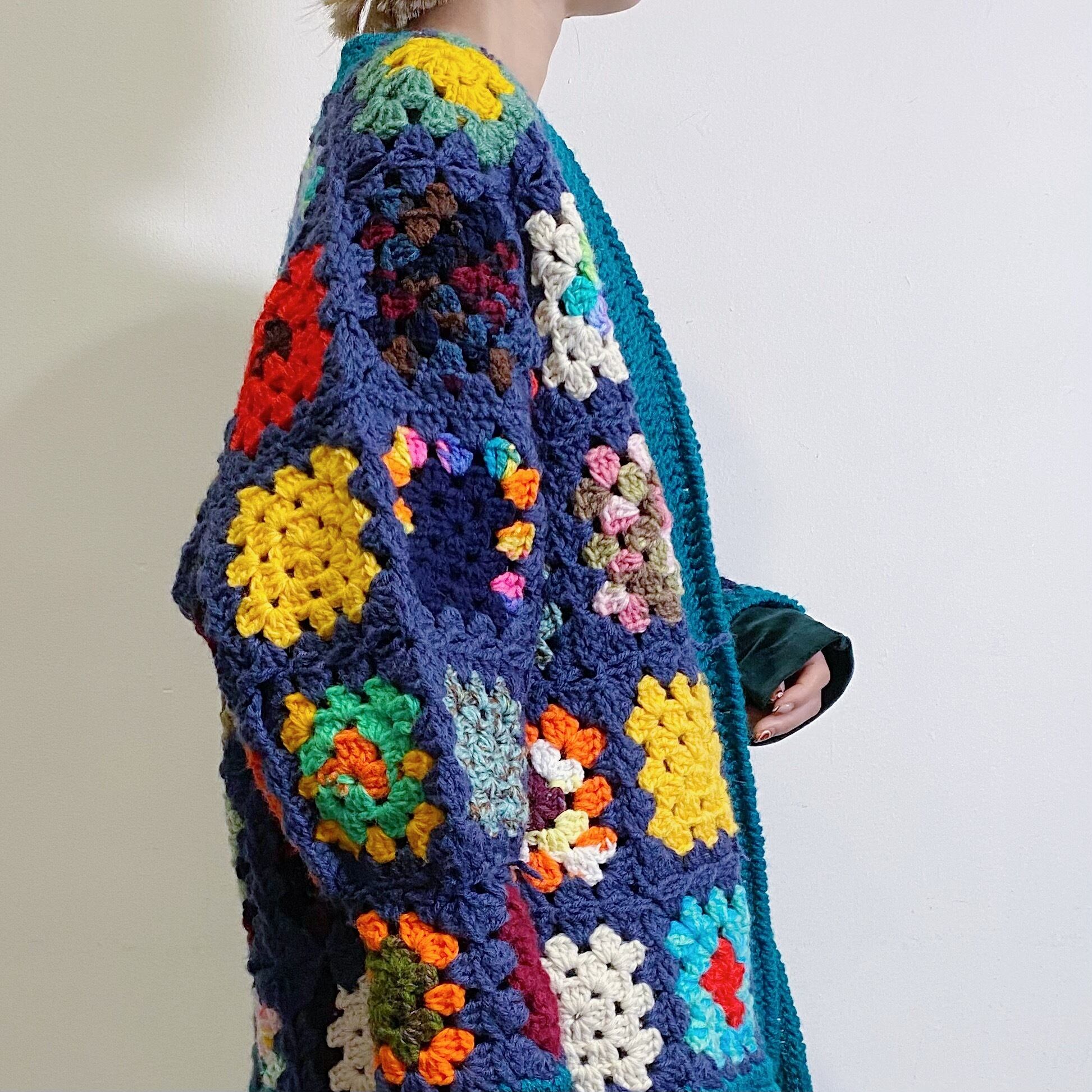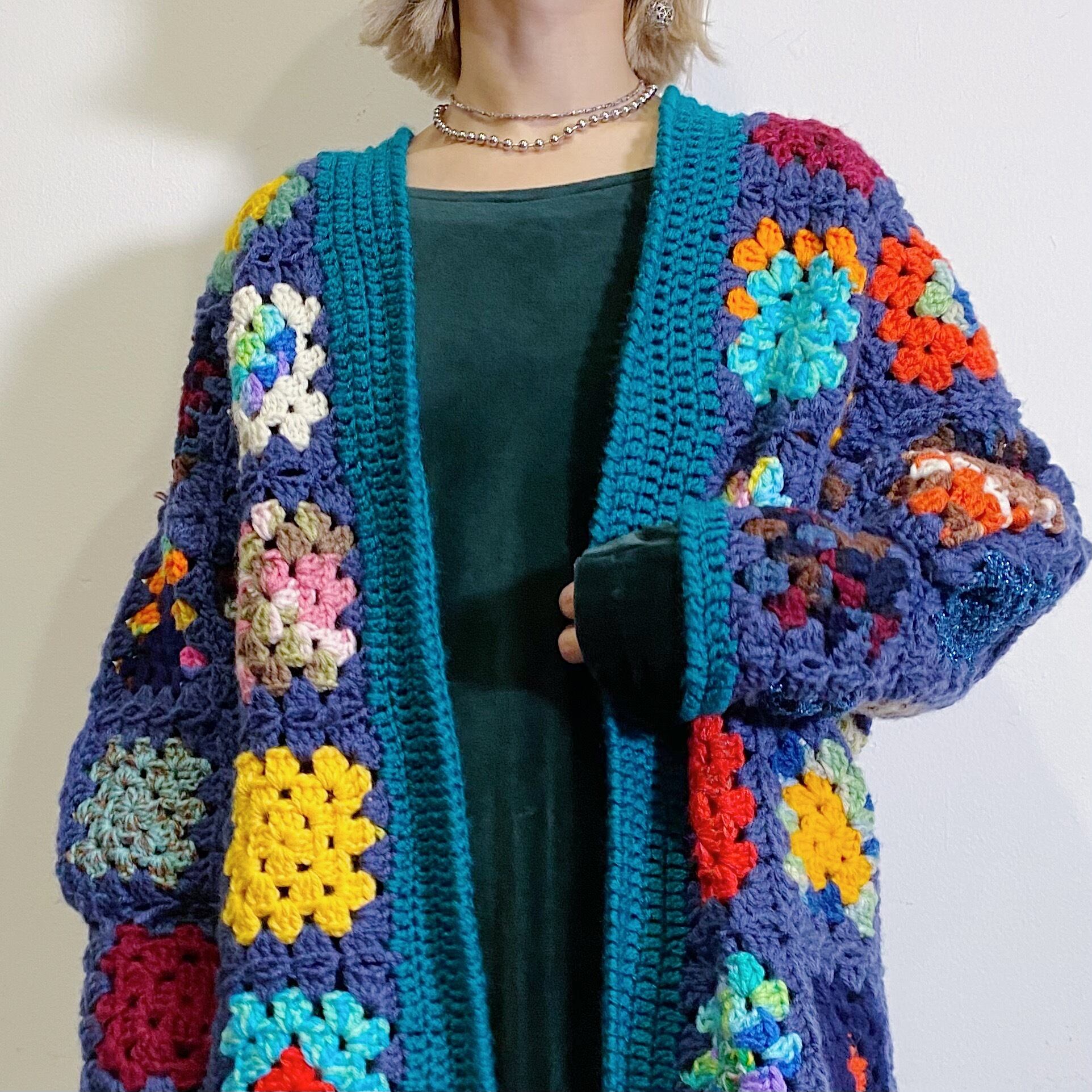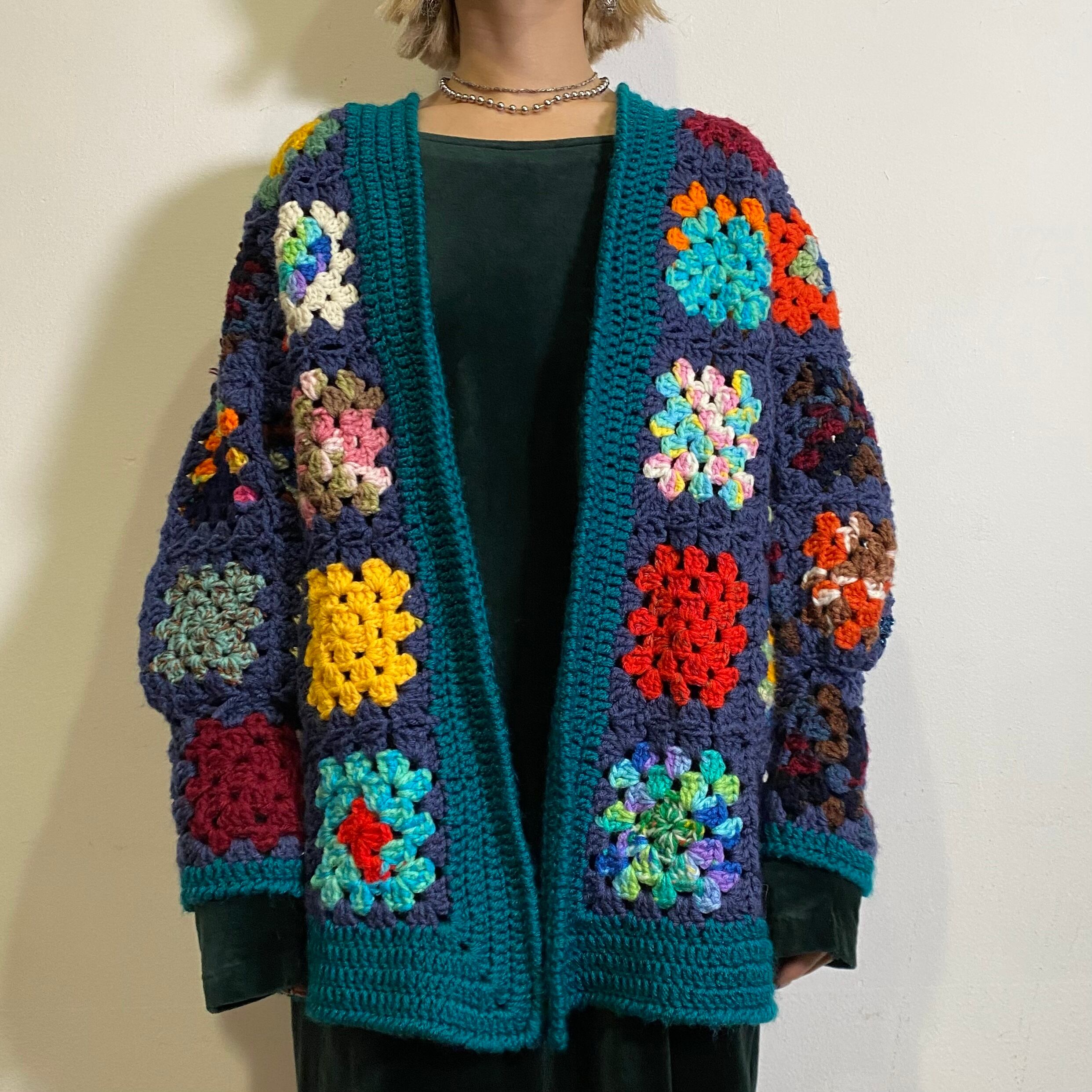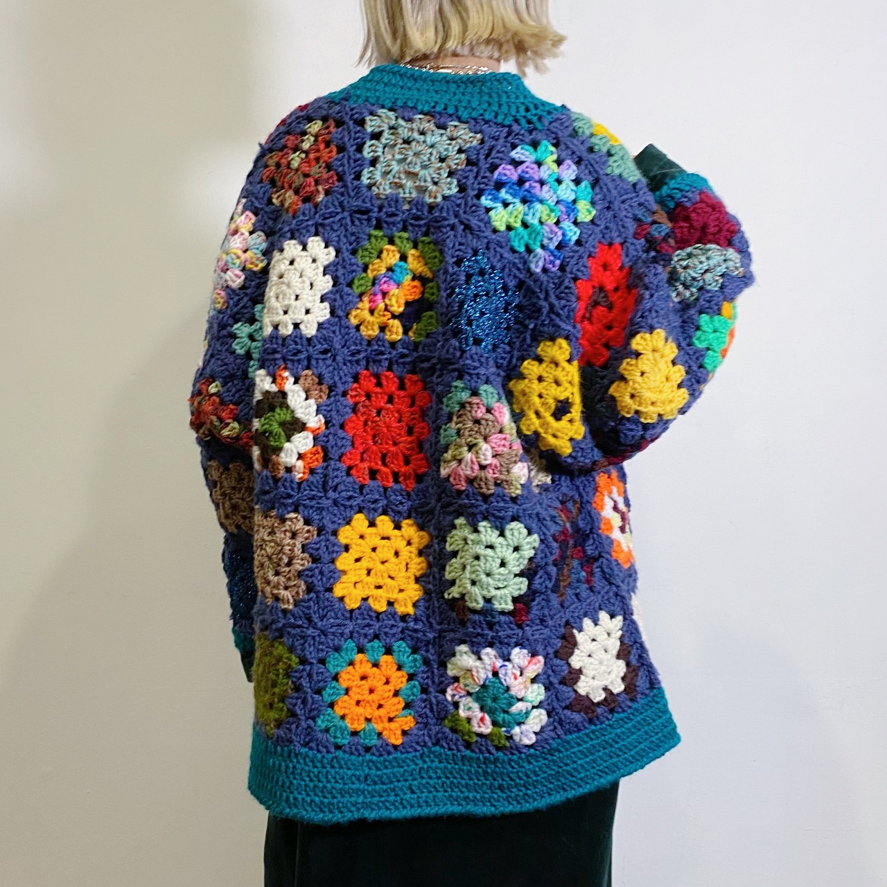 ブルーベースにカラフルな色合わせが可愛い、70年代のグラニーニットカーディガンです。