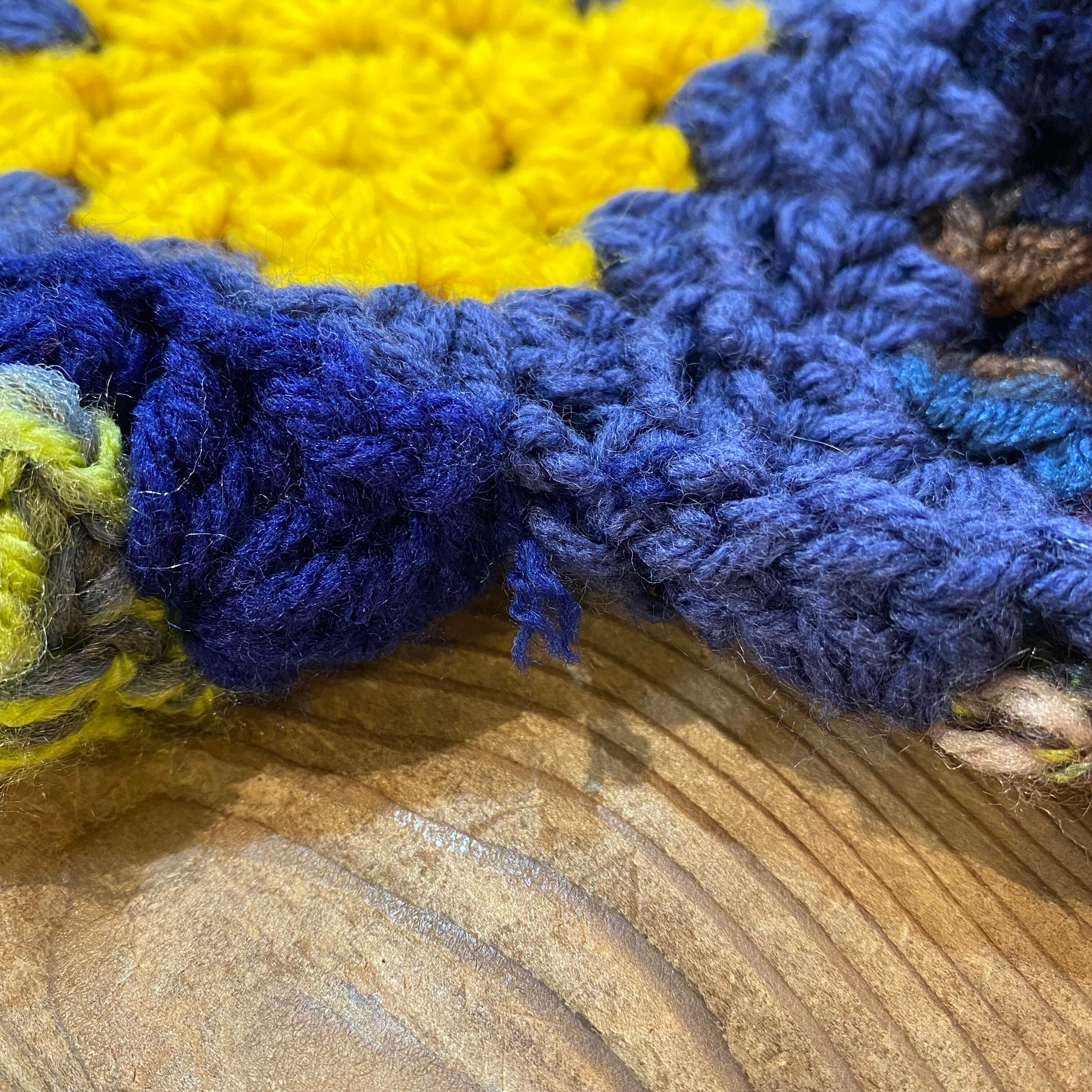 落ち着いたブルーベースにカラフルな毛糸やラメ糸などが沢山編まれた、なんともハッピーでキュートな一枚。
