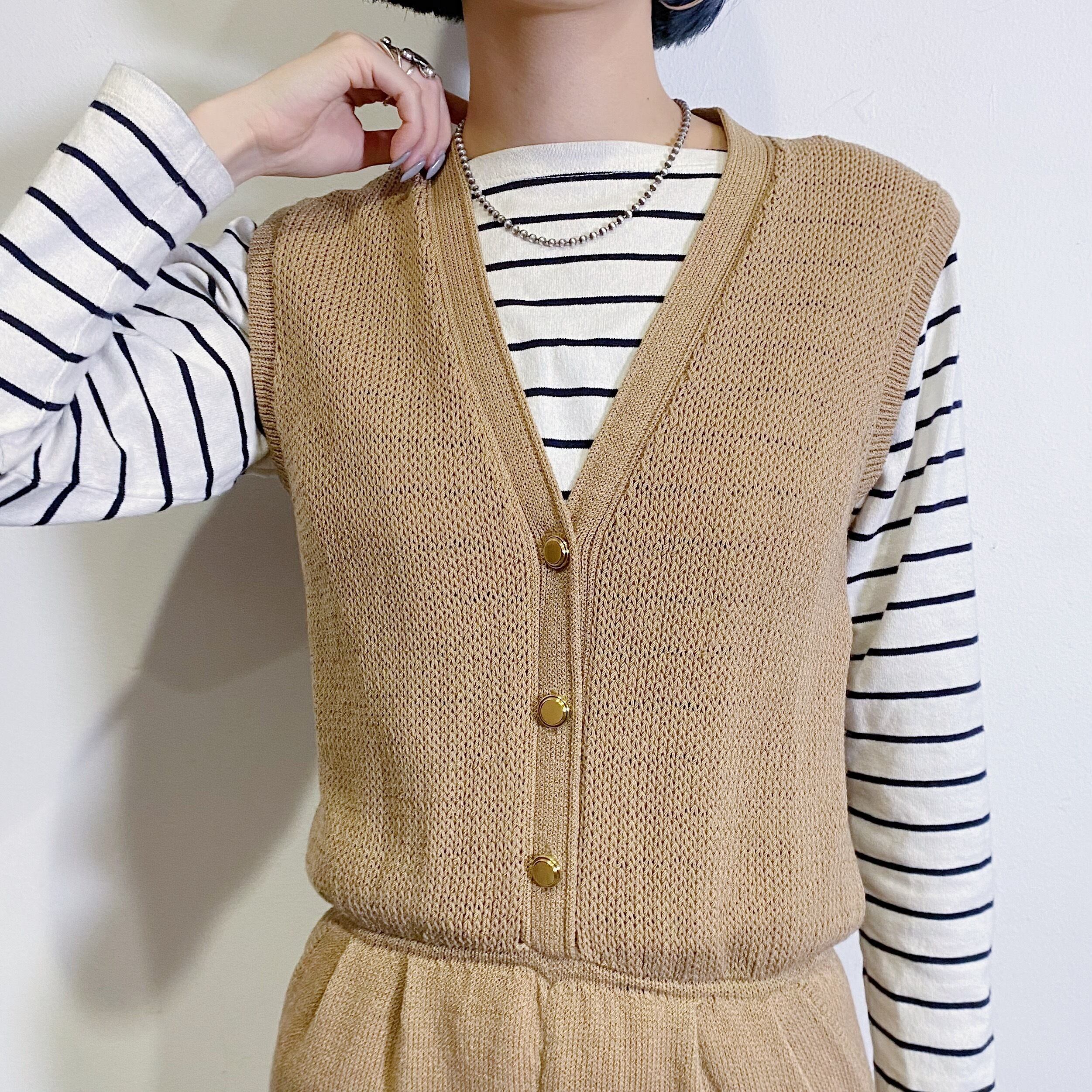 ベージュカラーで使い勝手の良さそうな、ニット素材のジャンプスーツです。